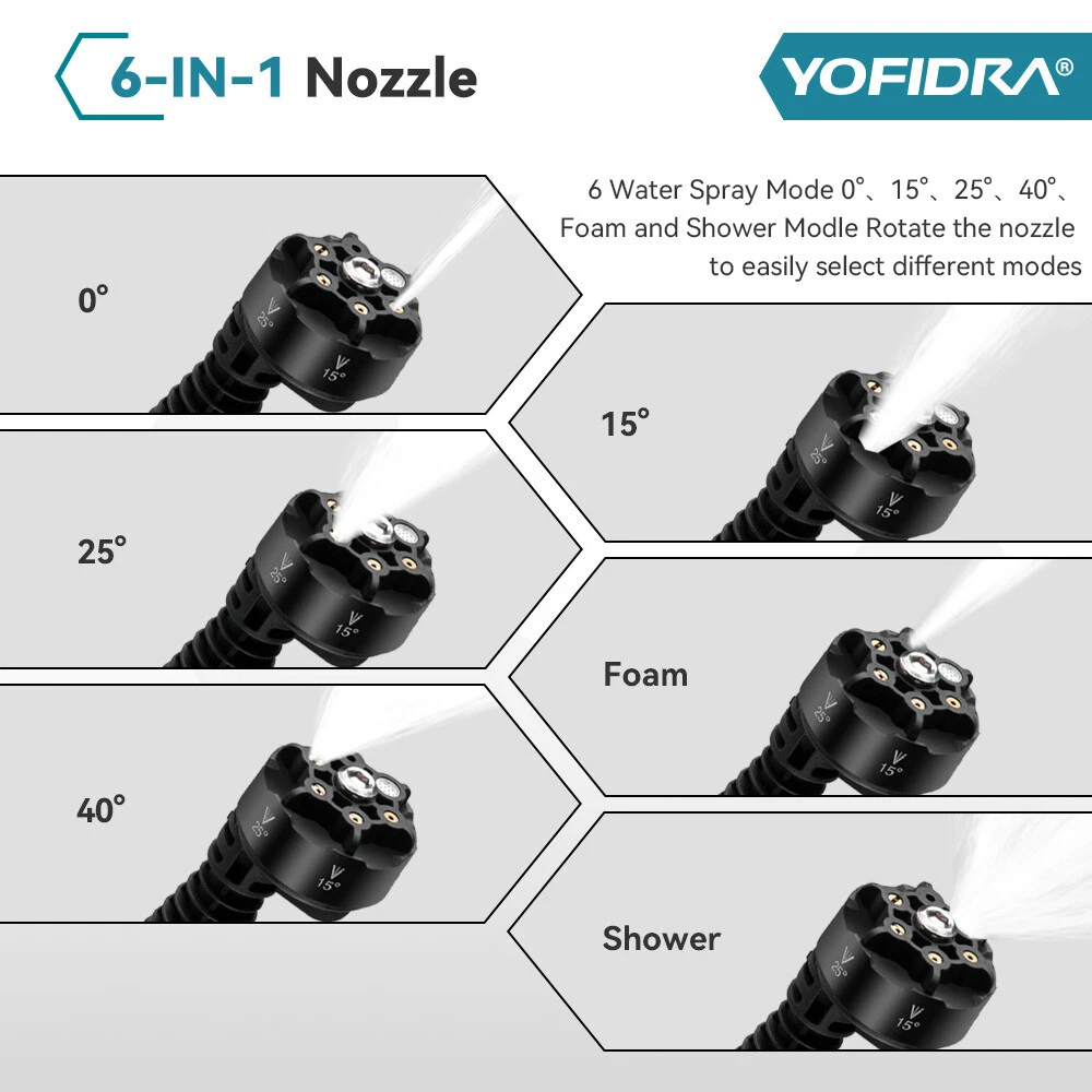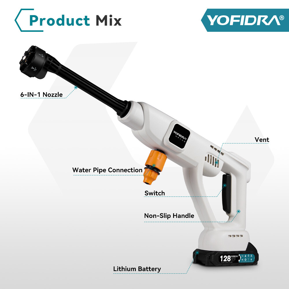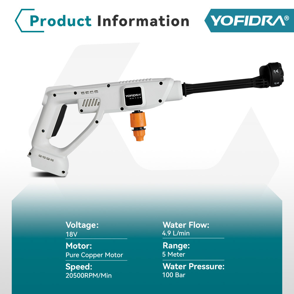 Type: Cold Water Pressure Washer Voltage: 18 V Brand: Yofidra Power: 1200 W Product pressure: 100 Bar Water flow: 4.9 L/min Power Source: Battery Items Included: Battery, Charger, Gun, Hose, Water Inlet Filter, Foam Fot, 6-IN-1 Nozzle Features: Cordless, Lightweight, Water Inlet Filter gtin13: Does not apply Color: White Type 1: Water Pressure Washer UPC: Does not apply