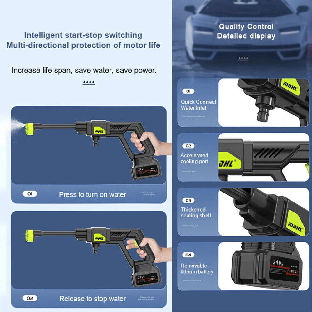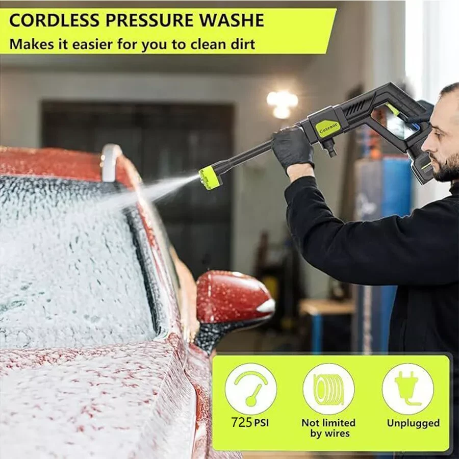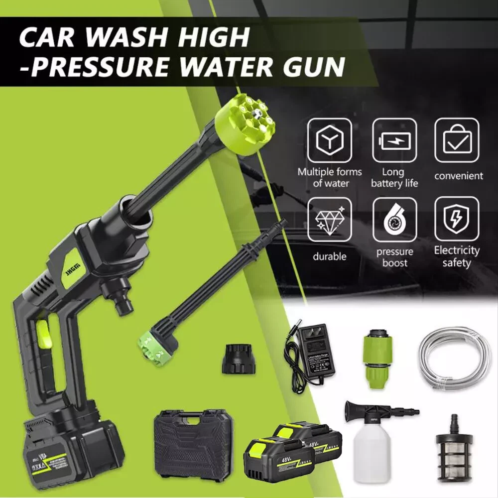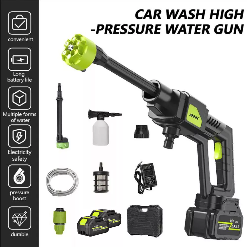 Features : 【Upgraded brushless motor】: Most cordless pressure washers use brushed motors for it ,we use brushless motors .brushless motor is upgrade motor ,it has higher efficiency and controllability, longer working life ,save electric power , brushless motors lack brushes and physical commutators, they require less overall maintenance .and its cost is also much higher than brushed motor. 【Multiple Spray Patterns】:The battery powered pressure washer is equipped with adjustable nozzles from 6in1 nozzles and foam sprayers. You can turn the nozzle freely according to your cleaning needs. Easily removes all kinds of stubborn stains. Suitable for a variety of scenarios, including vehicle cleaning, exterior wall and floor cleaning, window and door cleaning, etc. Foam bottle attachment for quick foaming to easily remove stains from vehicles and windows. 【POWERFUL BATTERY】:Powered by 2 21V batteries, it is not limited by wires, very convenient to carry outdoors. One charge can provide up to 30-50 minutes of uninterrupted cleaning experience. 【Draw Water from Anywhere】: The portable pressure washer with a 16.4FT hose that makes it easy to take water from any source, so it's suitable for rivers, pools or buckets. It can also be connected to a faucet. The hose is equipped with a filter that effectively filters out particles, waste leaves or sludge, making it easy to draw water from buckets, pools, rivers or any water source. 【Versatile Use】Widely used for cleaning vehicles, bicycles and boats. The portable electric cleaner is also perfect for a variety of cleaning tasks in the home and garden. It effectively waters plants, cleans walls, floors, bathrooms, swimming pools, doors, driveways, fences and hard-to-reach corners. Specification : Product name: Wireless High Pressure Car Wash Washer Gun Motor: Brushless Motor Material: ABS and copper Power Supply:Lithium battery Battery capacity: 12000mAh(Note: A single battery is 1200mah, a total of 10 batteries are connected in series and parallel) Power:300W Rated voltage:21V maximum voltage:48V Product pressure: 30Bar Drive: Lithium battery wireless drive Spray type of water gun: 6-IN-1 Multi-Function & Rotatable Spray Nozzles Jet stroke: 6-12 meters Water pipe length: 5 meters Car washing equipent type: household car washing machine Water source type: Bucket / Faucet Self-priming Scope of application: car washing, watering flowers, watering vegetables, spraying, garden cleaning, etc. Package included: 1x Wireless car washing machine 1x Lithium battery 1x Charger 1x 5m Water pipe 1x 6-in-1 nozzle 1x Filter 1x Foam pot 2x Adapter