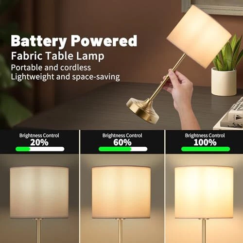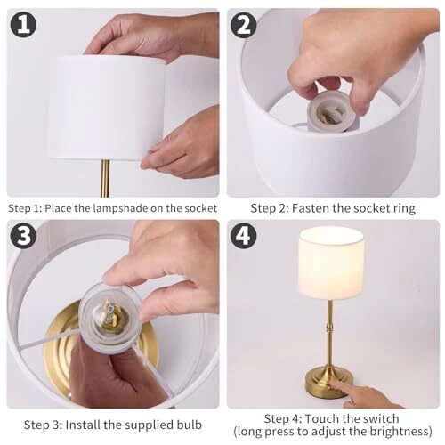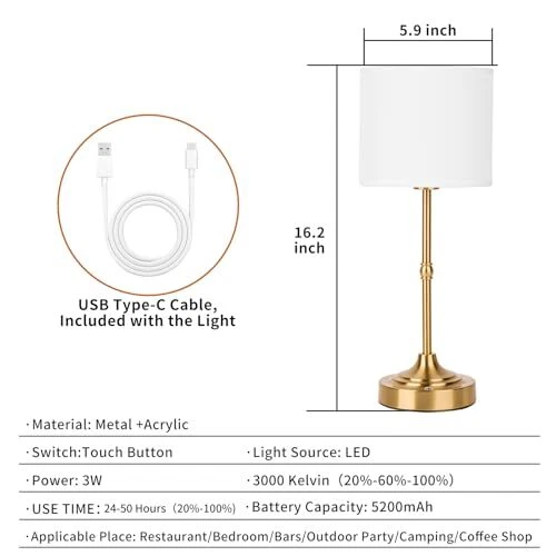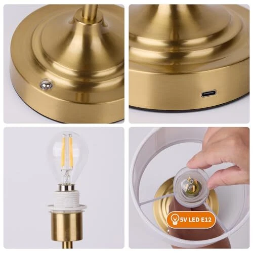 30 Days Return Policy Fast Delivery Trusted seller Portable Cordless Table Lamp,Built-in 5200mAH Rechargeable Battery, Dimmable Touch Small Bed Side Metal Desk Lamp,Restaurant/Bedroom/Bar/Coffee/Night Light/Camping (Gold) Product Description ?[ Cordless Retro Table Lamp ] - Rechargeable Retro Table Lamp with Unique Design is portable, you can always pick it up and place it on a console or side table w t is no power outlet. The cordless feature is a great way to accent your home décor and bring convenience to your daily life. ?[ Stepless Dimming] - LED vintage table lamp with built-in 5200mAH rechargeable battery, one bulb is included in the package, you can use it after installing and fully charged. You can control the switch by flicking, or long press to change the brightness, providing 5W 3000K soft and comfortable warm light, adjustable from 5-100%. ?[ Portable Cordless Charging Desk Lamp ] - The charging lamp has a built-in USB Type-C port for easy charging. Fully charged cordless desk lamp can be used for about 8-24 hours in the brightest state, and about 24-40 hours in the darkest state (Tip: Red light means charging, green light means full). Please charge continuously for more than 5 hours to ensure optimal power. ? [ A perfect gift idea ] - Our touch light lamp can match a variety of scenes and styles while making a great gift. It can be used as an ambient light for Thanksgiving, Christmas and birthday parties. The rechargeable cordless led table lamp is suitable for bedroom, bedside table, office, restaurant, cafe, bar, hotel, outdoor patio light. ?[ Quality Service ] - Stylish LED Desk Lamp, suitable for self-use or gift for friends and relatives. If you have any questions after receiving the package, please feel free to contact us, we are happy to provide you with technical help and give you a satisfactory solution. Home decor lamp. Shipping Returns Payment Shipping Shipping is FREE to all addresses other than APO/PO boxes in the lower 48 states. All our stock ships from US-based warehouses. Shipped via USPS or UPS (depending on location and package weight) Unless stated otherwise, all orders will ship within 24-72 hours of your payment being processed. Check our feedback to see the great reviews of FAST shipping we offer. Returns As our valued customer, we will do our best to make sure the product you receive arrives to you on time and as expected. If you are not satisfied with your purchase, please contact us within 30 days of receiving your order to process a return. Payment We currently accept payment via eBay managed payments only. Once payment is cleared, we will dispatch your shipment within 1-3 business days. Please refer to the "Shipping" tab for more information regarding shipping speed to your destination.