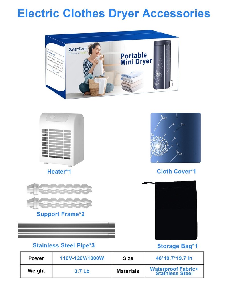 Portable Dryer, 46Inch-1000W Portable Clothes Dryer for Apartments, Portable Dryers Machine with Storage Bag, Mini Clothes Dryers for Travel, Home, RVs Product Details Material Type: Apartment Dryer Brand: KASYDoFF MPN: V5 UPC: 661336206315 EAN: 0661336206315 Brand: KASYDoFF Form Factor: Freestanding Access Location: Top Load Capacity: 28 Pounds Color: Blue Brand Name: KASYDoFF Model Info: V5 Item Weight: 4.36 pounds Product Dimensions: 19.7 x 19.7 x 46 inches Item model number: V5 Capacity: 28 Pounds Installation Type: Freestanding Part Number: V501 Form Factor: Freestanding Special Features: Easy to Install, Foldable, Portable, Quiet, Travel Color: Blue Access Location: Top Load Voltage: 110 Volts (AC) Wattage: 1000 watts Door Hinges: Front Load Certification: UL Material Type: Apartment Dryer Included Components: Bag Batteries Included?: No Batteries Required?: No Date First Available: November 5, 2020 KASYDoFF Portable Clothes Dryer: The portable dryer has one-touch start and time adjustment, with 1000W super power and a timer for 1- 6 hours. Saving energy and ensuring your clothes are perfectly dry without overdoing electric dryer. Portable Clothes Dryer Rack: Crafted with exceptional quality, the portable dryer machine for clothes can hold up to 28 pounds or more. Say goodbye to the hassle of multiple drying cycles, it effortlessly accommodates a family's clothes. Portable and Space-Saving: This portable clothes dryer can be folded and stored in the bag that comes with the product. Its compact design makes the mini dryer easy to store when not in use. Make sure the small dryer doesn't take up your daily space. Ideal for Any Living Space: Experience the freedom of drying your clothes anywhere. This portable dryer seamlessly fits into various environments, whether it's your apartments, dorm,RV, or a vacation spot. This portable dryer is your trusty companion in every setting. Perfect After-Sales Service - Within the span of one year from the date of your purchase, we offer a complimentary replacement service. Should any issues arise with the portable electric dryer in one year, please contact us if you have any questions. Rest assured as you make your purchase.