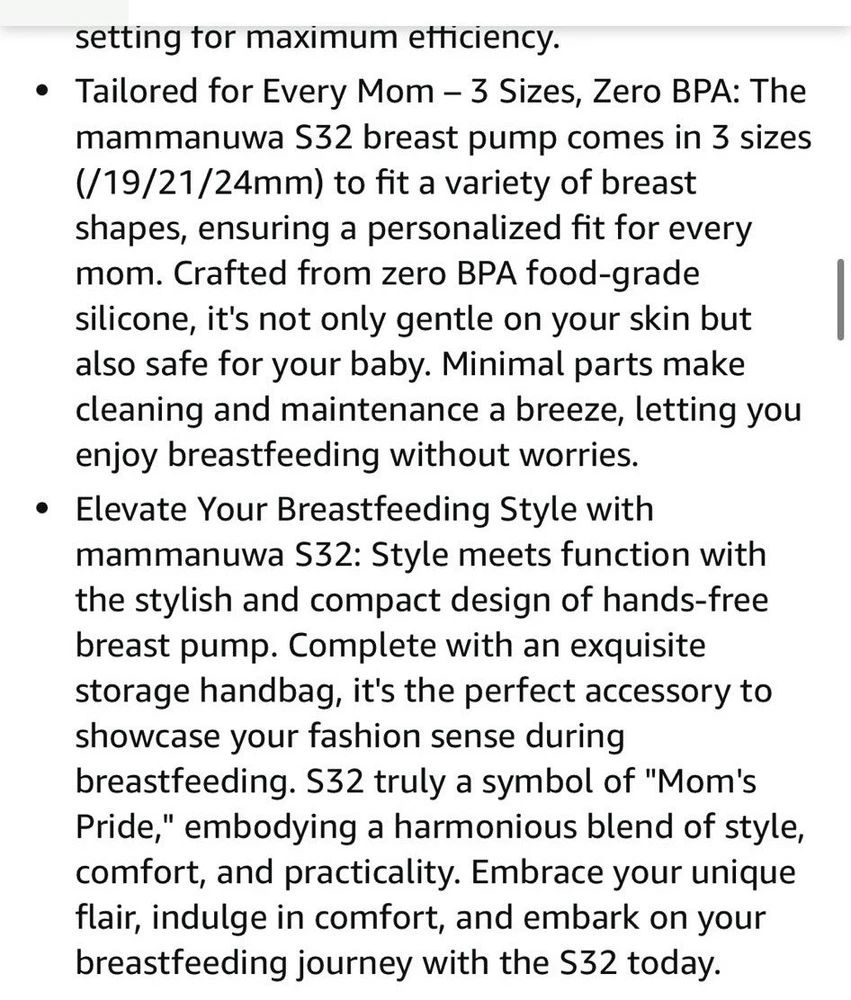 The Brand New Electric Breast Pump by Mammanuwa is a double electric breast pump in white, with a 24mm size and adjustable settings for hands-free pumping. This model, the S32, includes a double pumping kit and operates on battery power for convenience. Designed with low noise in mind, this pump offers a discreet and efficient solution for nursing mothers looking for a reliable breast pump. This product combines functionality with ease of use to meet the needs of modern mothers. It’s Lightweight, Portable, & Hands-Free with Baby Mouth Technology - BPA-Free, 4 Modes, 9 Levels - Elevate Your Breastfeeding Style with Mammanuwa S32