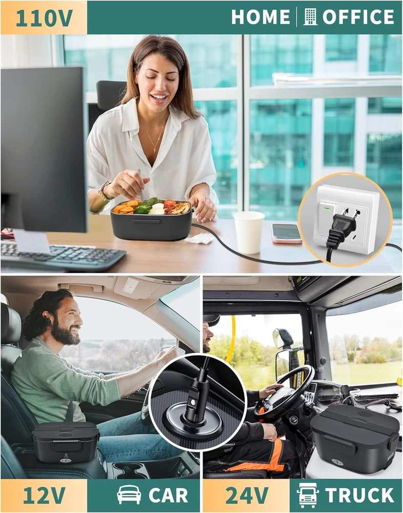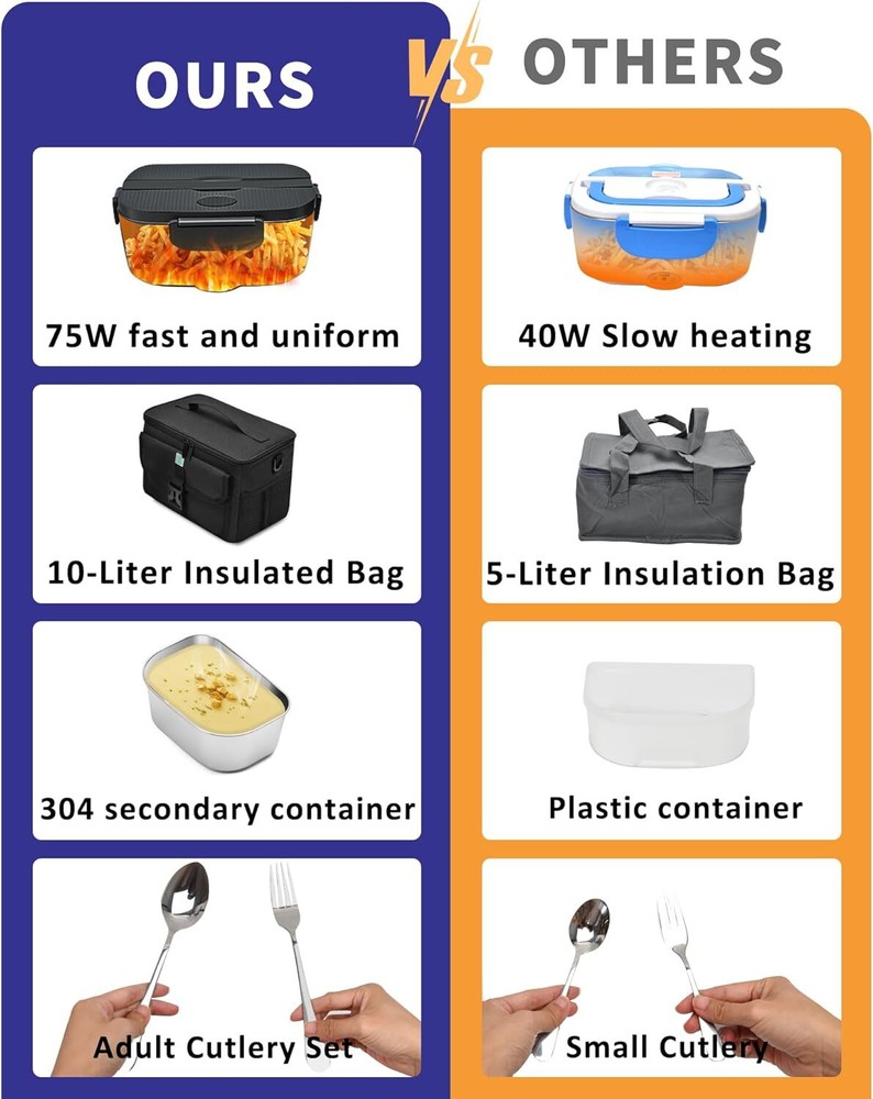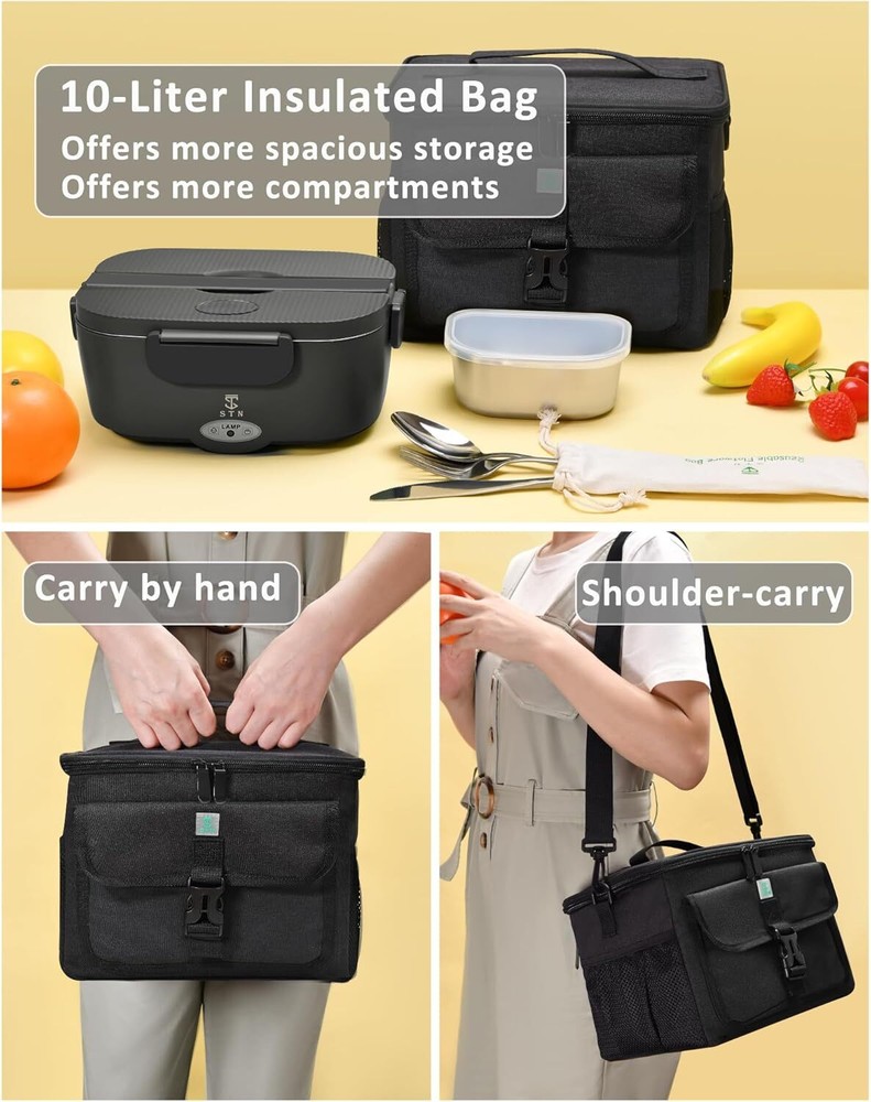 A Lunch Game-Changer: Ideal for busy workdays, this electric lunch box food heater transforms your lunch experience! Enjoy a warm meal at your desk without waiting for the office microwave. While your colleagues spend on expensive sandwiches or cold lunches, you’ll have a hot, satisfying meal for a fraction of the cost. Enjoy Hot Meals On The Road: Our heating lunch box for men and women features a car power cord that works directly in vehicles with 12V/24V, no inverter needed. good for those always on the go during lunchtime. Say goodbye to boring sandwiches and cold lunches—enjoy warm, delicious meals wherever you are! 1.5L+0.45L Stainless Steel Container : including a Stainless Steel 1.5-liter main container and a 304 Stainless Steel 0.45-liter secondary container, both of which are can heating, providing flexibility in your meal options. Large Capacity Carry Bag: Our carry bag provides 10 liters of space, comfortably fitting a lunchbox and extra food containers. It features excellent insulation and includes additional pockets on the outside for storing cables and other small items. Quick and Quiet Heating: Simply plug in our 80W food warmer lunch box 20 minutes before lunchtime, and it will quietly heat your meal without any food odors. Enjoy the convenience of a hot lunch without the hassle of queuing at the office microwave. Food-Grade Materials: Our portable lunch box warmer are crafted from 304 stainless steel and food-grade plastics, ensuring you can enjoy both hot and cold dishes with complete confidence. Every meal is sure to be healthy and delicious! Great for your loved one! Our electric lunchboxe are good for anyone who appreciates a healthy, hot meal on busy days. Whether they're at the office, on the road, or working outdoors, our lunch boxes deliver the comfort of a warm lunch wherever they go. It's a thoughtful way to show you care.