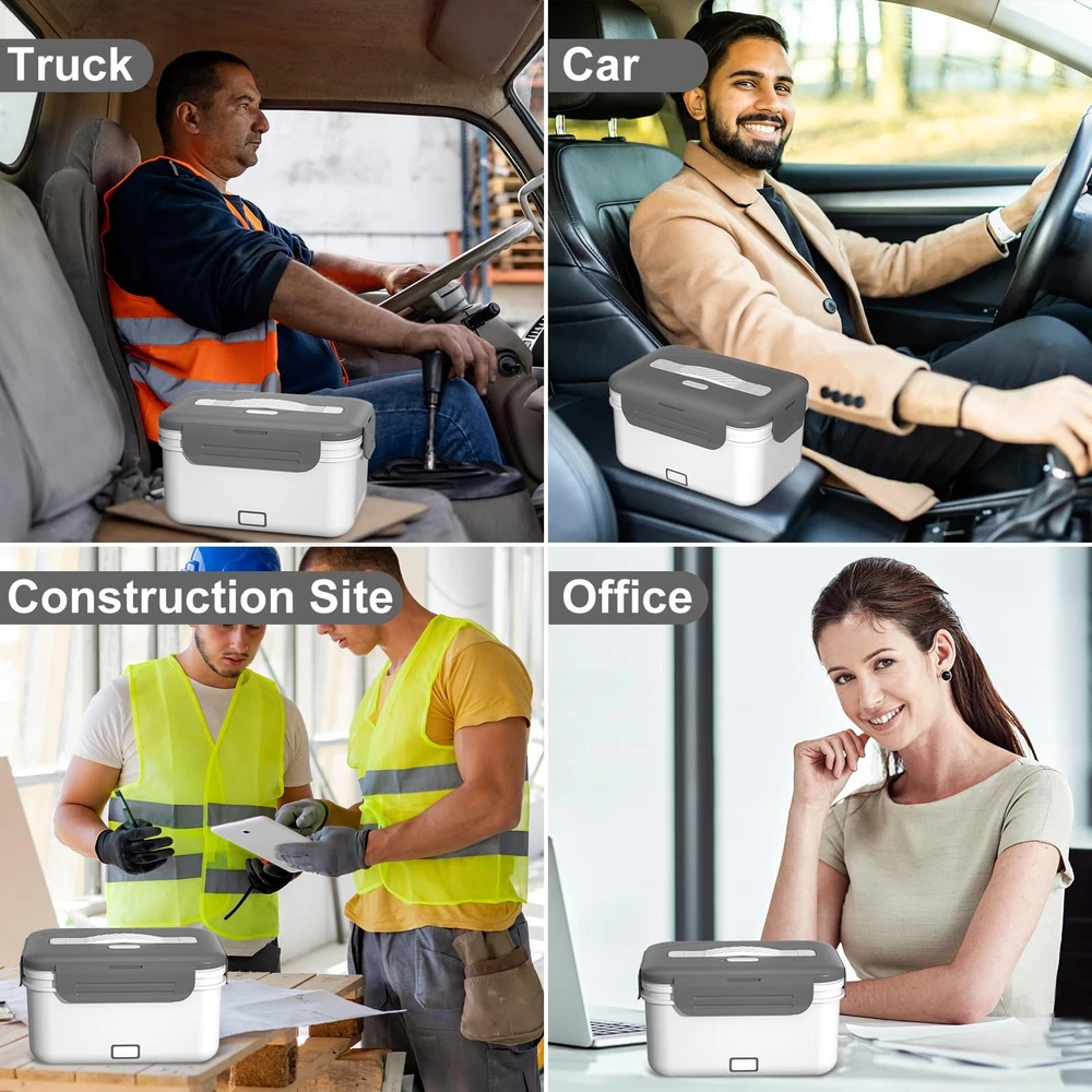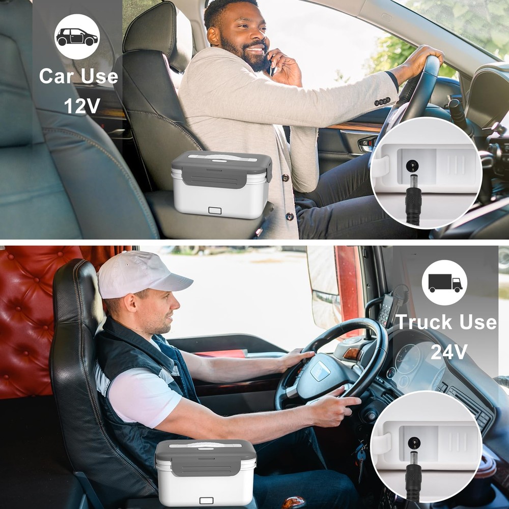 electric lunch box heated lunch boxes for adults loncheras electricas para calentar almuerzo electric lunch box food heater heated lunch box food warmer lunch box portable food warmer heating lunch box for work self heating lunch box lonchera electrica para el almuerzo hot lunch box for adults lunch box warmer portable for work lunch warmer portable for work WARNING: THIS ITEM IS NOT INTENDED FOR USE BY CHILDREN 12 AND UNDER. Large Capacity of 1.8L --- Our heated lunch box capacity is upgraded to 1.8L, up 20% from 1.5L. You can fit more foods like meat, veggies, and staples, great for big - eaters and physical workers to satisfy their hunger. Also, we offer an extra 0.7L plastic container for fruits or sauce. The electric lunch box comes with a bag for easy carrying outdoors. 100W Fast Heating --- With the newly designed PTC constant temperature heating technology and a high power 100W, our electric lunch box food heater features low consumption and high efficiency heat circulation. It can heat your lunch within just 25 minutes while keeping the food moist and fresh. Whether you're in the office, on your truck, or at the construction site, you can enjoy fresh and warm home - cooked meals in no time. (We recommend adding some water to the food for faster and more even heating.) 3-in-1 Electric Lunch Box --- Enjoy fresh and warm home-cooked food anywhere! This electric lunch box for adults can be used with 110V in your home or office, 12V in your car, and 24V in your truck. Whether you're a car/trucker driver always on the go looking to eat healthily or a construction/office worker in need of a hot meal, our heated lunch box is a perfect choice. Compact and Portable --- portable electric lunch box for adults is designed to be travel - friendly and lightweight. It comes with an insulated carry bag that provides excellent protection against heavy rain and dust, keeping your food fresh and clean all the time, making it a great choice for those on the go. Rubber Textured Handle & Spill-Proof Design --- For easy carrying, the electric lunch box's handles are reinforced and have an anti - shedding rubber texture, so they won't break during use. There are four - sided snaps and built - in rubber seals. This double - protection design lets you not worry about soup leakage. Perfect Gift for on-the-go People --- Simply plug it in 20-25 minutes in advance and continue with your work. You'll enjoy warm meals at lunchtime. Ideal investment for busy people who don't have the time or opportunity to eat warm food, including car/truck drivers, office workers without access to a microwave, and anyone who's frequently on the road. Included Spoon and Fork --- We offer complimentary stainless - steel fork and spoon. The size of the spoon and fork is designed according to the shape of the heated lunch box and can be placed in the lunch box. use the complimentary spoons and forks right away when opening the lunch box. For those in various workplaces, no need to carry extra utensils. They can dine easily whether it's a rushed lunch or outdoor meal. Satisfactory Service --- We hope this electric lunch box food heater makes your life better and more convenient. Please if you encounter any problems during use, such as stopped heating, or missing charge cord, and we will provide you with a satisfactory solution.