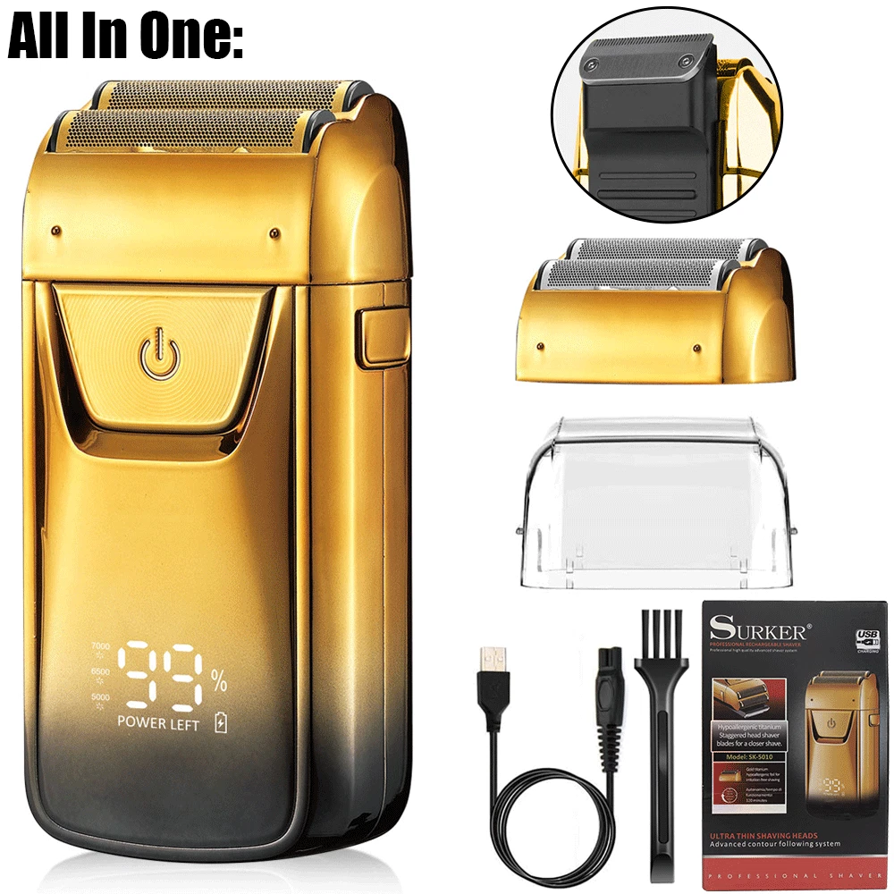 Motor Type: Rotary Body Area: Back, Body, Chest, Ear, Face, Neck, Nose, Pubic Color: Gold Brand: Surker Country/Region of Manufacture: China Features: Adjustable Speed, Built-In Moisturizing System, Cleaning Indicator, Cleaning System, Cordless, Dual Voltage, Folding Blade, Hair Trimmer Option, LED Display, Low Battery Indicator, Pivoting Head, Quick Charging Time, Rechargeable, Replacement Blades, Smartlight, Swivel Cord, Travel Case, Travel Size, Washable, Waterproof, Wet/Dry Head Type: Beard Trimmer Type: Multi-Function Shaver Item Length: 2 in Number of Heads: 2 Model: Razor Department: Men Item Weight: 2 lb Power Source: USB Charging