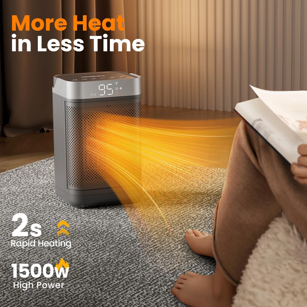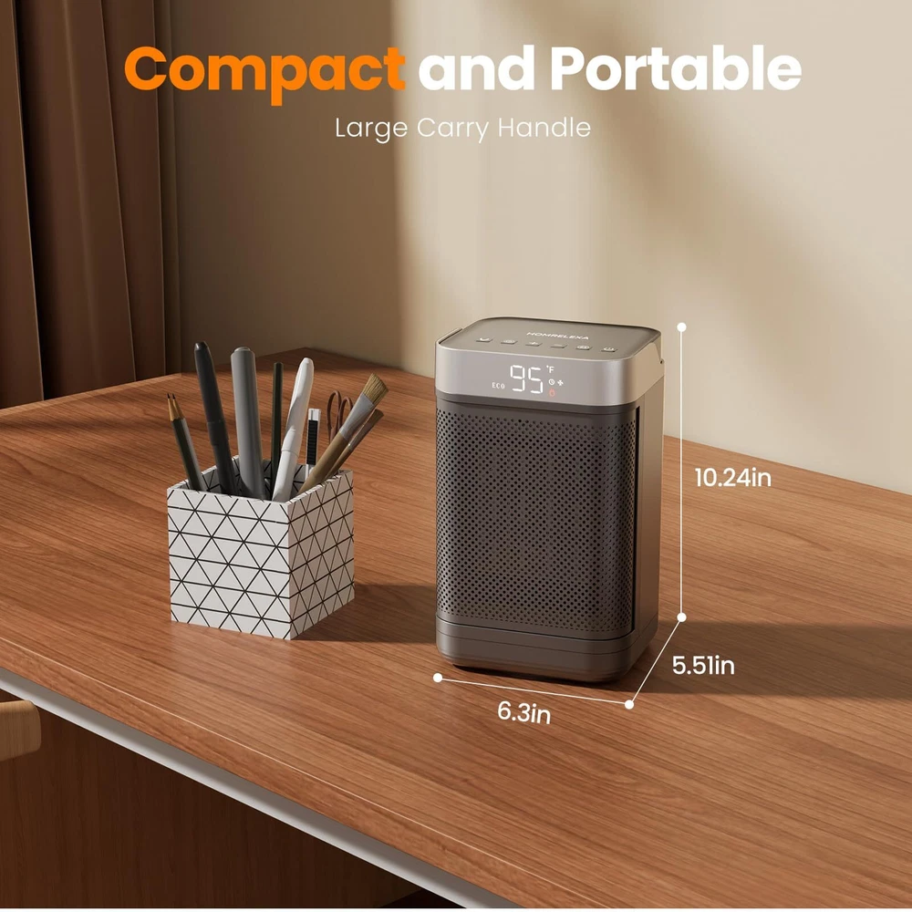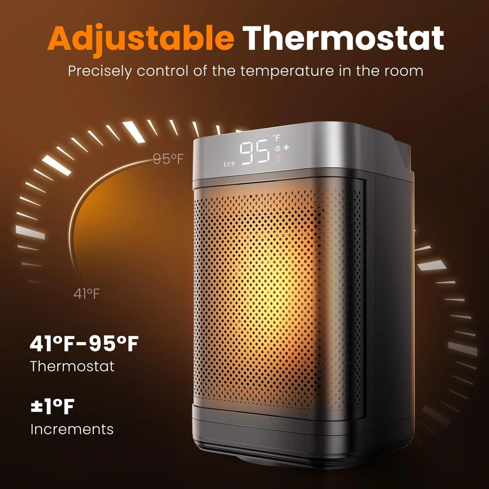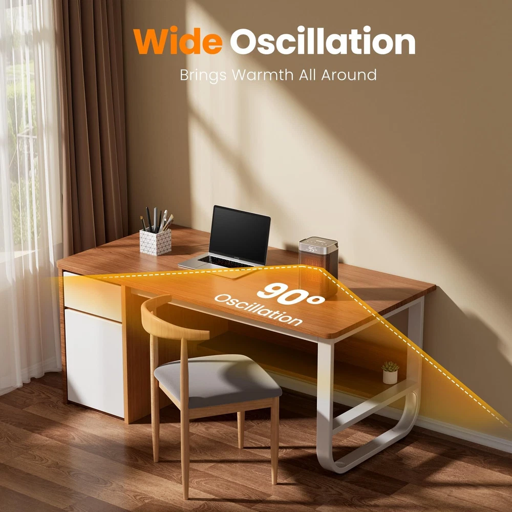 HIGH HEATING EFFICIENCY: This heater rapidly warms up your space within seconds, boasting a powerful 1500W maximum setting. High-efficiency ceramic coils heat up quickly in less time, which will heat up any space faster and distribute the heat more evenly SAFETY FEATURES: This heater is designed with multiple safety features, made of V0 flame-retardant material, and will not overheat even if it is turned on for a long time. If the product is tilted or bumped into, the space heater will automatically turn off the power to effectively avoid combustion, fire, or any other accidents. Our room heater stays warm and worry-free with this versatile and reliable heating solution WARM ANY ANGLE: Combined with an adjustable thermostat control, the small portable heater can according to the thermostat setting let your room remain at a comfortable temperature. You can customize the 90°wide-angle oscillation and 41-95℉ temperature with ±1℉ increments to suit your preferences. Experience the heat that envelopes you in the widest way possible ENERGY-EFFICIENT: The ECO mode automatically adjusts the heating level to reach your desired temperature, providing precise warmth, which enhances heating efficiency while minimizing electricity consumption and saving more on your electricity bill. This portable heater ensures your surroundings meet the desired comfort levels, making your living experience truly cozy NOISELESS AND SILENT: Our heaters for indoor use feature a brushless DC motor to reduce noise to run quietly. Enjoy warmth without any distracting noise in your space, providing a peaceful environment for sleeping or working. Ideal for quiet use in bedroom, office, study room, dormitory etc COMPACT AND PORTABLE DESIGN: This tabletop heater meets individual warmth needs at home or work. Build-in handle and lightweight (3lbs) allow the heaters for indoor use to be carried easily and can be easily placed under desks and in tight spaces. No more concern about a space heater office taking up too much space in a crowded room