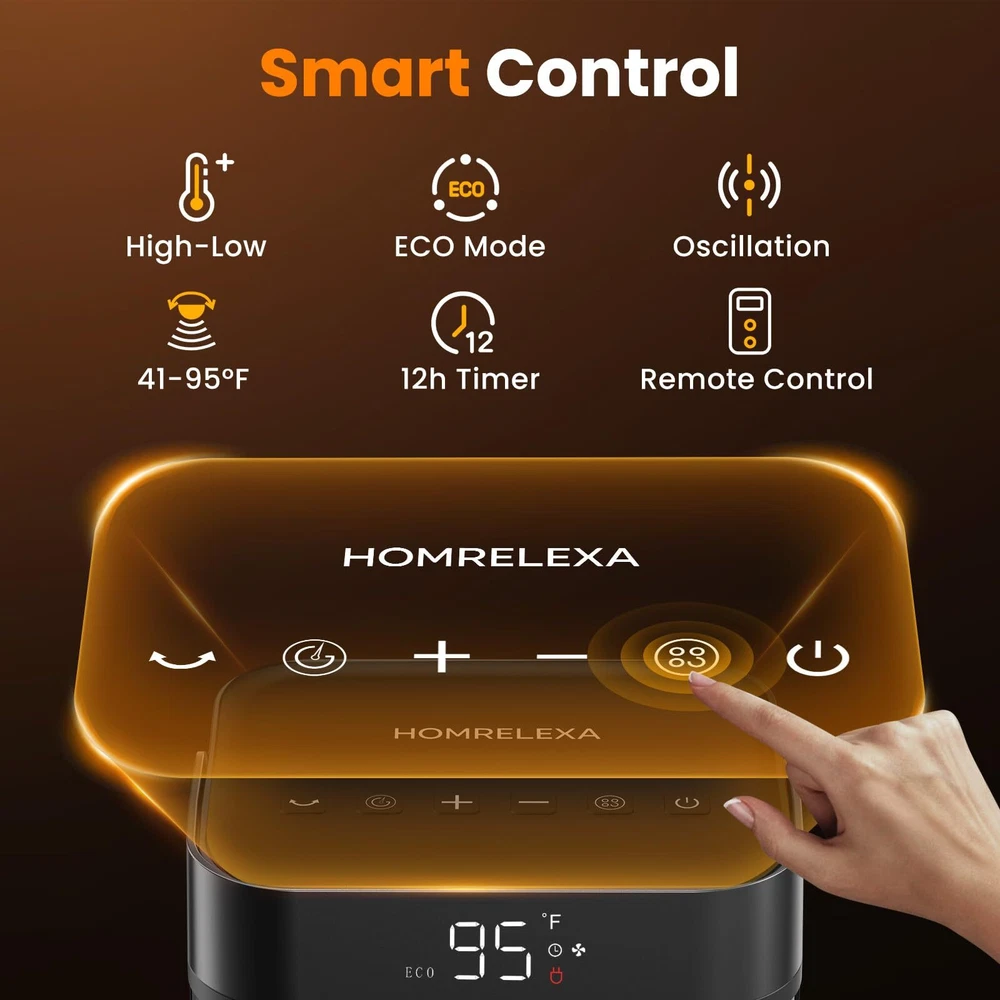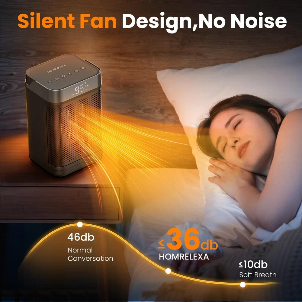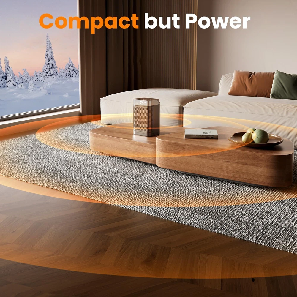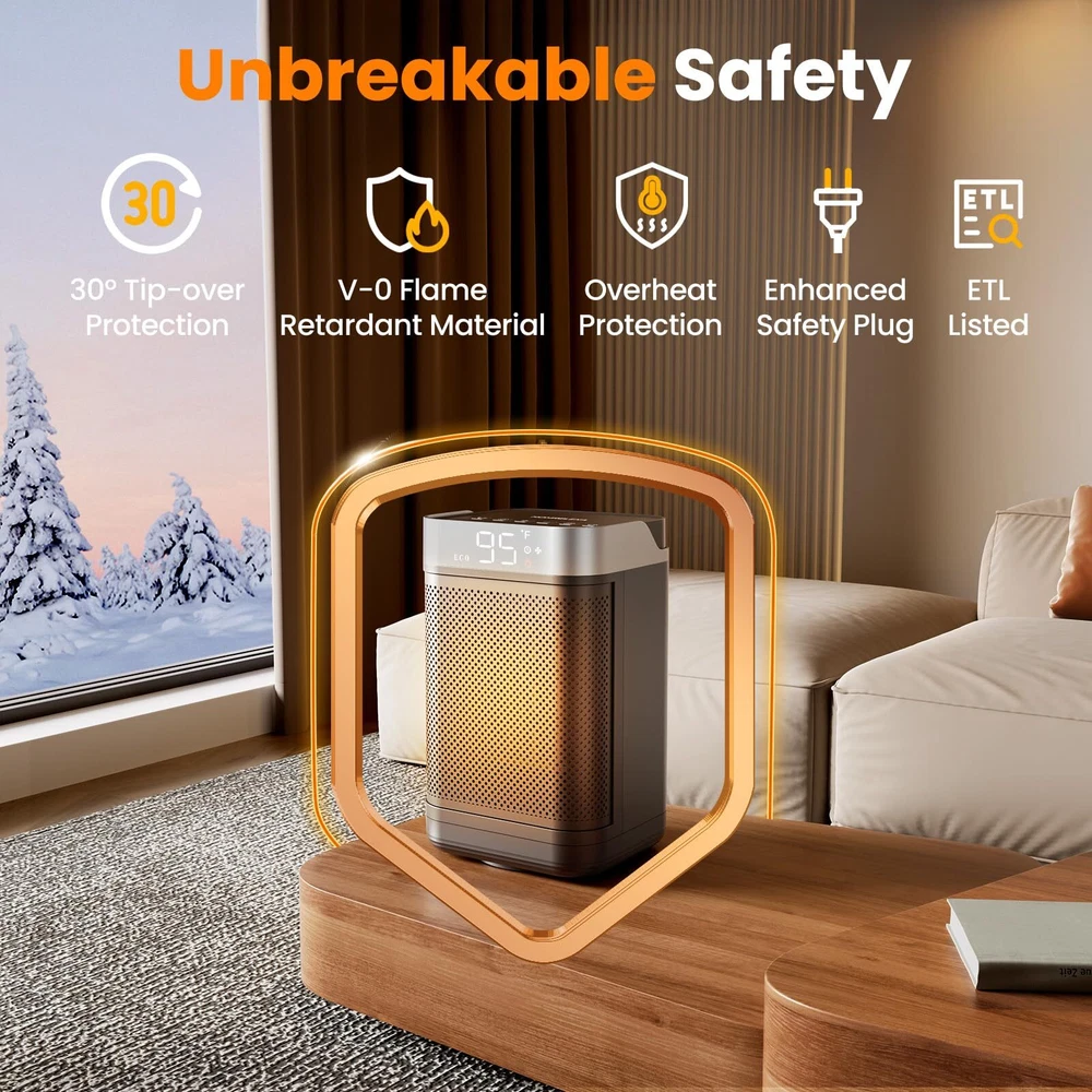 HIGH HEATING EFFICIENCY: This heater rapidly warms up your space within seconds, boasting a powerful 1500W maximum setting. High-efficiency ceramic coils heat up quickly in less time, which will heat up any space faster and distribute the heat more evenly SAFETY FEATURES: This heater is designed with multiple safety features, made of V0 flame-retardant material, and will not overheat even if it is turned on for a long time. If the product is tilted or bumped into, the space heater will automatically turn off the power to effectively avoid combustion, fire, or any other accidents. Our room heater stays warm and worry-free with this versatile and reliable heating solution WARM ANY ANGLE: Combined with an adjustable thermostat control, the small portable heater can according to the thermostat setting let your room remain at a comfortable temperature. You can customize the 90°wide-angle oscillation and 41-95℉ temperature with ±1℉ increments to suit your preferences. Experience the heat that envelopes you in the widest way possible ENERGY-EFFICIENT: The ECO mode automatically adjusts the heating level to reach your desired temperature, providing precise warmth, which enhances heating efficiency while minimizing electricity consumption and saving more on your electricity bill. This portable heater ensures your surroundings meet the desired comfort levels, making your living experience truly cozy NOISELESS AND SILENT: Our heaters for indoor use feature a brushless DC motor to reduce noise to run quietly. Enjoy warmth without any distracting noise in your space, providing a peaceful environment for sleeping or working. Ideal for quiet use in bedroom, office, study room, dormitory etc COMPACT AND PORTABLE DESIGN: This tabletop heater meets individual warmth needs at home or work. Build-in handle and lightweight (3lbs) allow the heaters for indoor use to be carried easily and can be easily placed under desks and in tight spaces. No more concern about a space heater office taking up too much space in a crowded room