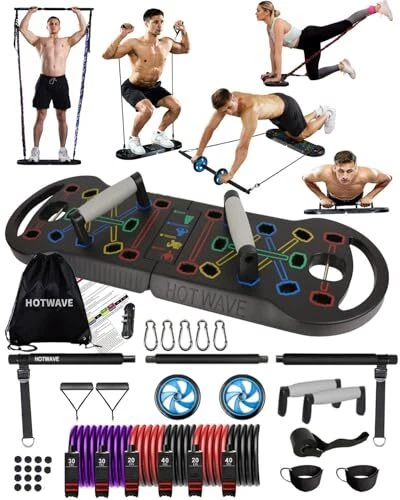 Return Policy Fast Delivery Trusted seller Portable Exercise Equipment with 16 Gym Accessories.20 in 1 Push Up Board Fitness,Resistance Bands with Ab Roller Wheel,Full Body Workout at Home Product Description 【ALL IN ONE HOME WORKOUT EQUIPMENT SYSTEM】 Portable Exercise Pack is used with various workout equipment attachments:foldable Pushup board,3-section Bar,6 Resistance Bands, 2Ankle Strap,door nachor,Ab roller wheel,which can fulfill most of your workout needs in the gym 【Unique Push Up Board】The unique appearance of custom design is fashionable and efficient. Working out the right muscle groups according to the color area improves exercise efficiency by 40%.Target (chest, triceps, shoulders, back) for maximum effect 【Portable Home Gym】 Howave is designed to replace bulky equipment and machines in gyms and combine them into one creative workout concept. It's a home gym that you can take anyw, work your whole body out, take up no space, and save you the expensive cost of a gym. 【Fitness System for Anyone】For this versatile home portable fitness device, we've kept the professional pushups training, added foldable fitness bars and wrist/ankle straps, Ab roller wheel and 6 resistance bands so You can perform more exercises.Light but stable enough.You can choose the intensity according to your ability. 【Professional Sports Brand】We are to develop more creative home exercise equipment to help you with upper or lower body exercise, strength training or aerobic exercise, physical therapy. You can exercise and burn calories anytime, anyw. If you have any problem, please contact us and we will give you the solution within 24 hours. Shipping Returns Payment Shipping Shipping is FREE to all addresses other than APO/PO boxes in the lower 48 states. All our stock ships from US-based warehouses. Shipped via USPS or UPS (depending on location and package weight) Unless stated otherwise, all orders will ship within 24-72 hours of your payment being processed. Check our feedback to see the great reviews of FAST shipping we offer. Returns Seller does not accept returns Payment We currently accept payment via eBay managed payments only. Once payment is cleared, we will dispatch your shipment within 1-3 business days. Please refer to the "Shipping" tab for more information regarding shipping speed to your destination.
