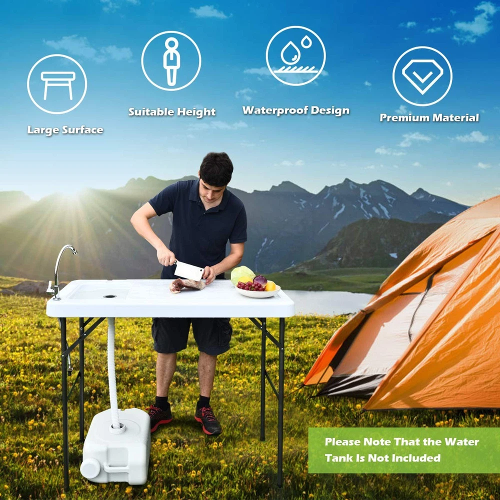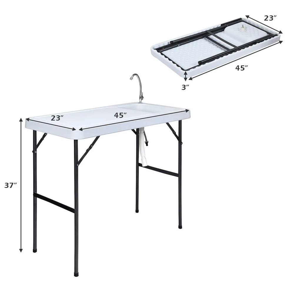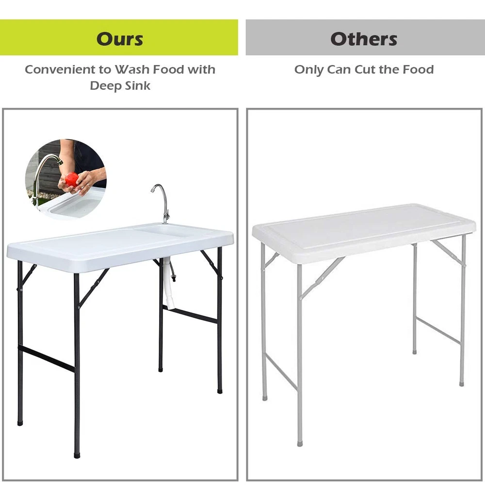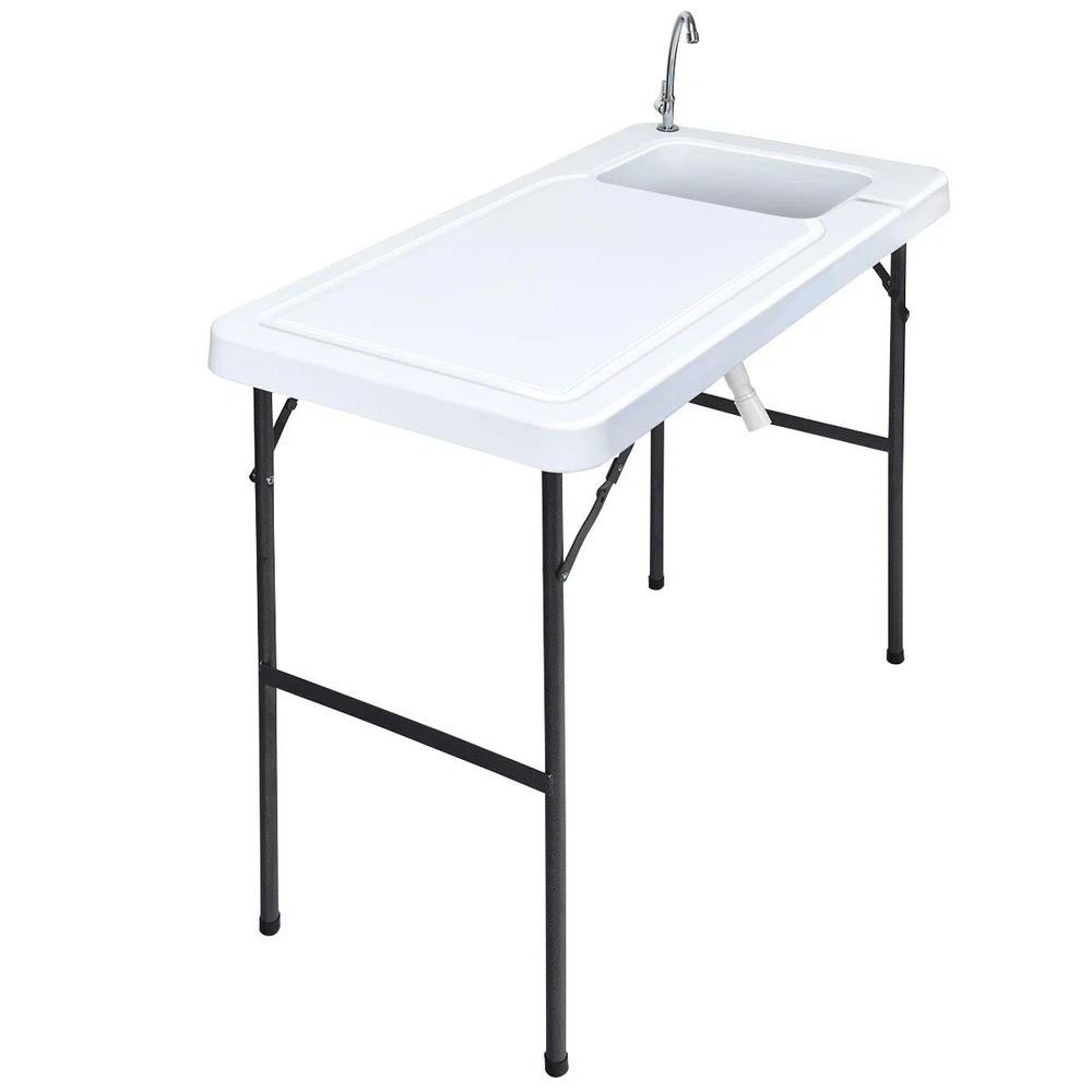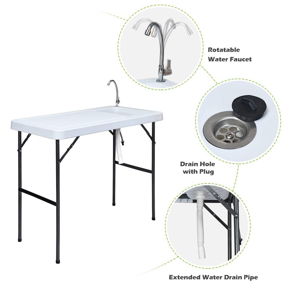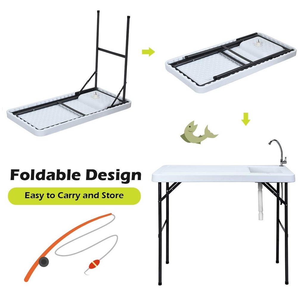 〖Portable Folding Camping Table〗-- Our fish cleaning table features a portable design with foldable legs for easy storage and transportation. You can take it with you on your next camping trip or fishing excursion with ease. 〖High Quality Table Top Surface〗-- Our table features a high-quality HDPE top surface that can load up to 440 LBS, which is tough and durable. This heavy-duty material can handle various operations and provide you with a reliable work surface for years to come. 〖Sturdy and Safe Foldable and Lockable Leg〗-- The table's foldable legs have a lockable feature that ensures stability and safety while you're working on it. Our table design is made to be sturdy and solid, providing you with a safe and secure work surface. 〖Connectable Sink with Faucet for Easy Cleaning〗-- Our fish cleaning table comes with a connectable sink that allows you to use fresh water to clean your table and food with ease. The faucet is easy to connect, making cleaning up a breeze. 〖Versatile and Multi-functional Table〗-- Our folding fish cleaning table is not only suitable for cleaning fish and wild game but can also be used to clean different meats, fruits, and vegetables. Its versatile design makes it an excellent choice for any outdoor activity.