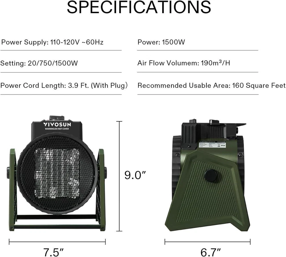 Versatile Functions: This product has two functions, a fan (20W) only and heater (750W & 1500W), to meet your needs in every season; The fan only mode has a cool air output; The heater mode outputs hot air quickly and is energy efficient Fast Heating & Safety Protection: This small space heater heats up instantly within 3 seconds, instantly heating up the room; The heater is made of flame retardant material and will automatically turn off when the internal temperature reaches the thermal protection temperature Portable Mini Design: This greenhouse heater with portable handle is very easy to carry and move, you can put it anywhere you need; The heater is also very and compact in appearance, with dimensions of 7.5" X 6.7" X 9.0", it won't take up much space Convenient Details: The heater uses a bracket structure to avoid friction with the ground, while the heater's 90° rotating design can cover most of the space; IP20 dustproof rating can effectively protect the mesh from water mist damage Wide Range of Applications: This powerful greenhouse heater with thermostat can easily heat up to 160 square feet; Ideal for use in greenhouses, wintering plants, grow tents, garages, kitchens, living rooms, workshops, basements and other areas you need to keep warm