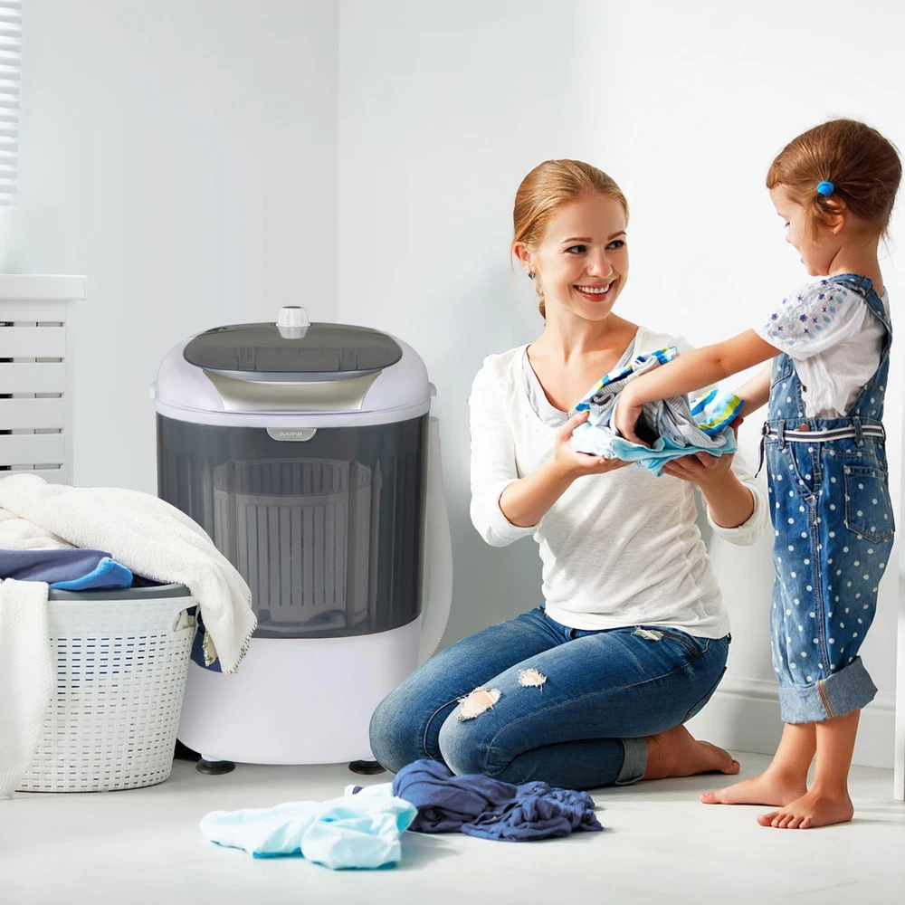 [2 in-1 Design]: Incorporating a single tub design, the washing machine seamlessly blends spinning and washing functions into a unified system to conserve energy. This astute 2-in-1 design adeptly caters to a range of laundry requirements, facilitating more efficient completion of tasks. [Mini but Enough to Use]: Boasting a 5.5lbs washing capacity, this washing machine is well-equipped to handle household laundry needs, accommodating various garments in a single load. The robust 170W motor meets the demands of daily use, while a high-powered turbine delivers efficient swirl washing, saving time and energy. [Easy to Operate]: The washing machine features a rotating control timer that sets washing time at 10 minutes and spinning time at 5 minutes for easy operation. Simply load your dirty clothes, add water, adjust the timer, and initiate the washing cycle. Additionally, a drain hose is provided for convenient water disposal post-wash, ensuring a clean floor surface. [Fit for Your Space]: The compact dimensions measuring 14” x 13.5” x 20” make this washing machine a perfect fit for small living spaces such as apartments, dormitories, and RVs. Furthermore, weighing only 11lbs, the machine is lightweight and easy to transport to different locations as required. [Transparent Lid ]: The transparent lid of the washer enables you to monitor the garment cleaning process at any time. The durable plastic material prevents rusting of the washing machine in damp conditions. Non-slip foot pads provide stability on uneven surfaces, and there is no requirement for installation.