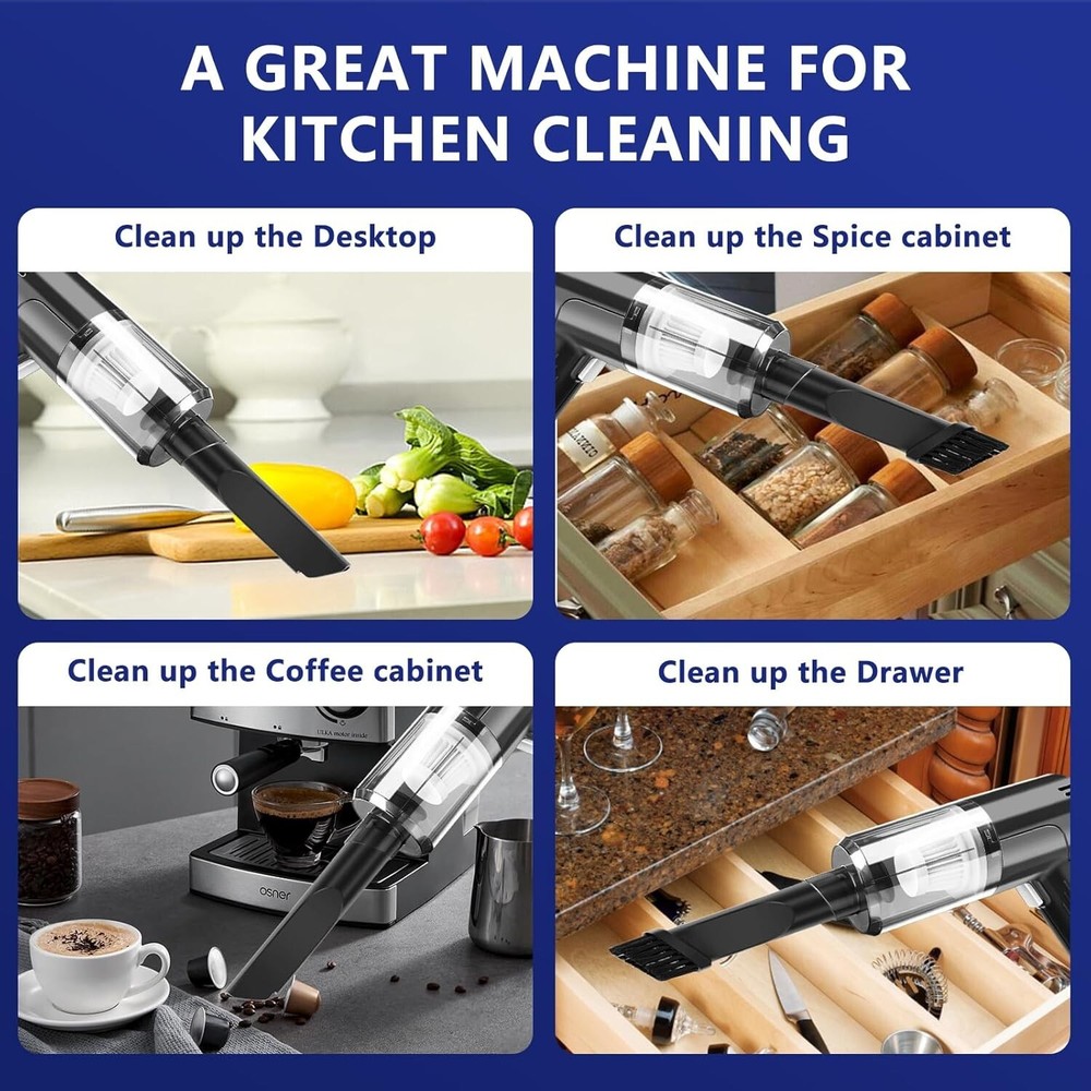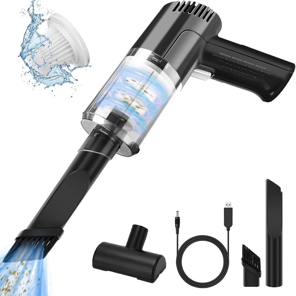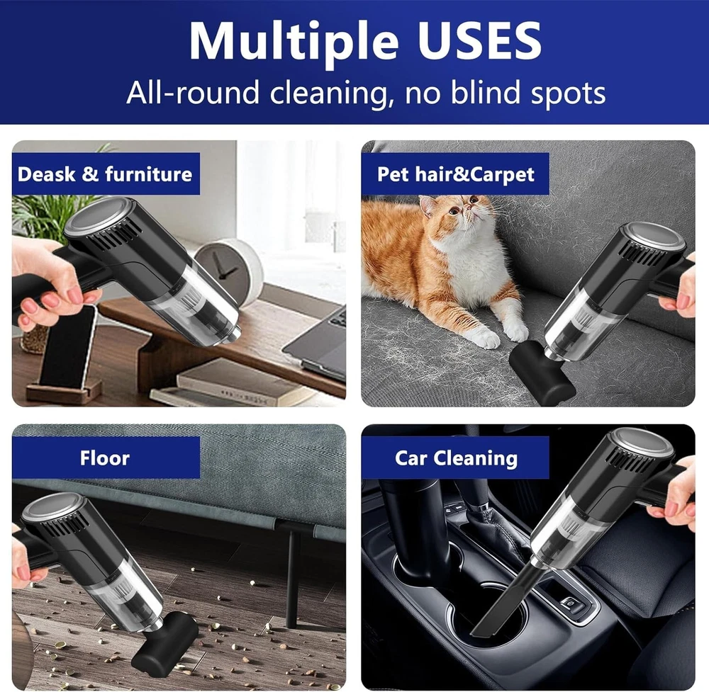 Portable Handheld Vacuum 9000Pa, Powerful Hand-held Cordless Vacuum Cleaner, Portable Vacuum with 120W Rechargeable Power Wet Dry Hand Held Car Vacuum HEPA Filter for Car, Home, Office, Pet 【Multifunctional Vacuum Cleaner】Portable handheld vacuum cleaners provide 1 * floor brush,1 * brush nozzle, and 1 * slit nozzle, these practical slit tools can be used to clean hard-to-reach areas. Handheld Vacuum Cleaner can be a laptop cleaner, desk vacuum cleaner, hand vacuum for car, piano, pet house, office desk cleaning, etc. 【Cordless & rechargeable】USB Rechargeable, the car vacuum car cleaner cordless has a built-in 4000mAh rechargeable lithium battery, can work continuously for 20-30 minutes, and it can be fully charged in 3-4 hours. Comes with a charging cable, which can be connected to a laptop computer, car USB port charging, mobile power supply, etc. 【Washablefilte and removable 】 Its HEPA filter is washable and reusable, which keeps dust and dirt out to avoid blockage. Take the filter out of the dust cup of the vacuum cleaner, wash it with water and dry it for second use. (Using tip: If the vacuum filter is full of dirt or suction weakness, please clean the filter in time to make sure the dust buster can work normally.) 【9Kpa Strong Suction 】The handheld car vacuum has 9Kpa Strong Suction, Suitable for daily housework to clean up the dust. Output power130W superpower motor provides strong suction up to 9000pa, which can quickly and easily remove food residues, particles, and pet hair around the house or in the vacuum wireless mobile operation is more convenient. 【Multifunctional Vacuum Cleaner】Hand held wireless professional car vacuum cleaner, make your car and home clean every day. The handheld vacuum cleaner has a lightweight body and weighs only KG. It is not tired to hold for a long time and is especially suitable for the elderly and women.🔴If you are not satisfied with your purchase, please contact me. We will reply and provide service to every customer within 24 hours