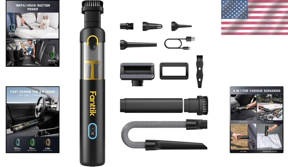 Portable Handheld Vacuum with 19000PA Suction Power - Perfect for Cars & Home ‹ › ‹ › ‹ › ‹ › ‹ › ‹ › ‹ › ‹ › ‹ › ‹ › ‹ › Portable Handheld Vacuum - 19000PA Suction Power Discover the ultimate cleaning companion designed for both your car and home. Our Portable Handheld Vacuum boasts an impressive 19000PA suction power, ensuring that even the most stubborn dust and debris are effortlessly eliminated. Features: Compact design perfect for detail cleaning of car interiors, office desks, and computer keyboards. 4-in-1 Multifunctionality: Vacuuming, blowing, inflating, and pumping capabilities. Equipped with 10 Practical Accessories for all your cleaning needs: Crevice Nozzle and Flexible Hose for hard-to-reach corners. Push-in Brush for tackling stubborn dust. Multi-Surface Brush and Pet Brush for easy pet hair removal. Powerful 80000rpm brushless motor producing suction of Max 45AW/19kPa. Two suction modes: Eco Mode for 40 minutes, Max Mode for 13 minutes. Type-C charging with a universal cable allows charging in the car or with any standard charger (15W or higher). Ultra-lightweight at only 1.1lbs (498g) for easy handling and portability. One-Touch emptying mechanism to dispose of debris without mess. HEPA filter captures 95.99% of dust and particles for cleaner air. Upgrade Your Cleaning Experience: Why settle for ordinary when you can bring home exceptional cleaning power? The Portable Handheld Vacuum offers cutting-edge suction technology within a lightweight design, making tedious cleaning tasks a breeze. With its impressive 19000PA suction capability and versatile features, you will enjoy unmatched convenience whether you are detailing your car or tidying up indoor spaces. Transform your cleaning routine today with this sophisticated yet practical cleaning solution. Order the Portable Handheld Vacuum now and redefine the way you clean! Shipping Free & Fast Shipping - We offer free shipping to most of the USA with a normal delivery time of 3-7 days. However, due to the current situation, additional delivery time (up to 3 weeks) may be required for some items. Alternative Carriers - We may use alternative carriers (e.g. USPS, FedEx, UPS, etc.) to ensure your package arrives safely and on time. Due to the use of multiple carriers, we are unable to provide a tracking number automatically. Handling Time - Orders are processed and shipped within 1-2 business days of receiving cleared payment. Shipping Restrictions - Shipping to Alaska, Hawaii, Puerto Rico, Guam, and other US territories may incur shipping charges or delivery restrictions. Please contact us before ordering, or your order can be refunded/cancelled. State Restrictions - There may be restrictions based on your state of purchase. For example, certain items may not be shipped to California due to state regulations. Contact for Tracking Updates - If you require tracking updates or have any concerns about the delivery of your order, please feel free to contact us, and we will be happy to assist you. Return Please see our eBay Return Policy. Thank you. Payment We accept all major credit cards, PayPal, and Apple Pay for your convenience. Your payment information is secure and encrypted to ensure a safe and seamless transaction. Please complete your payment within 3 days of purchase to avoid any delays in shipping. Feedback Your feedback is extremely important to us. We strive to provide the best products and customer service possible. If you are satisfied with your purchase, please take a moment to leave us a positive review. If you have any concerns or issues with your order, please contact us before leaving negative feedback. We are committed to resolving any problems and ensuring your satisfaction. Contact Us If you have any questions or concerns, please feel free to reach out to our customer support team. You can contact us through the eBay messaging system. We are available Monday to Friday, 9:00 am to 5:00 pm EST, and we will do our best to respond to your inquiry within 24 hours. Thank you for supporting our small family business! UPC: Not Set Unit Quantity: 1 Features: Compact,Portable,Cordless,Ultra-Light,Multi-Surface,Handheld Included Accessories: Flexible Hose,Crevice Nozzle,Push-in Brush,Multi-Surface Brush,Pet Brush,Little Cleaning Brush,Storage Bag,Type-C Charging Cable,Short Blow Nozzle,Long Blow Nozzle,Multi-Function Air Blower,Blow Nozzle Brush,Replacement Filter Brand: Unbranded Type: Handheld Model: Not Set Smart Home Protocol: Not Set Runtime: 40 min Smart Home Compatibility: Not Set Charge Time: 2.5 hrs MPN: Not Set Color: Black Power: 120 W Filters: HEPA Voltage: 11.1 V Country/Region of Manufacture: Not Set Capacity: 0.12 L Protection Plan: No Coverage Manufacturer Warranty: Not Set Item Weight: 1.1 lb Unit Type: Unit Cord Type: Not Set Bagged/Bagless: Not Set
