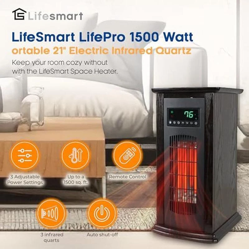 You may also like Energy Efficient Portable Electric Ceramic Heater 400W Compact Design Indoor Use 17.97 USD 18.92 USD Free shipping 5% off Portable Electric Personal Space Heater 750W Fan 2 Settings Tip-Off Protection 37.7 USD 39.68 USD Free shipping 5% off About this item Indoor space heater efficiently warms up a 1500-square-foot area, making it a versatile heating solution for various spaces like bedrooms, living rooms, and basements Incorporates 3 infrared quarts and advanced infrared technology, ensuring energy-efficient heating while offering 3 adjustable heat power settings for customized warmth Built with user-friendly controls with a large LED display simplify temperature adjustments and includes remote control that allows you to manage the heat from anywhere in the room Comes with a safety features such as an automatic shut-off during overheating and a cool touch exterior that makes it a secure option for households with children and pets Crafted with sleek furniture-grade wood that seamlessly complements various furniture and decor setups; Measures 11. 6 inches long, 10. 2 inches wide, and 20. 9 inches tall, and weighs 20. 9 pounds Brand:LIFESMART GLOBAL Special Feature:Cool Touch Exterior Color:black Form Factor:Tower Indoor/Outdoor Usage:Indoor Power Source:Corded Electric Heating Method:Radiant, Convection Item Weight:24. 6 Pounds Heat Output:5100 British Thermal Units You may also like Genuine OEM Replacement Trimmer Line Durable 118" Diameter Twisted Shape NEW 27.74 USD 29.2 USD Free shipping 5% off Grey Metal Food Storage Canister Set 5pc Freshness Seal Cookie Box 5 Cup Cap New 51.29 USD 53.99 USD Free shipping 5% off Silver Poodle Kitchen Scene Dish Mat 14x21 Breed Artwork Polyester Foam New 27.11 USD 28.54 USD Free shipping 5% off English Pointer Breed Specific Bone Treat Jar 9" Tall Full Color Artwork New 78.39 USD 82.52 USD Free shipping 5% off 10 Shelf Organizer Shoe Rack w/ Zip Down Fabric Cover Lightweight Hold 30 Pair 38.23 USD 40.24 USD Free shipping 5% off 20-Piece Flatware Set Stainless Steel Satin Finish Service 4 Kitchen Dining New 31.93 USD 33.61 USD Free shipping 5% off Hairball Control Cat Food 7lb Bag Salmon Rice Protein Digestive Vision Support 35.92 USD 37.81 USD Free shipping 5% off ABS Wireless Digital BBQ Grilling Thermometer Built-In Timer LCD Display Screen 26.64 USD 28.04 USD Free shipping 5% off Natural Chicken Beef Wet Cat Food 3oz Cans 12 Pack Gravy Added Nutrition New 24.27 USD 25.55 USD Free shipping 5% off Stretch Plush Recliner Slipcover Set Furniture Protection & Refreshment New 28.41 USD 29.91 USD Free shipping 5% off Healthy Kitten Wet Cat Food Chicken Salmon 3oz Cans 12 Pack High-Protein Formula 26.43 USD 27.82 USD Free shipping 5% off 12.5" Sea Green Non-Stick Aluminum Skillet Healthy Cooking on All Cooktops New 44.73 USD 47.08 USD Free shipping 5% off