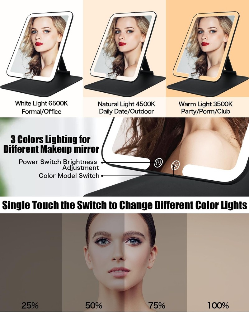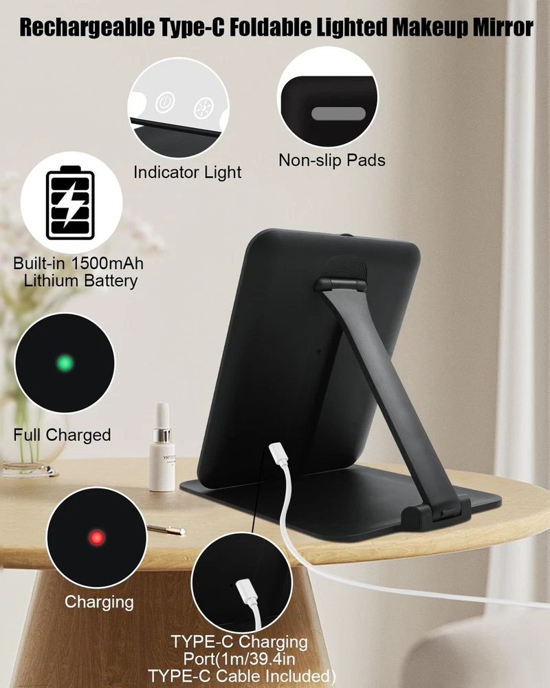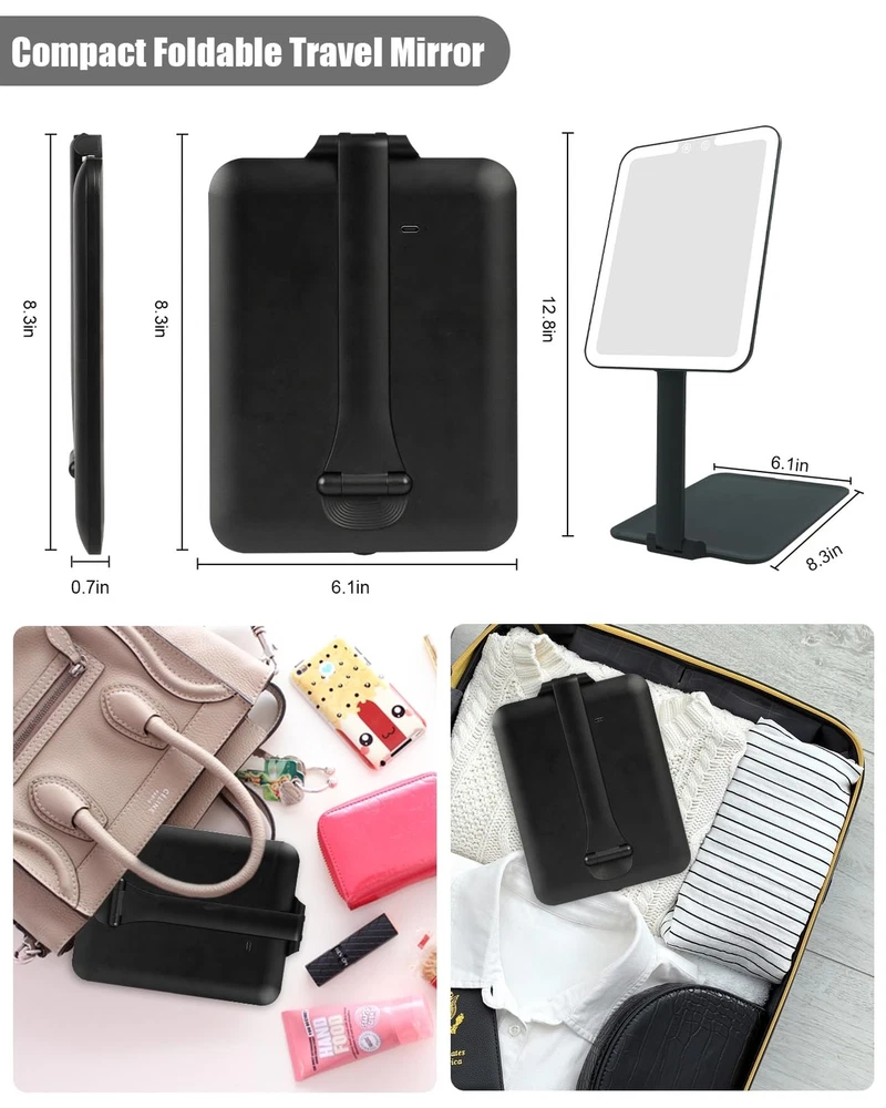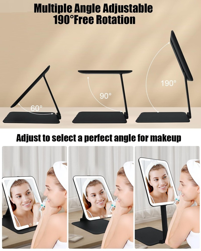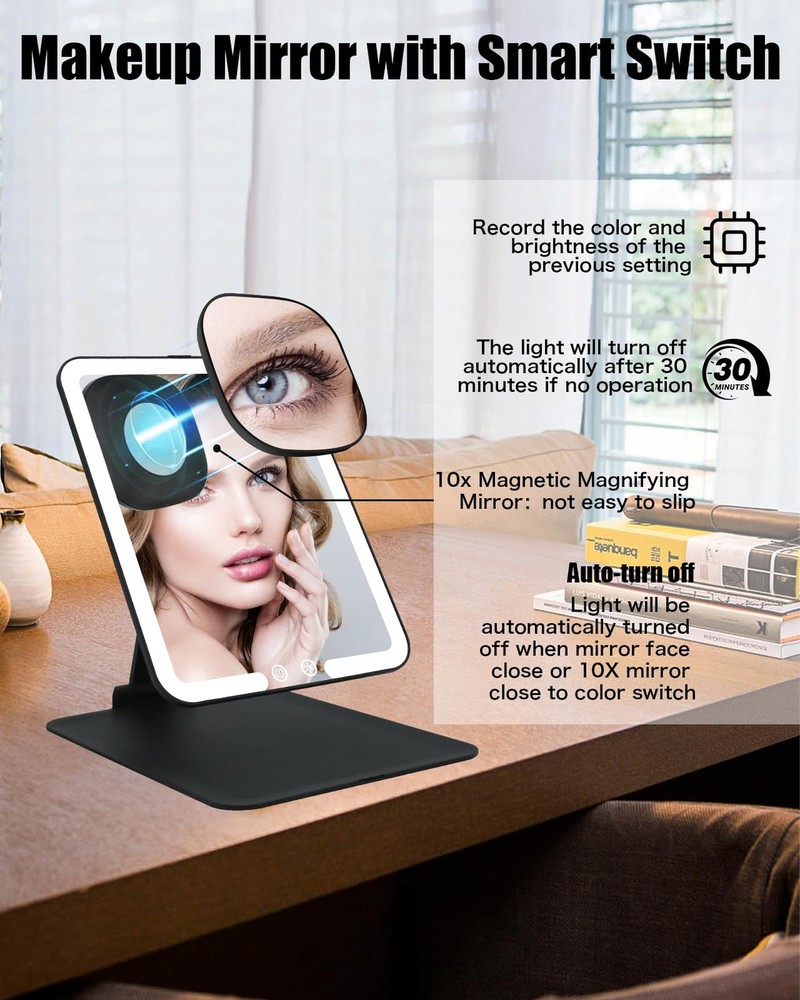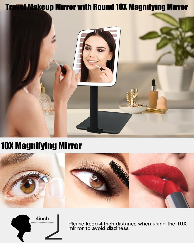 Travel Makeup Mirror with Light, Portable Travel Lighted Makeup Mirror with 10X Magnifying Mirror, Foldable Stand & Angle Touch Screen Portable Led Mirror with 3 Lighting Colors, Ultra Thin Product Details Color: Black Brand: TOLOYE MPN: BM-2219 UPC: Does not apply EAN: Does not apply Brand: TOLOYE Room Type: Bedroom Shape: Rectangular Product Dimensions: 7"L x 6"W Frame Material: Acrylonitrile Butadiene Styrene (ABS) Brand: TOLOYE Room Type: Bedroom Shape: Rectangular Product Dimensions: 7"L x 6"W Frame Material: Acrylonitrile Butadiene Styrene (ABS) Mounting Type: Tabletop Mount Surface Recommendation: Glass Special Feature: Adjustable Color: Black Theme: Travel Specific Uses For Product: Makeup Number of Pieces: 1, 2 Number of Items: 1 Material: Glass, Acrylonitrile Butadiene Styrene Frame Type: Framed Assembly Required: No Manufacturer: TOLOYE Item Weight: 1.17 pounds Country of Origin: China Item model number: BM-2219 Batteries: 1 Lithium Polymer batteries required. (included) Date First Available: June 4, 2024 Rechargeable Travel Makeup MirrorThe travel mirror can operate 7.5 hours via 2-3 hours full charging (TYPE-C cable include), perfect for everyday activities. Easily connecting to laptops, adapters, power banks, or car chargers for on-the-go versatility, easily fold it and put it in your backpack or suitcase (charger not included). Folding & Standing DesignOur portable makeup mirror is compact with a folding and standing design (overall size: 8.3 x 6.1 inches, 0.7-inch thickness when folded). The adjustable angle up to 190 to prevent strain, providing flexibility for ideal position. Effortlessly fold it up and take it anywhere with you. Standing mirror and the portability of folding mirrors, all in one. Dimmable 3-Color Lighting Travel Mirror The travel lighted makeup mirror offers 3 light modes: White Light: daily office or formal workplaces; Natural Light: daily date or outdoor makeup; Warm Light: dinner party, prom, club, can be easily changed by short pressing the touch button. Long press another touch button, you can achieve your desired lighting level. 1X/Detachable 10X Magnetic Magnifying MirrorThe travel makeup mirror includes a small 10x magnetic magnifying mirror.The 1X magnification is ideal for an overall view.10X mirror ideal for precise tasks like false eyelashes, eyeshadow application, and lipstick, allows for hands-free detailed makeup application, help you to see intricate details. Memory Function & Angle-Activated LightingThis rechargeable travel makeup mirror with memory function that can record the color and brightness of the previous setting. And when angle between the mirror and the stand exceeds 30, the lights will auto turn on. When the angle is less than 30, the lights will auto turn off. Without the hassle of searching for a switch.To save the power, light will automatically turn off after 30 minutes if no operation. Perfect Travel Makeup Mirror GiftThe ideal gift for women and girls, this portable makeup mirror offers stable positioning at various angles and suits different desktop heights. It's perfect for travel . A thoughtful present for occasions like Christmas, Valentine's Day, and Mother's Day.