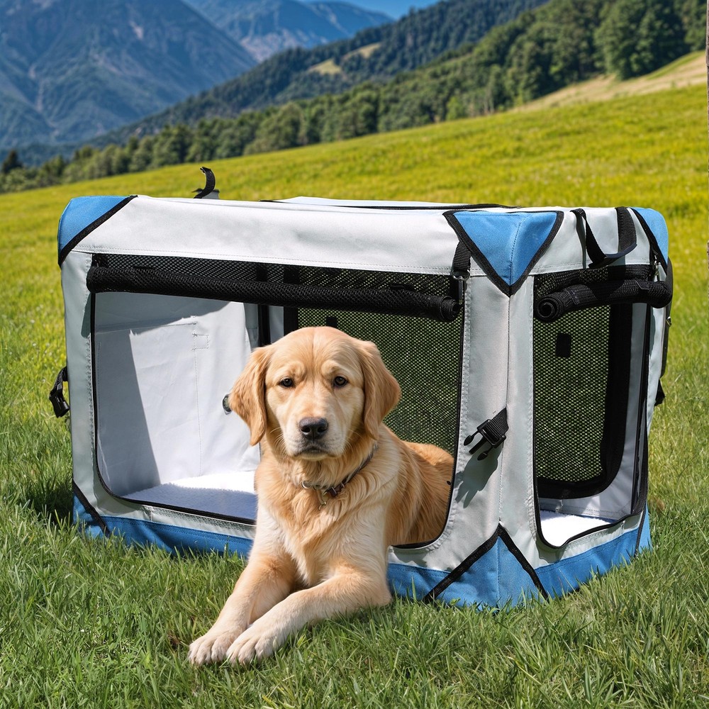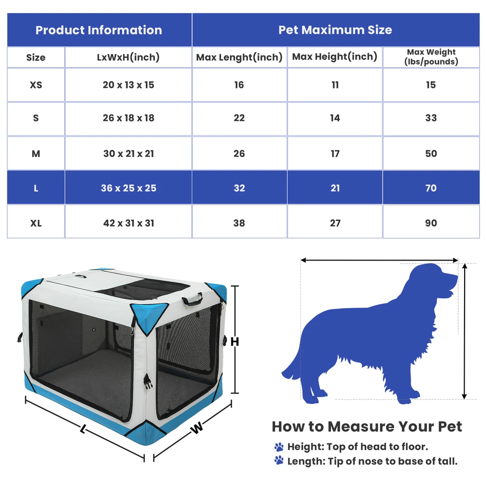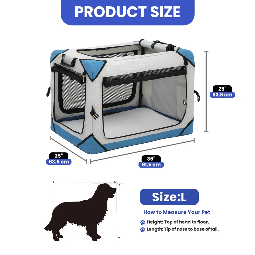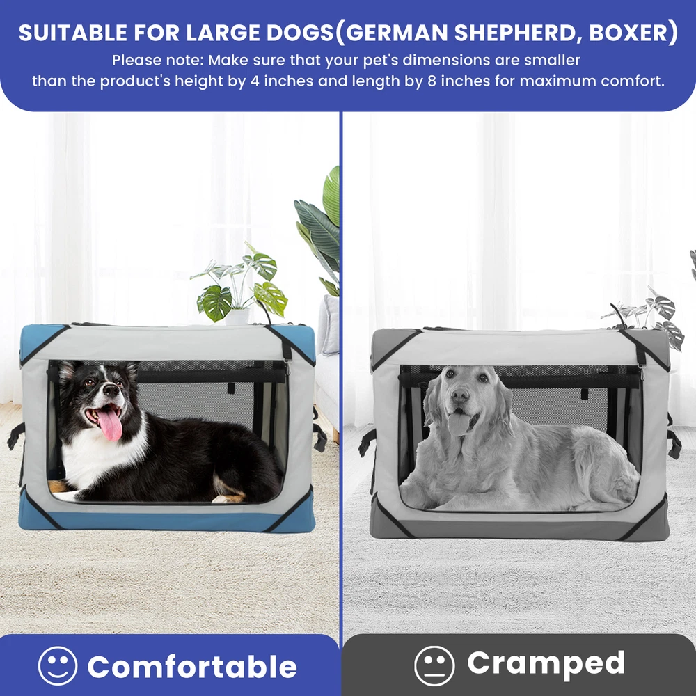Portable Dog Crate Large Pet Travel Carrier Waterproof Camping Cage w/ Plush Pad < /div> Product Description NOTE: Professional Installation would be Highly Recommended. Description: 1. Color: Light Gray + Deep Blue 2. Material: Iron Tube, 600D Oxford Fabric, Eyelet Mesh Fabric 3. Special Design: Waterproof, Zipper Closure, Storage Bag, Three Sides Doors, Top Openable 4. Suitable for: Large Size Dog/Pet, Travelling Carrier, & Camping Cage Features: 1. Spacious and Convenient: This collapsible dog crate measures 36" L x 25" W x 25" H, providing ample space for pets up to 32" L and 21" H, with a maximum weight of 70 lb. Perfect for home and travel use. 2. Portable Design: Lightweight at 10.2 lb, this dog crate is easy to transport. The included storage bag makes it convenient to pack and carry, perfect for on-the-go pet owners. 3. Versatile Access: Features three side doors and a top that can be opened, allowing easy access and flexibility. The zipper closures ensure your pet remains secure while providing hassle-free entry and exit. 4. Durable Construction: Built with a sturdy iron tube stand and reinforced with spray coating. The 600D Oxford fabric and 190g eyelet mesh fabric ensure durability and breathability for your pet's comfort. 5. Waterproof and Easy to Clean: The waterproof fabric ensures easy maintenance and cleanliness, keeping your pet dry and comfortable in all conditions. Ideal for both indoor and outdoor use. Dimensions: 1. Overall Dimensions: 36" L x 25" W x 25" H 2. Maximum Pet Size: 32" L x 21" H 3. Maximum Weight: 70 lb 4. Item Weight: 10.2 lb Package Included: 1. 1x Dog Crate 2. 1x Accessory Kit 3. 1x Instruction Shipping 1. Normally the item will be dipatched within 1 business day if payment is cleared before 12pm PST. 2. Please verify the correct shipping address in your PayPal account before making the payment. We only dispatch the item to the address that is sent to us at the time of checkout. 3. We don't ship to Hawaii, Alaska, Puerto Rico, APO/FPO/PO Boxes. 4. We don't provide local pick-up service. 5. Normally we will use USPS, UPS, FedEx & LTL to dispatch items. Payment 1. We accept PayPal and credit card. 2. We will ship to the confirmed Paypal shipping address that is provided with the payment only. Return 1. 30 days Money Back Guarantee. 2. Please contact our customer service to receive a RMA form first if want to return the item. 3. All returned items MUST in new condition with the original package. Contact If has any problem, please contact us by sending an ebay message. Our customer service will resolve the problem as soon as possible. On Feb 13, 2025 at 02:28:40 PST, seller added the following information: