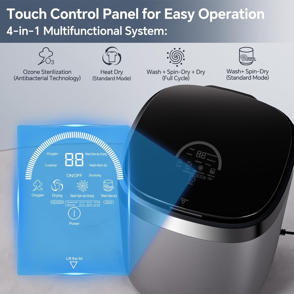 Looking for a Convenient, Space-Saving Laundry Solution? This Portable Mini Washing Machine is designed to make your life easier with its all-in-one functionality and compact design. Here's why it’s the perfect choice for small spaces, dorms, or travel: 1. All-in-One Design: Wash, Spin, Dry, and O₃ Deep Clean This mini washer does it all in one compact unit: ✔️ Washes your clothes thoroughly. ✔️ Spins out excess water for faster drying. ✔️ Dries your garments with hot air, even in cold or humid weather. ✔️ O₃ Deep Clean using advanced cleaning technology to eliminate odors. 2. Automatic Water Inlet & Drain System Simplify your laundry routine: ✔️ The machine automatically fills and drains water through its 4-point water inlet and drain system . ✔️ Just add detergent, turn on the faucet and power, and let the washer handle the rest. 3. Active Oxygen Stain Removal Say goodbye to stubborn stains: ✔️ The active oxygen cleaning technology penetrates deep into fabric fibers. ✔️ Removes tough stains while keeping your clothes fresh. 4. Hot Air Drying for Comfort Stay comfortable no matter the weather: ✔️ The built-in hot air drying function ensures your clothes are dry and ready to wear. ✔️ After drying, the machine switches to a circulating air mode (up to 6 hours) to keep your garments fresh. 5. Spacious 7L Capacity Despite its compact size, this mini washer can handle: ✔️ 2-3 pieces of underwear. ✔️ 3-4 pairs of panties. ✔️ 2-3 towels. ✔️ 2-3 baby clothes. ✔️ 7-8 pairs of socks. Perfect for everyday use or specialized laundry needs like delicates, baby clothes, and more. Why Choose This Mini Washer? ✔️ Compact and Portable: Ideal for small apartments, dorms, or travel. ✔️ Energy-Efficient: Designed to save water and electricity. ✔️ Easy to Use: Simple controls and automatic functions make laundry effortless. ✔️ Versatile: Handles a variety of garments, from underwear to towels. Kind Tips 1. Not suitable for washing large shirts and jeans: The capacity of the mini washing machine is only 7L, so large shirts and jeans are not supported! 2. Automatic Drainage: Connect one end of the drain pipe to the washing machine and place the other end in the sink or other place where water can be placed. The clothes will be automatically drained after washing. If the water cannot be drained out, or the water cannot be completely drained, the clothes will not be able to be dehydrated or dried. Please check whether the drain outlet of the drain pipe is lower than the bottom of the washing machine. 3. Proper Detergent Usage: Please make sure to put in the right amount of laundry detergent or liquid. Too much detergent will not only cause waste but may also lead to incomplete rinsing and leave residue on the clothes. The recommended amount of washing powder and laundry liquid for a 7L mini washing machine running at full load is: Washing Powder: Light soiling: 40-50 grams Medium soiling: 50-60 grams Heavy soiling: 60-70 grams Laundry Liquid: Light soiling: 40-50 milliliters Medium soiling: 50-60 milliliters Heavy soiling: 60-70 milliliters Upgrade your laundry experience with this efficient, reliable, and space-saving mini washing machine. Order now and enjoy clean, fresh clothes without the hassle! Automatic Water Inlet & Drain System:This mini washing machine features a convenient 4-point water inlet and drain design for quick and effortless water filling and draining. Simply add detergent, turn on the faucet and power, and let the machine handle the rest. Smart Dehydration & Drying Modes:With its advanced drying technology, this mini washer automatically washes, dehydrates, and dries your clothes. After hot drying, it switches to a circulating air mode (up to 6 hours) to keep garments fresh and comfortable. Hot Air Drying Function:Ideal for cold or humid weather, the built-in drying function ensures your underwear, socks, and delicates are thoroughly dried and ready to wear every day. Active Oxygen Stain Removal:Utilizing ozone technology, this mini washer penetrates deep into fabric fibers to remove stubborn stains and sanitize clothes, leaving them clean and odor-free. Spacious 7L Capacity:Despite its compact size, this small washing machine can handle up to 2-3 pieces of underwear, 3-4 pairs of panties, 2-3 towels, 2-3 baby clothes, or 7-8 pairs of socks, making it perfect for everyday use.