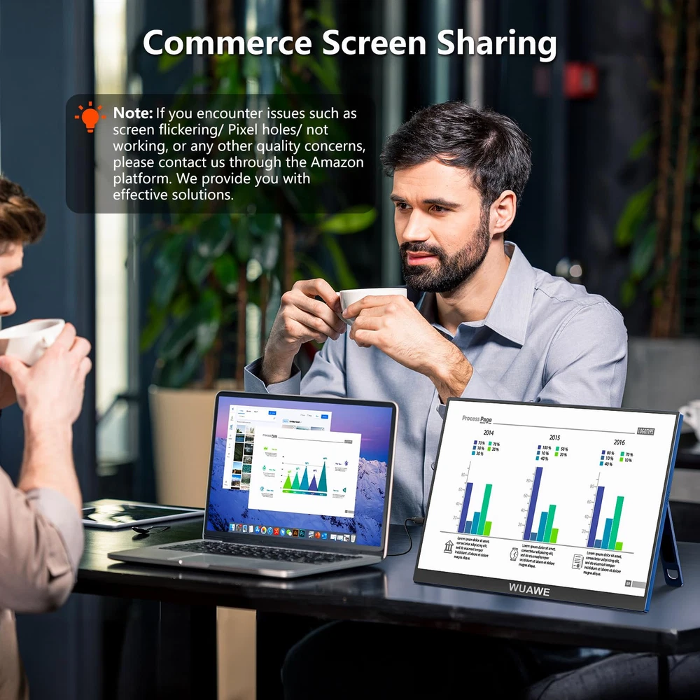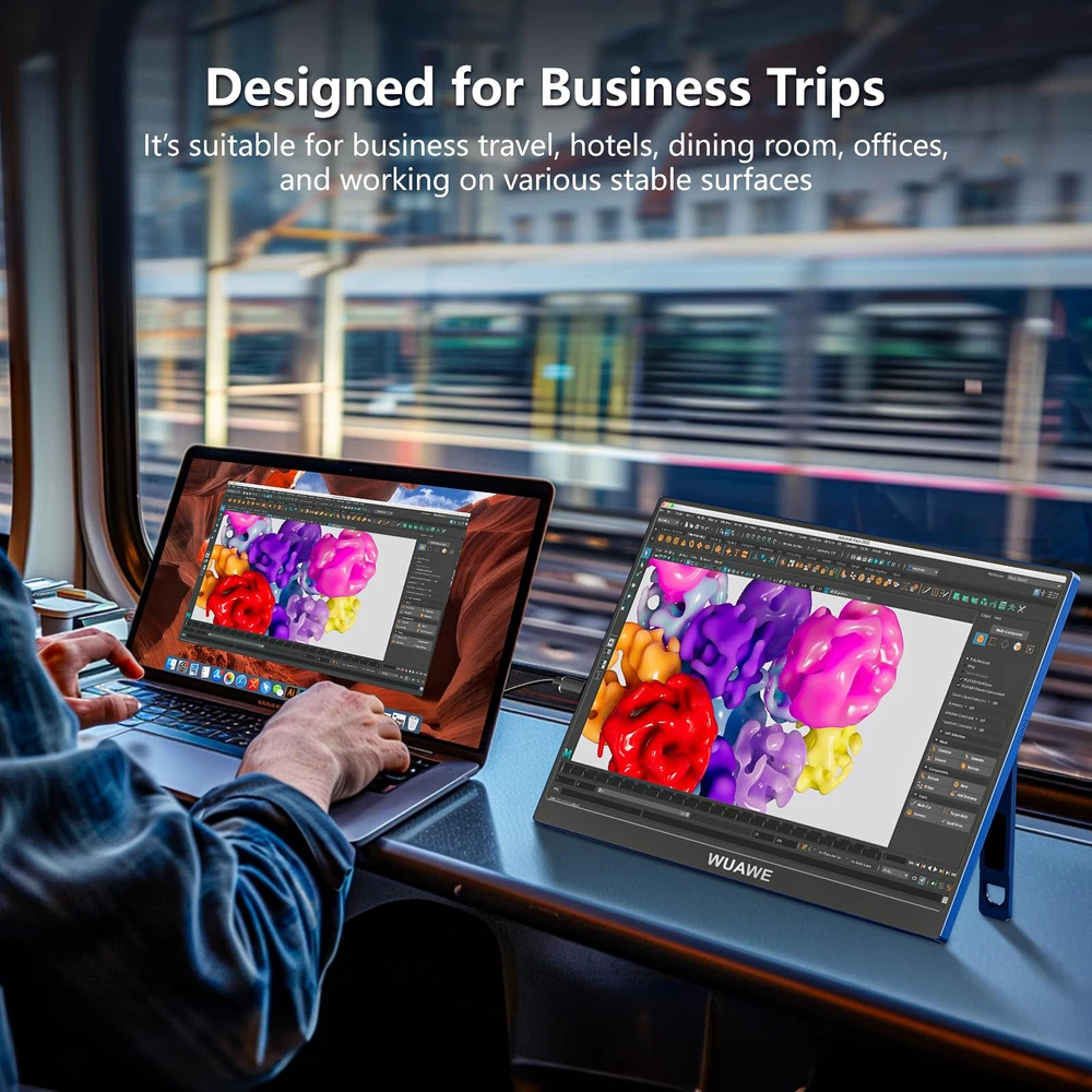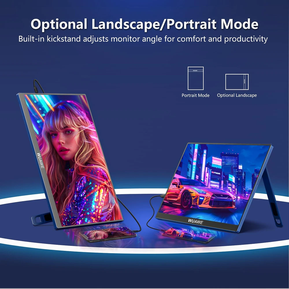 1200P 16'' Portable Laptop Monitor: The 16" portable monitor with 1920x1200P, featuring 300cd/m² brightness, a 1200:1 contrast ratio, HDR, Freesync, and low blue light, making your gaming and work experience truly immersive. It is suitable for various application scenarios such as meeting rooms, shopping malls, office buildings, cafes, universities, and industrial parks Adjustable Stand: The pull-out kickstand attached to the back stays exactly where you adjust it, Its ability to work in both landscape and portrait modes adds to its versatility, whether you’re working, gaming, extending your laptop screen, or using it as a handy phone display Plug and Play Portable Monitor: Simply connect to power and display signal transmission using a USB Type-C cable - no drivers needed. Portable monitor for laptop equipped with 2 USB Type-C ports and Mini-HDMI port, easily connect to your laptop, PC, cell phone, Mac, PS5/PS4, Switch for seamless connectivity on-the-go(Note: Thunderbolt 3.0 or USB 3.1 Type C DP ALT-MODE required for compatibility) Multiple Display Mode: This portable computer monitor supports duplicate, extended, second screen, and vertical display mode, bringing high efficiency to your meetings, work from home, and travel. Having a second monitor for laptop significantly enhances your multitasking abilities, allowing you to handle multiple tasks with ease! Slim and Lightweight: This 16" external monitor for laptop portable is only 1.58 pounds and 0.37 inches thick, it's the perfect size for packing in your bag and taking with you wherever you go. It would have made traveling for work so much more enjoyable, you can watch movies, play games, or get work done at the airport, hotel, or even a coffee shop! Plus, with a 2-year warranty and offers 24/7 customer service