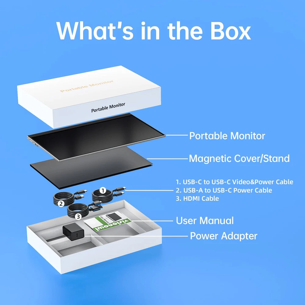Portable Screen for Laptop: portable monitor, with 1920 x 1080 resolution, lets you work and play on the go. With its sleek design and lightweight construction, you can easily take it with you. Perfect for presentations, gaming, and working, this portable external display is a must-have for anyone who wants to stay productive and entertained Plug and Play: For the devices(laptop or PC) with Thunderbolt 3/4 port, only one original USB-C to USB-C cable is required for both the video signal and power supply, No driver is required, and easy to use. Made of sleek and solid aluminum, it's only 0.23 inches and 1.6 pounds lightweight and allows you to easily bring this monitor on a business trip and travel Wide Compatibility and VESA Mountable: With dual USB-C Ports and one upgraded standard HDMI port, this monitor is compatible with Laptop, PC, Mac, Surface, PS4, PS5, Xbox, Raspberry Pi, Camera and etc. It supports duplicate and extend mode to expand your screen. The two VESA holes on the back are perfect for both Landscape and Portrait modes. The magnetic cover provides adequate protection and supports multi-angles to set up the display High Performance Display with All Accessories: 2 built-in stereo speakers provide an immersive experience for music, movies, video games. This portable monitor comes with 3 cables (HDMI; USB-C to USB-C; USB-A to USB-C), a power adapter, and a magnetic cover. 15.6-inch portable screen, wide color gamut, 178° viewing angle, 3ms response time, HDR, Eye Care, Low Blue Light, and FreeSync features, brings you an immersive visual experience Professional Support Team: portable travel monitor is built on a long history of customer satisfaction, and we would not have made it without you. With each portable display, you can get tech support. That's why we want you to be 100% confident in your purchase