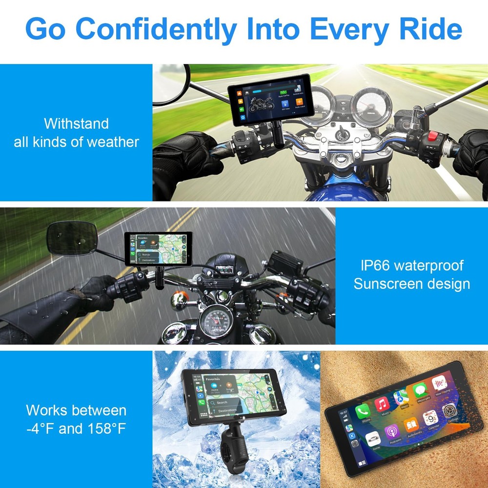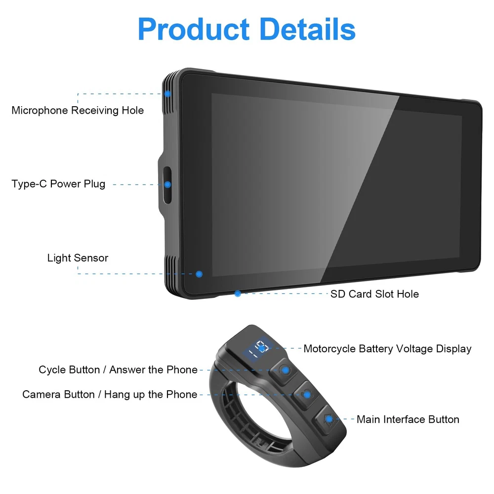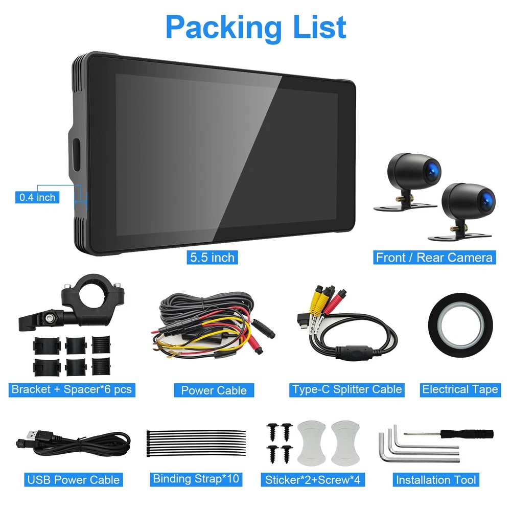 Portable Motorcycle Dash Cam, Motorcycle Wireless Apple CarPlay & Android Auto, IMX 307 Dual 1080P Dash Cam, Motorcycle DVR GPS, Digital display wire control, 5.5" Touch Screen, 128GB TF Card Wireless CarPlay & Android Auto & Voice Control portable motorcycle carplay screen supports wireless connection to CarPlay and Android Auto, and displays smartphone apps and entertainment functions on the device screen. You can freely enjoy MUSIC, NAVIGATION, CALLS, and more while driving. It can be voice-controlled through Assistant. With Siri and Google assistant, the function you want can be easily controlled. Revolutionary Dual Motorcycle Camera The front and rear cameras of the motorcycle dash cam use high-definition 7-glass lens, which improves recording performance in low brightness environments. The FHD 1080P resolution allows for 200-megapixel high-speed video recording. The WDR/HDR function can prevent video from being too dark or overexposed, automatically correcting brightness differences in nighttime and tunnel scenes, and recording vivid videos. 5.5-inch HD IPS Large Touch Screen & automatic brightness All operations can be completed on the carplay touch screen. It supports video playback with a resolution of 960 x 480, displaying vivid details that are visible even in outdoor sunlight, ensuring your comfort. It built-in automatic light-sensing chip that adjusts the screen brightness according to the environmental light, automatic brightness. Waterproof, Dustproof, & Shockproof Design Motorcycles are often exposed to environments such as sand, dirt, mud, rain, and vibration on the road, requiring higher performance in waterproof and shockproof resistance. The motorcycle GPS body and dual cameras can achieve IP66 waterproofing, allowing for worry-free use even on rainy days! Due to the added shock resistance, it can withstand continuous vibrations and rough road conditions and can be used in a variety of environments. Easy Installation, Suitable for All Motorcycles This motorcycles gps navigator comes with a mounting kit and tools. The mounting kit and screw design make it easy to install on any motorcycle, attaching it to the motorcycle's handlebars. Built-in high-sensitivity antenna enables faster positioning and more responsive interactions. What You Get stand behind our products and offer a 12-month warranty and technical support for our motorcycle GPS navigator. If you have any questions or concerns, we will give you a 100% satisfied solution within 24 hours. 【 Wireless CarPlay & Android Auto & Voice Control 】portable motorcycle carplay screen supports wireless connection to CarPlay and Android Auto, and displays smartphone apps and entertainment functions on the device screen. You can freely enjoy MUSIC, NAVIGATION, CALLS, and more while driving. It can be voice-controlled through Assistant. With Siri and Google assistant, the function you want can be easily controlled. 【Revolutionary Dual Motorcycle Camera】The front and rear cameras of the motorcycle dash cam use high-definition 7-glass lens, which improves recording performance in low brightness environments. The FHD 1080P resolution allows for 200-megapixel high-speed video recording. The WDR/HDR function can prevent video from being too dark or overexposed, automatically correcting brightness differences in nighttime and tunnel scenes, and recording vivid videos. 【 5.5-inch HD IPS Large Touch Screen & automatic brightness】All operations can be completed on the carplay touch screen. It supports video playback with a resolution of 960 x 480, displaying vivid details that are visible even in outdoor sunlight, ensuring your comfort. It built-in automatic light-sensing chip that adjusts the screen brightness according to the environmental light, automatic brightness. 【 Waterproof, Dustproof, & Shockproof Design 】Motorcycles are often exposed to environments such as sand, dirt, mud, rain, and vibration on the road, requiring higher performance in waterproof and shockproof resistance. The motorcycle GPS body and dual cameras can achieve IP66 waterproofing, allowing for worry-free use even on rainy days! Due to the added shock resistance, it can withstand continuous vibrations and rough road conditions and can be used in a variety of environments. 【 Easy Installation, Suitable for All Motorcycles 】This motorcycles gps navigator comes with a mounting kit and tools. The mounting kit and screw design make it easy to install on any motorcycle, attaching it to the motorcycle's handlebars. Built-in high-sensitivity antenna enables faster positioning and more responsive interactions. 【What You Get】stand behind our products and offer a 12-month warranty and technical support for our motorcycle GPS navigator. If you have any questions or concerns, we will give you a 100% satisfied solution within 24 hours.