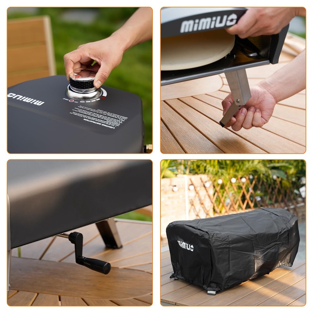 Outdoor Gas Pizza Oven Portable Propane Pizza Grilling Stove with Manual Rotation System, Oven Cover, Pizza Stone and Pizza Peel Product Details Brand: Mimiuo Special Feature: Portable, Rotating Stone Control Type: Knob Control Included Components: Baking Pan Power Source: Gas Brand: Mimiuo Special Feature: Portable, Rotating Stone Control Type: Knob Control Included Components: Baking Pan Power Source: Gas Temperature Range: 5E+2 Degrees Celsius Manufacturer: Mimiuo Product Dimensions: 23 x 13 x 9.2 inches Item Weight: 30.7 pounds Date First Available: August 16, 2023 Portable Outdoor Gas Pizza Oven- Specially designed to be relatively lightweight for outdoor application, either portable or transportable, cooking with portable gas pizza oven means serving up fantastic dishes in your garden backyard, at the beach or any outdoor space. Gas PoweredInstant flame and adjustable flame intensity knob preheat the oven to the most suitable pizza baking temperature effortless, heat the oven up to 500C in just 10-15 minutes, and a 13 or 12 inch pizza will be baked in 1 minute. Manual Rotation SystemTurn the pizza stone by rotating the handle, the creative rotating system makes it easy to turn the pizza according to individual needs for more even heating. Easy to Install, Operate & Clean- Assembles and installs in minutes with no tools. Fast, easy way to bake fresh/frozen pizza! Just apply some stainless steel cleaning solution to the outside of your unit by a small towel or rag. Perfect Pizza Grilling Oven KitInclude 1x gas oven, 1x 13" round pizza stone, 1x aluminum pizza peel, 1x protective oven cover. The cordierite pizza stone has super high temperature resistance (up to 1204C) and robust stability, tolerates an implausible amount of heat, it pulls outer moisture off dough and promotes perfect crust, leaving the inside moist and fluffy.