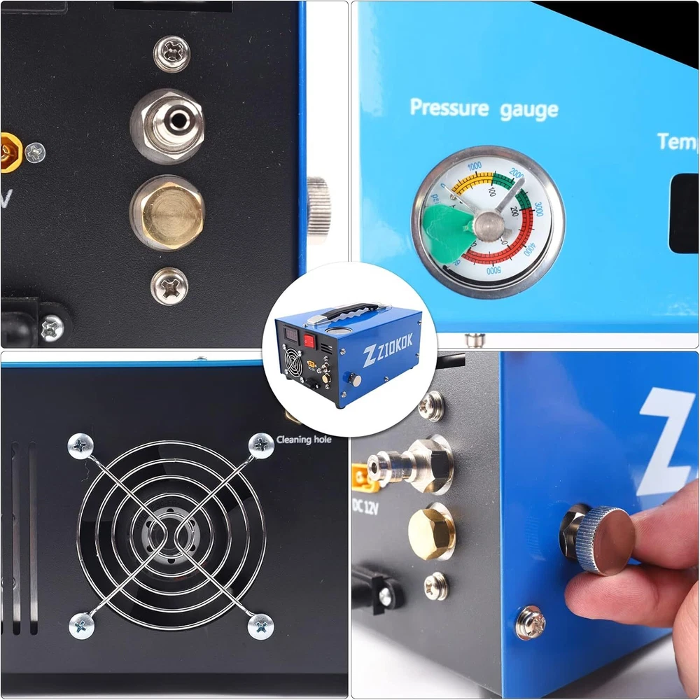 Product Description Package included: 1 x PCP Air Compressor 1 x AC Power Cord 1 x Battery Clip Cord 1 x Air Hose 1 x Accessory Kit 1 x Detailed Instruction Portable PCP Air Compressor-4500PSI High performance and durable This is a brand new PCP air compressor with fast charging speed. It takes about 18 minutes to inflate a 0.5 liter cylinder from 0 to 300 bars. The compressor has the characteristics of excellent performance, easy operation and simple maintenance, which can be powerer by AC 110V or car DC 12V. The rated power is 350 watts. It can easily handle air gun inflation at home or in the wild. Auto-stop Built-in Adapter Oilless and Waterless Efficient Cooling Fan Large Filter Newly Upgraded Portable Car or Home PCP Air Gun Compressor: BUILT-IN POWER ADAPTER can be powered by the 12V car battery, also can be powered by the home 110V/220V AC. Inflate your equipment PCP air rifles, air pistols, paintball guns, and HPA tanks anywhere and make it ready for action anytime. 8MM Quick Connector & Oil-Water Separator: The inflation nozzle is a 8MM female port, which can be quickly connected and disconnected. It is suitable directly for nipples of PCP air rifles/pistols and paintball tanks.The activated carbon separator on the hose can be used repeatedly. It can efficiently filter oil and water in the air and output clean and dry high-pressure air. Water/Oil-Free & Oil-Moisture Filter: There is no need to add oil and circulating cooling water, which reduces the trouble of connecting an additional water pump and simplifies the operation. The built-in high-power fan can improve the cooling efficiency greatly and make the compressor fill your airgun continuously. The temperature monitoring function is added this time. When the temperature reaches 90 degrees, please shut off the compressor for cooling and keep the cooling fan running. Features & Details Newly Upgraded Portable Car PCP Air Gun Compressor: BUILT-IN POWER ADAPTER can be powered by the 12V car battery, also can be powered by the home 110V/220V AC. Inflate your equipment PCP air rifles, air pistols, paintball guns, and HPA tanks anywhere anytime.The Air Compressor can easily achieve 300Bar/4500Psi/30Mpa.It is recommended that the air cylinder volume is limited to 1L (60ci).The net weight is 5-8 kg.The top side is slightly larger than your open palm convenient to carry and store. Oil/Water-Free & Oil-Moisture Filter: The Air Compressor no need to add oil and circulating cooling water, which reduces the trouble of connecting an additional water pump and simplifies the operation.Instead, a high-power side fan is built-in to dissipate heat. An oil-moisture filter has been integrated at one end of the hose. It can efficiently prevent oil and moisture from corroding your airguns or air tanks. 8MM Quick Connector & Oil-Water Separator PCP Air Compressor: The inflation nozzle is a 8MM female port, which can be quickly connected and disconnected.The activated carbon separator on the hose can be used repeatedly. Inflating Speed: 500CC tank, from 200BARS to 300BARS takes about 7-9 minutes;The duty cycle of this pump is: continuous inflation for 25 minutes and rest for 10 minutes. The rated power of this air compressor is 350W. Small Weight & Compact size & high quality: The Air Compressor net weight is 5-8 kg.The top side is slightly larger than your open palm convenient to carry and store. What you will get: 1 x PCP Air Compressor,1 x AC Power Cord,1 x Battery Clip Cord,1 x Air Hose,1 x Accessory Kit,1 x Detailed Instruction. Every compressor from us has a one-year worry-free warranty. Providing customers with high-quality products and services is our constant pursuit.