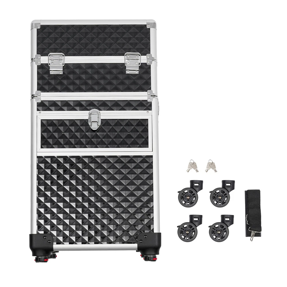 Rolling Makeup Case Travel Cosmetic Storage Box,Moving Salon Beauty Trolley Case Professional Rolling Makeup Train Case, Multi-functional Cosmetic Trolley, Large Storage Traveling Cart Trunk Description Are you still worried about too many cosmetics and inconvenient to carry? Then take a look at our rolling makeup case. It is mainly made of premium materials and features large capacity storage with multiple tiers, fully meeting needs. It will become an ideal purchase for every beauty girl, make-up artist, and hair stylist. Key Features Sturdy and Durable: It is made of high-quality ABS and aluminum alloy with an oxidation process , making it waterproof, anti-scratch , and resistant to wear and corrosion , ensuring its long service life. Large Capacity: The top compartment consists of a tray and 2 sliding drawers. Meanwhile, the top tier can be used separately as a small makeup case with an adjustable shoulder strap for easy carrying. The second tier is equipped with removable flaps to keep your cosmetics organized. There is also a large storage space at the bottom for hair tools, cosmetics and a nail lamp. High Load Capacity: The rectangular structure and high quality materials ensure that it can hold items weighing up to 110 lbs , so you can rest assured that your daily toiletries will fit inside! Thoughtful Design: An adjustable pull rod suits your height with less sway and the four universal wheels with brakes on the bottom help you move this product smoothly and conveniently. High Safety: The latches, built-in lock cores, and equipped keys allow you to lock and unlock the product for added security when you are out. Portable : This product can be handheld, cross - body, pushed and pulled, making it c onvenient to Carry when traveling . Easy to Clean: Thanks to its smooth surface and simple construction, you can clean it with a wet rag. Ideal Gift: Its smooth and simple lines and stylish look present a young and modern style, together with its large capacity, making it an excellent gift for various holidays to your friends and family. Protective Package: We have packaged this product in foam and air bubble bags designed to minimize damage to the product during shipping. Details Ergonomic Handle: It provides a comfortable grip and can reduce hand pressure while allowing for convenient carrying. Shoulder Strap: The adjustable shoulder strap can be convenient for you to carry the product for use on the go. Application It's ideal for professional make-up artists, hair stylists, beauticians, nail tech students, or anyone who owns a lot of make-up. It can be used to store cosmetics and beauty tools, such as foundation powder, lipstick, hair wax, eye shadow, curling iron, mascara, eyebrow pencil, nail polish, and comb. Specification Color: Silver and Black Process: Oxidation Material: ABS and Aluminum Alloy Style: Modern Shape: Rectangular Assembly Required: Yes Mounting Type: Floorstanding Load Capacity: 50kg/110lbs Total Height of Box: 73cm/28.7in Product Size: 35*25*97.5cm/13.8*9.8*38.4in Package Size: 80*38*28cm/31.5*14.96*11.02in Gross Weight: 9kg/19.84 lbs Net Weight: 8kg/17.64 lbs Package Included 1* Rolling Makeup Case 1* Shoulder Strap 4* Keys 4* Wheels Notes Please note that cosmetics are not included. Please use this product within its carrying capacity. It's normal for the tie rod to wobble a little bit as it needs clearance to move back and forth better. If it is too tight, it will harm the tie rod instead. Please make sure you don't mind before purchasing. The service wear of the case is a normal phenomenon. In the process of daily use, please try to avoid excessive impact and drop to extend the lifespan of the product. Please clear the wheels in time to maintain smooth movement. Please allow the slight color difference caused by the shooting light and 1-3cm error due to manual measurement, and make sure you do not mind before ordering. Payment Delivery details Terms of sales About us Contact us Payment We accept ebay payment 。 Fees such as import duties, taxes are not included in the item price or shipping costs. These charges are the buyer's responsibility. Delivery details Shipping: 2-9 working days to: USA Terms of sales We maintain high standards of excellence and strive for hundred percent customer satisfaction. Feedback is very important to us. We hope that you contact us immediately before you give neutral or negative feedback, so that we can address your concerns. It is impossible to address issues if we do not know about them! About us Your satis faction is our ultimate goal. We work hard to earn your trust and future business. Our certified technicians have tested each item before shipping. The unit comes with 1 year limited warranty on all manufacturing defects. a) If you receive a defective item, you may return it or ask for a discount. Please contact us within 14 days after you receive the package. b) What you returned must be intact and in its original packaging as re? u. Customer is responsible for shipping costs of the returned item. c) We will cover the cost of shipping back t with the shipping rate indicated in the registration page. We will send you a new unit or refund the full payment you paid. Thank you. Contact us Business Hour Business Hour: Monday To Friday: 8:30 AM to 5:00 PM (Beijing China time) Due to time zones, our reply to your questions may not be immediately. But within above working time, we will reply your email within 24 hours. If it's non-workdays, please kindly be patient and wait till Monday. Please contact us with ebay message. Please feel free to contact us if you have any questions. Monday To Friday: 8:30 AM to 5:00 PM (Beijing China time) Due to time zones, our reply to your questions may not be immediately. But within above working time, we will reply your email within 24 hours. If it's non-workdays, please kindly be patient and wait till Monday. Please contact us with ebay message. Please feel free to contact us if you have any qu