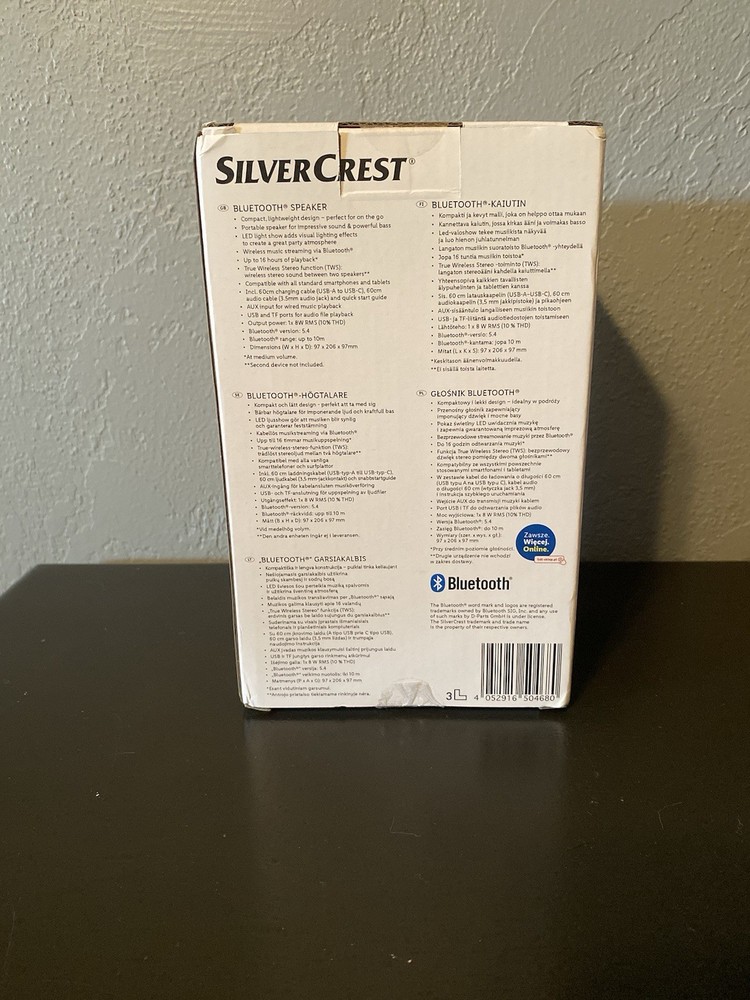 The product is a portable Bluetooth speaker with LED lights by the brand SILVERCREST. It features a cylindrical shape, built-in microphone, and a single speaker configuration. This compact and lightweight speaker is battery-powered with a rechargeable 5-hour battery life and a wireless range of up to 33 feet. With an RMS power of 3W, it is suitable for various occasions such as travel, home, outdoor, and parties. It also has control buttons for volume, play/pause, power, and pairing, and is compatible with universal Bluetooth devices.
