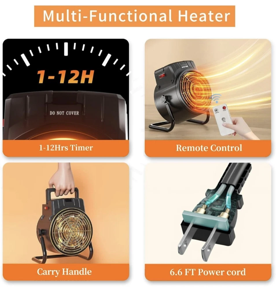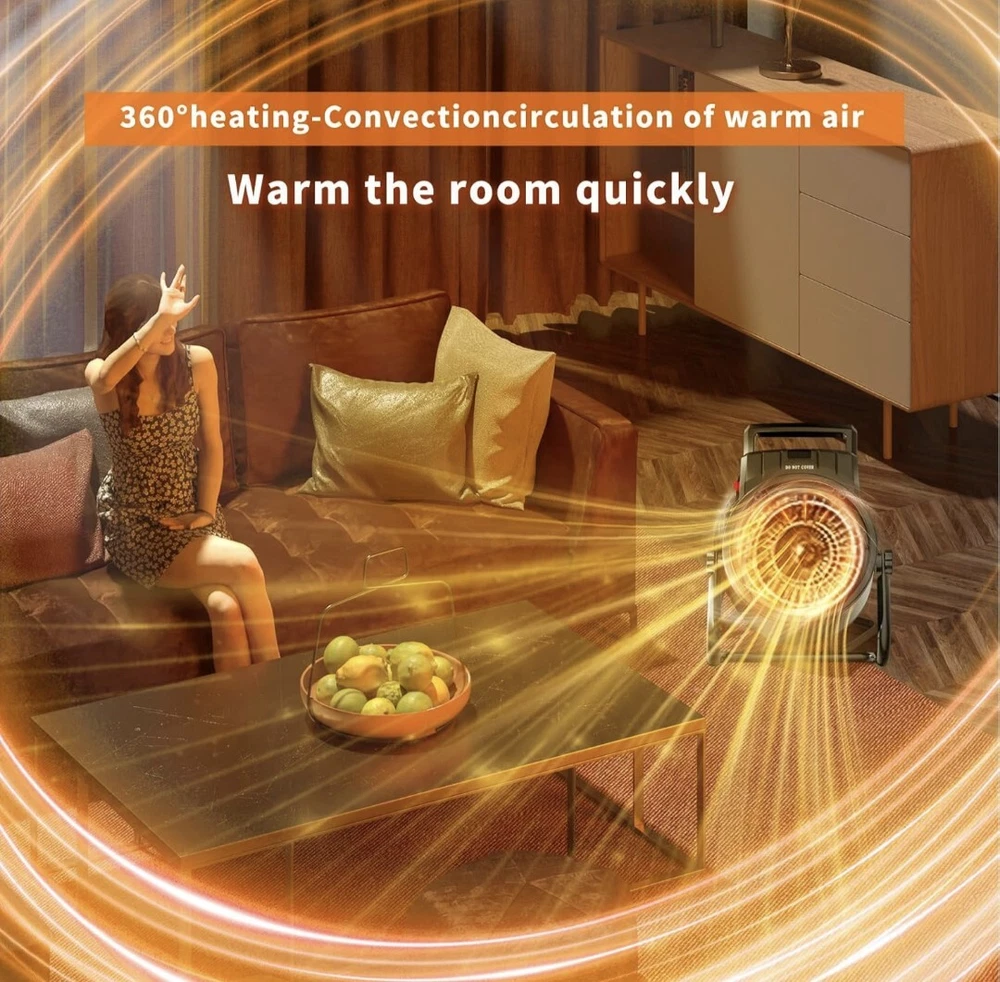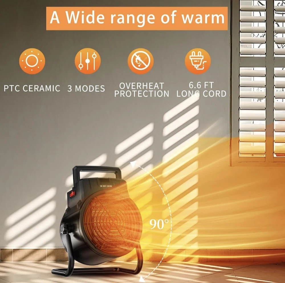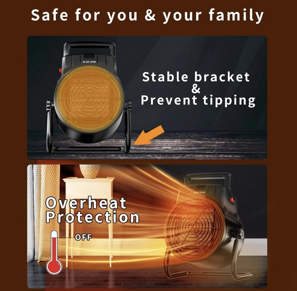 【3 Modes Electric Heater】: ☀1.High Heat (1500-watt), 2. Low heat (750 -watt) 3. Natural Fan will blow out cool air. Adjust the thermostat knob to your comfortable temperature. Reduce your energy bills by using this energy efficient office small heater to heat. You can enjoy life ALL seasons! 【Long Cord Compact Size Heater】: This space heaters for indoor use has a compact size, 7.1 × 6.3 × 10 inches. The 6.6 FT power cord provides flexibility, while the heater's 0-90° rotation capability allows you to customize the angle for your comfort. it can be conveniently placed on tables, under your feet, or anywhere you need warmth. Perfect for use in the living room, bedroom, garage, greenhouse, tent etc. 【Fast Heating & Safety Protection】: The powerful 1500W electric space heater features PTC ceramic heating technology that enhances warm air circulation, producing hot air in just 3 seconds.The heater is made of flame retardant material and will automatically turn off when the internal temperature reaches the thermal protection temperature 【Stable bracket & Prevent tipping】Update Stable Bracket avoids the danger caused by accidental dropping of the electric space heater. This not only extends the life of the outdoor heater, but also greatly increases the safety of use and creates a warm space in the cold winter. 【Fully Assembled】: Allows you to take the heater out of the box and have it working it minutes. Simply plug the heater into a wall outlet, adjust the thermostat, and enjoy the warmth from your new VCJ space heater.