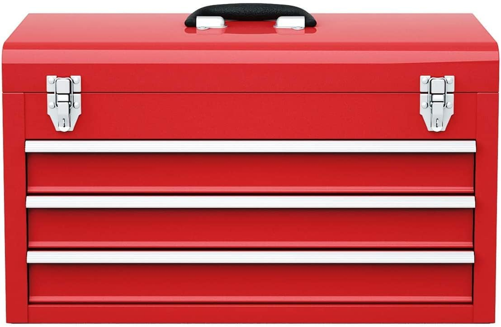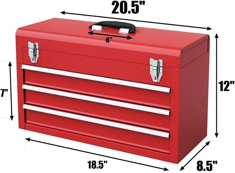 3 Drawers & Top Storage Tray: Equipped with a top tray and 3 drawers, this tool box organizer provides ample storage space for your tools, art & craft supplies, medicine and more. Besides, each drawer features easy-to-pull and silent ball bearing slides, giving you easy access to the items inside. Heavy Duty Steel Construction: This portable tool box is crafted from high quality reinforced steel, which ensures strong stability, load capacity and is not easy to deform. In addition, covered with premium powder coating, this tool storage chest is rustproof and wear-resistant to support a long service life. Double Latches & Protective EVA Mats: This 3-drawer toolbox comes with 2 steel latches, allowing you to lock the box and prevent your tools from falling out. What's more, the top tray and each drawer are lined with soft and anti-slip EVA foam to protect the box surface from scratching. Portable Design & Wide Application: The comfortable and easy-to-grip top handle makes it easy for you to carry this tool box anywhere. This high quality steel tool box is a good helper for auto mechanics, handyman, repairman, construction workers, carpenters and is perfect to be used in the home, garage, workshop, etc. Stylish Look & Easy Maintenance: The red finish and sleek design give this tool box a sense of fashion and make it an eye-catching addition to your home. Moreover, the smooth and scratch-resistant surface is easy to wipe clean with damp cloth. Overall size: 20.5" x 8.5" x 12" (L x W x H); net weight: 18 lbs. Description: This portable 3-drawer steel toolbox will be a great assistant for your daily life! Made of sturdy steel frame with premium powder coating, this tool box ensures excellent stability, wear resistance and rust resistancefor years of use.The top tray and 3 drawers provide a large storage space for your tools. The double-latch design makes it safer to use while the EVA foam liners help to protect the box surface from scratches .Besides, equipped with ball bearing slides, the drawers can be pulled out and pushed in easily and quietly. Our stylish and practical tool box is ideal for household use, DIY work, art andcraft storage.With the portable handle, you can carry it anywhere with ease. Features: Heavy dutysteel construction and rustprooffinish support long-lasting use 3 drawers and top tray offer good organizationfor your tools Equipped with2steel latches to lock the box for added security Easy-to-grip and anti-sliphandle for convenient carrying Ball bearing slidesmake it easy topull out and push inthe drawers Soft and non-slip EVA liners protect the surface from scratching Perfect tool box for home, office or automotive repairs maintenance Specifications: Color: Red Materials: Steel Overall Dimension: 20.5" x 8.5" x 12" (L x W x H) Number of Drawers: 3 (with top layer) LoadCapacity of Each Drawer: 22 lbs Net Weight: 18 lbs Package Includes: 1x Toolbox
