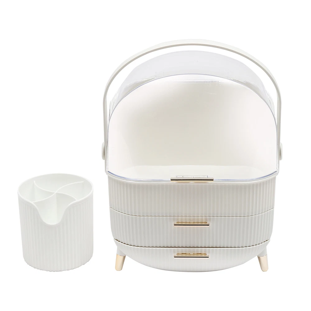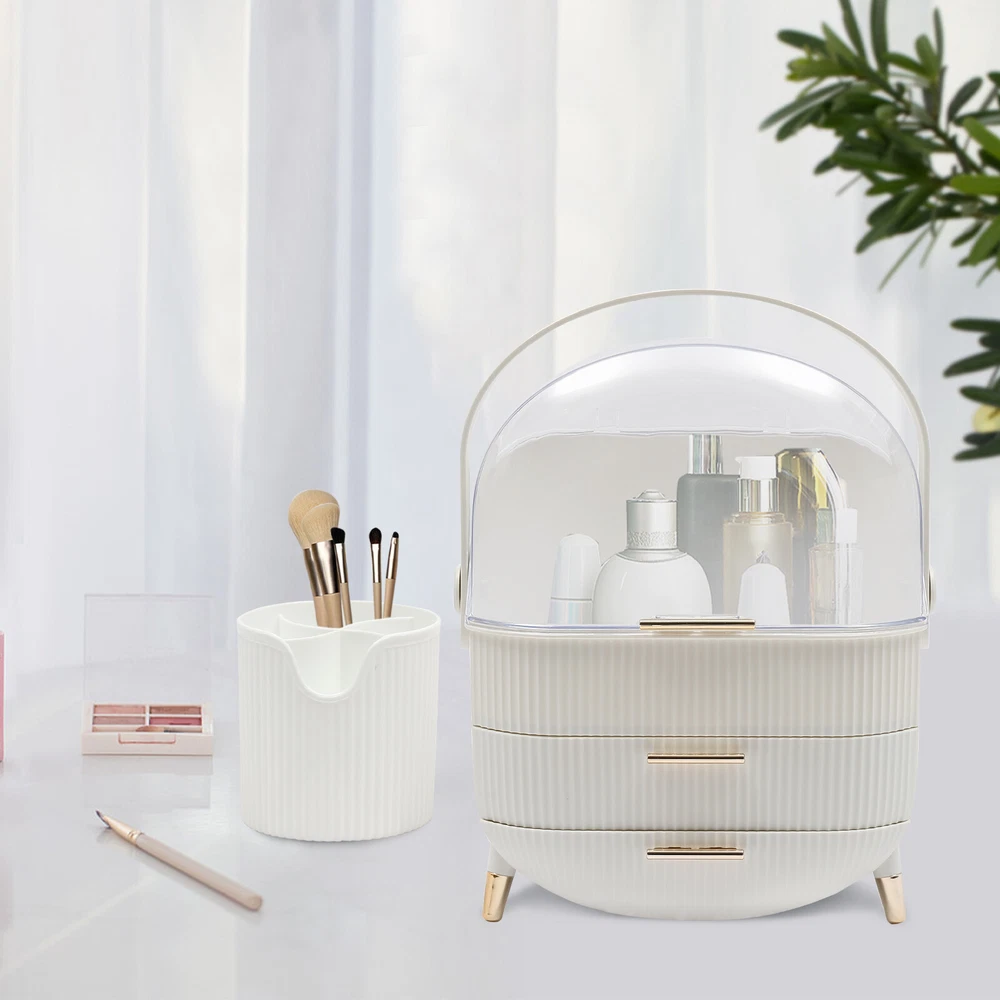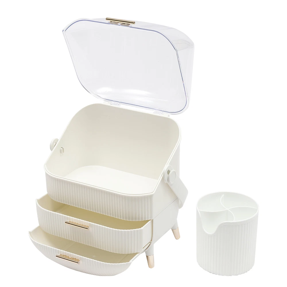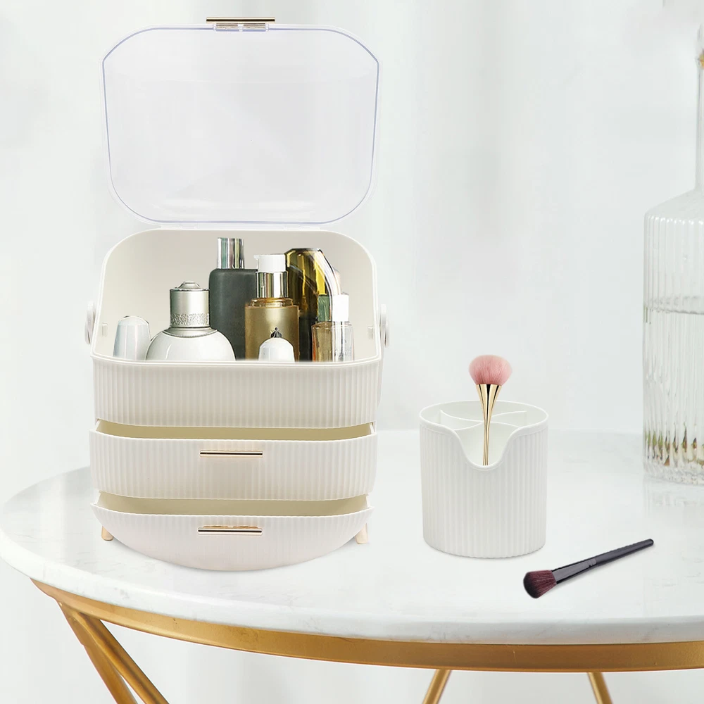 Description Portable Make Up Organiser Made of high-quality HIPS and PS materials, this high-value portable make up organiser has a large capacity and can effectively hold most of your cosmetics. It also comes with an extra brush barrel so that your makeup brushes have their place too. While the carry handle design makes it very easy to carry as well, bringing unparalleled convenience to your life!Details Hand-free Design: The flip-top lid can keep open on its own, and the hand-free design makes it easier for you to pick up cosmetics. Height-boosting Feet: It has a height-boosting design with 4 height-boosting feet to make it more stable to place