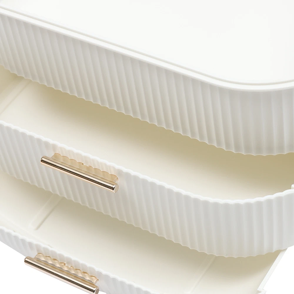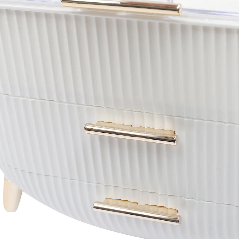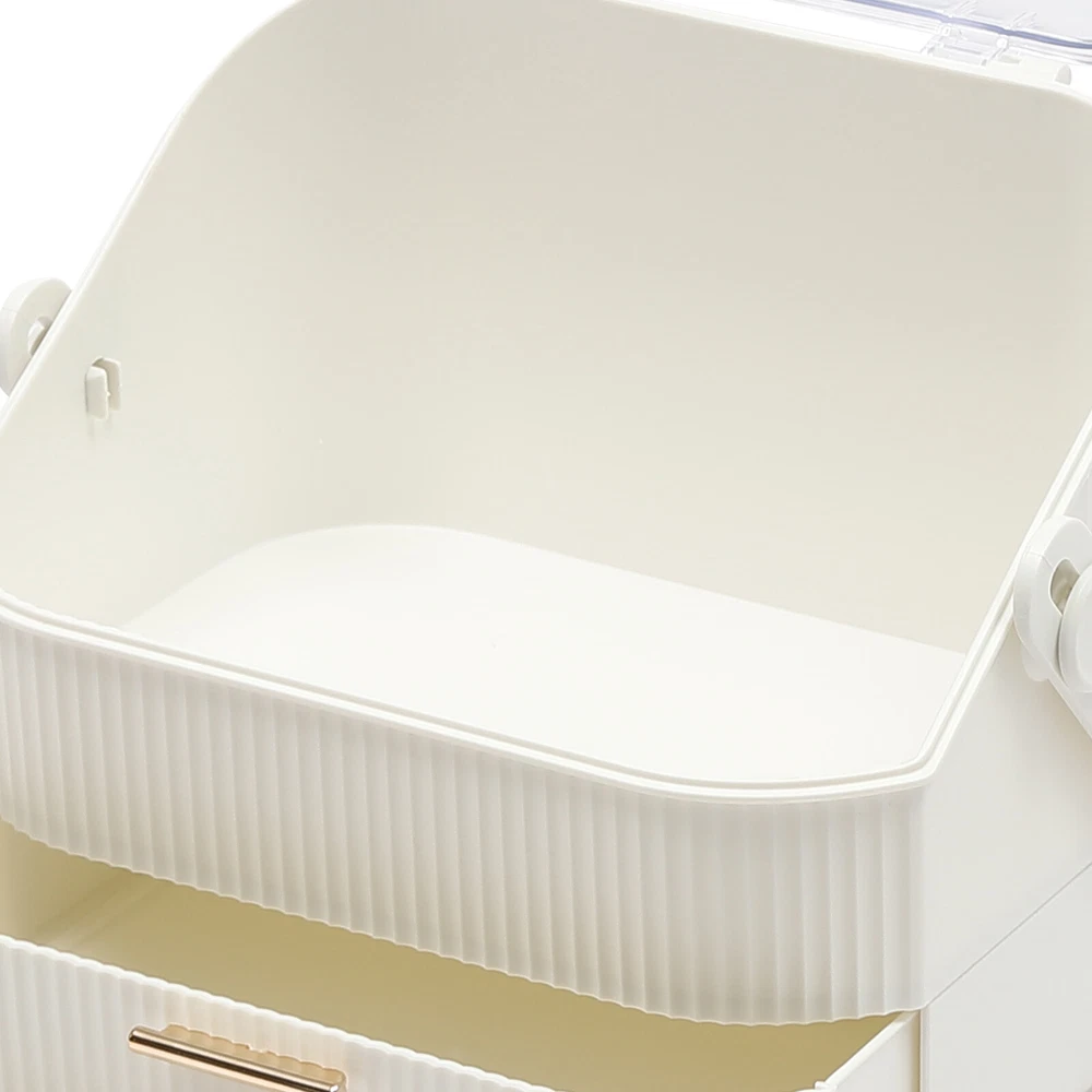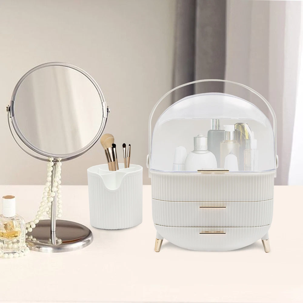 Description Portable Make Up Organiser Made of high-quality HIPS and PS materials, this high-value portable make up organiser has a large capacity and can effectively hold most of your cosmetics. It also comes with an extra brush barrel so that your makeup brushes have their place too. While the carry handle design makes it very easy to carry as well, bringing unparalleled convenience to your life!Details Hand-free Design: The flip-top lid can keep open on its own, and the hand-free design makes it easier for you to pick up cosmetics. Height-boosting Feet: It has a height-boosting design with 4 height-boosting feet to make it more stable to place