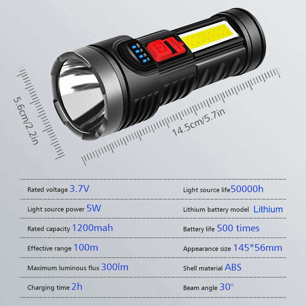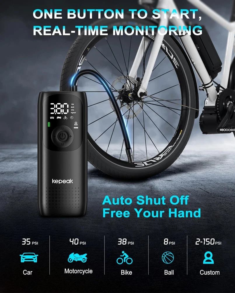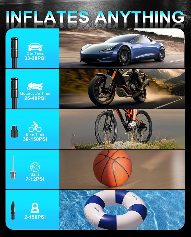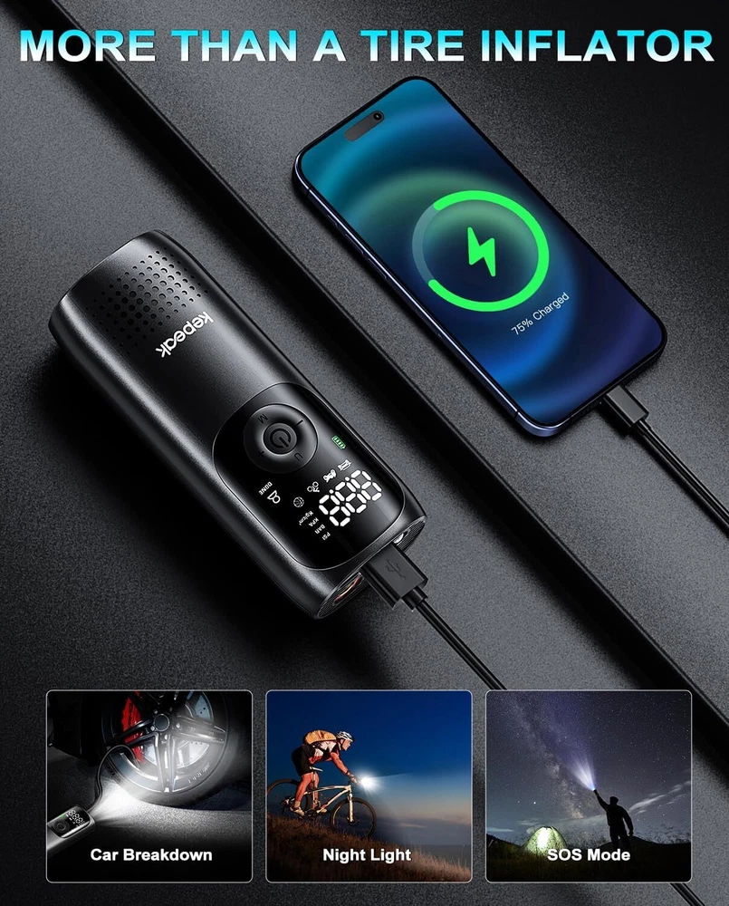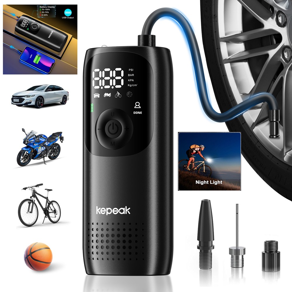 Note: Model B Only USB Flashlight,not include Cordless Tire Inflator Pump!!!! A: Cordless Tire Inflator Pump About this item [One-Click Operation, Auto-stop] You can select from (bicycle, motorcycle, car, ball, custom) 4+N preset modes, and 4 preset units (PSI, KPA, BAR, KG/CM²), which makes this portable tire inflator for car super user friendly. With its one-button design, the portable tire inflator starts inflating with just a simple press. Once the desired pressure is reached, the tire inflator portable automatically stops, no more having to drive to the gas station [Accurate, Daylight Viewable LED Screen] Easy to read even under sunlight, the digital screen displays the target value first, flashes for 3s, and then shows the real-time pressure, the built-in pressure gauge of tire pump with +/- 1.5 PSI accuracy, this car tire air pump portable allowing you to inflate tires to the desired pressure level precisely, don't overinflate or underinflate your tires [All in One Device - Tire Inflator, Flashlight, Power Bank] Not only for tire inflation, 3 modes LED light provide convenience for inflating and changing tires in the dark. USB-C input and USB-A output port, as an emergency power pack for your phone. The car air pump is designed to be practical and hassle-free in any situation [Cordless Inflation, Sto re with Ease] Wireless battery-charged design enables the car tire pump to have easier air inflation. Weighing only 0.93 pounds, the compact size and lightweight tire air pump is convenient to carry around or store in your glove box, trunk, bicycle rack, car, or backpack [Supports Presta Schrader Valve] The air pump for bike tires comes with a Presta valve, connecting the hose directly to Schrader valves, ball needles, and swim rings nozzle, the variety of nozzle attachments included make the tire pump for car portable versatile enough to handle your inflation needs, such as bikes, motorcycles, cars, balls, and small floats Does the tire inflator air compressor support Presta valves? Yes, this bike pump portable come with a presta valve adapter. Which nozzle do I use this car tire air compressor to fill my car tires? Use the nozzle on the hose, this cordless tire pump is no need other attachment for car tires. Is this car tire pump portable suitable for inflating bike tires, motorcycle tires, car tires? Yes, this cordless inflator is suitable for inflating bike tires, motorcycle tires, car tires. it includes a Presta valve adapter, allowing it to be used as a bike tire compressor. Does this portable car compressor automatically shut off when desired pressure is reached? Yes, this portable car pump is easy to use and it will automatically shut off once the desired pressure is reached. =========================================== B: USB Bright Flashlight Feature: 1.USB Rechargeable: Micro USB charging port, supports multiple charging methods, making charging more convenient. 2.Four-level Real-time Power Display: Charging indication: the blue light flashes when charging and stops flashing after fully charged. 3.4 Lighting Modes: strong light-low light-strobe-COB side light. 4.Built-in Large-capacity Battery: 1200mAh lithium battery will allow this headlight to provide long lighting time. 5.Durable to Use with Great Performance: High-quality and high-strength ABS mater ial, large aluminum reflector, high light-gathering performance, enhanced long-distance effect, can emit comfortable and smooth spots. 6.Fast Heat Dissipation: Thick aluminum lamp cup, large area heat dissipation design. 7.Waterproof Design: Waterproof design allows this headlight to be suitable for outdoor use, especially in rainy days, but cannot be immersed in water. 8.Wide Application: It is suitable for outdoor activities, such as fishing, hunting, climbing and camping. Specification: Type: USB Rechargeable Camping Headlight Size: 145.5 * 57mm Waterproof Grade: IPX4 Battery Capacity: 1200mAh 4 Lighting Modes: strong light-low light-strobe-COB side light Micro USB charging port, supports multiple charging methods. Four-level real-time power display, charging indication: the blue light flashes during charging, stops flashing, charging is complete. Four lighting modes, strong light-low light strobe flash-core rod bright side light. Built-in large capacity rechargeable lithium-ion battery. High-quality high-strength absorbing material, large aluminum reflector, high light-gathering performance, enhanced long-distance effect, can emit a comfortable and soft spot. Transparent thick aluminum cup, large area heat dissipation design. Portable flashlight, size as picture, service life waterproof ipx4, not immersed in water. Package Included: 1 * Flashlight 1 * USB Charging Cable