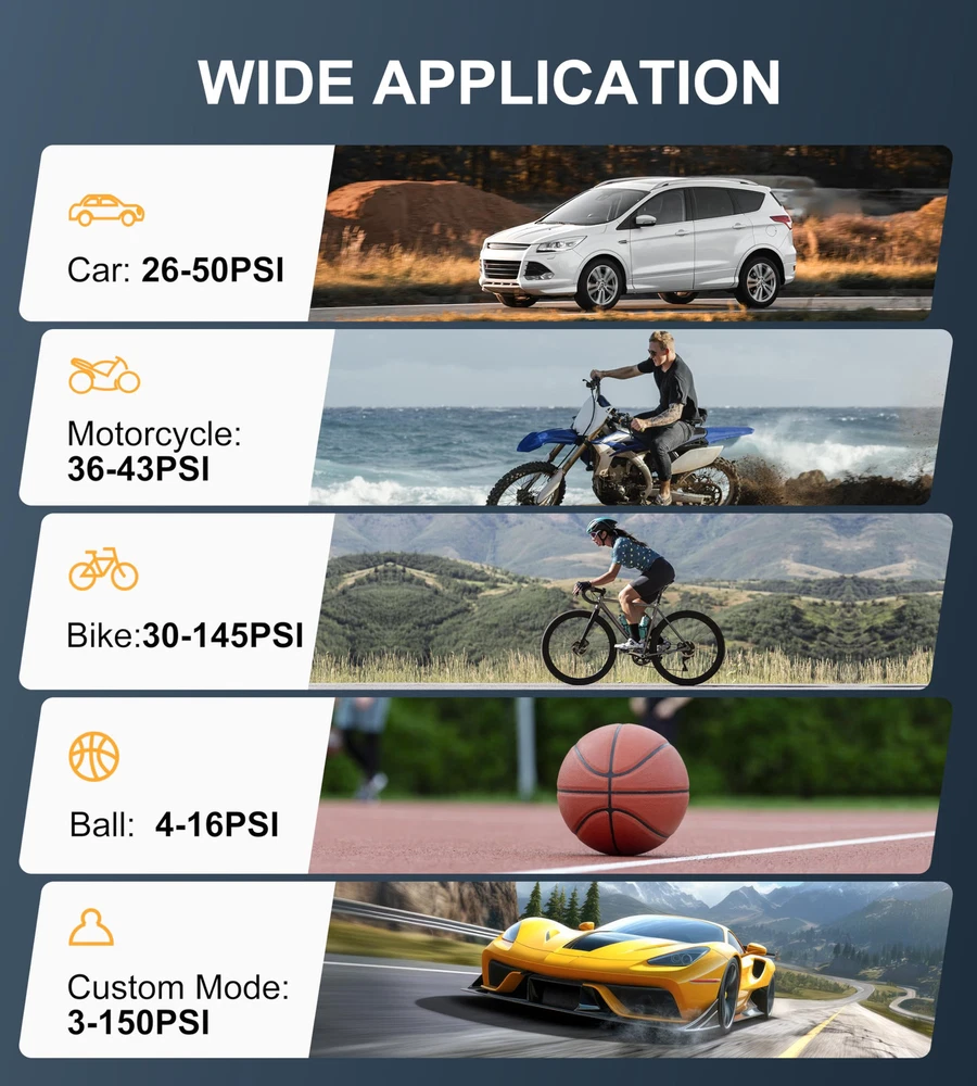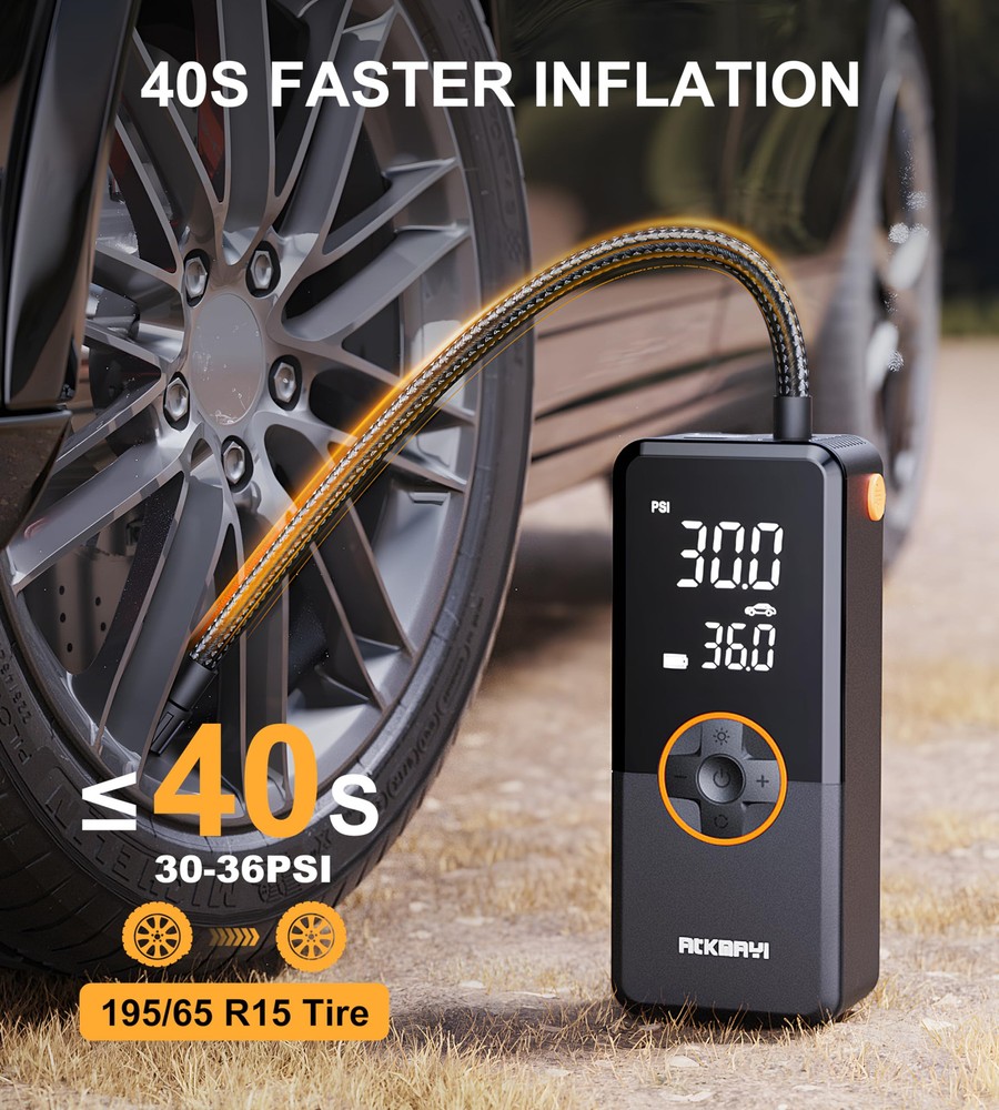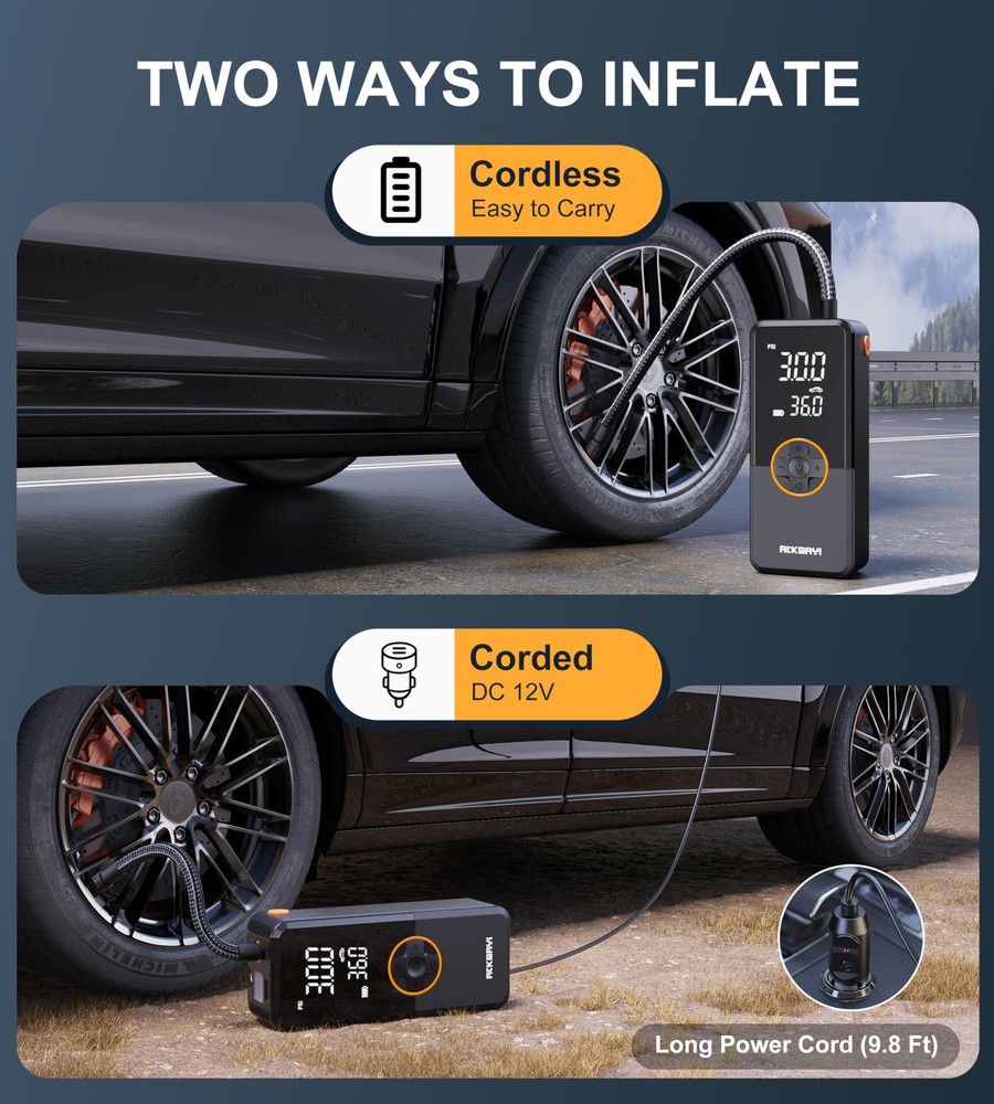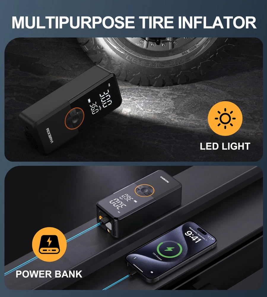 Fast Inflation — cordless tire inflator can inflate tires quickly with a maximum pressure of 150 PSI and airflow of 35L/Min. In just 40 seconds, the pump can inflate a car tire (195/55/R15) from 30 to 36 PSI Multiple Uses — Equipped with different air nozzles, this portable air compressor is ideal for inflating cars, motorcycles and bicycle tires. As well as to be used to inflate sports balls, pool toys and other inflatables. NOTE: not suitable for truck tires Dual Power Supply — This tire inflator comes with a rechargeable battery and can inflate the automotive directly after a full charge. You don't need to worry if the battery runs out on the road because the portable air compressor has a 12V DC power cord for Road Rescue emergencies Automatic Stop & Bright LED Light — Preset the value you want and the tire pump can automatically stop when the preset value is reached, making it safer. The bright LED light makes it easy to use when visibility is low and helps you prepare for emergencies Easy to Use — This tire inflator features 4 preset modes and 4 pressure units. The custom mode can also set pressure values based on the inflation object to meet various needs. It is an essential product for daily life and travel