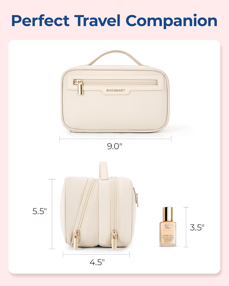 Store New Arrivals Add to Favorite View Feedback Contact Fast deliveries to the customer's home Quality customer service John Make the customers happy! Travel Makeup Bag, Portable Make up Bag, Wide-Open Makeup Organizer Cosmetic Bags for Women for Travel Essentials Travel-Size Toiletries Accessories Bottles, Brushes (Beige) Description 【Efficient Storage Solution】This makeup bag organizer is designed with multiple compartments. The front compartment is perfect for storing bottles of cosmetics and toiletries, and it also features two storage pockets inside for blushes and lipsticks. The rear compartment is spacious enough to hold large eyeshadow palettes, cushion Foundation, blushes and loose powders. Additionally, the zippered divider pocket can securely store eyeliners, mascaras, lip glazes, and other longer items. The PVC clear pocket is designed specifically for holding makeup brushes, sponges and puffs. 【Quick Access to Items】The BAGSMART travel makeup bag can be unfolded almost 180 degrees, providing a spacious opening for easy access to your cosmetics, toiletries, and other travel essentials. The exterior quick-grab pocket is thoughtfully designed to store small items for touch-ups, such as lip glosses and lipsticks. Measuring 9.0*4.5*4.5 inches, it's perfect for organizing your daily cosmetics and travel essentials for a week's travel! 【Easy-to-Clean Pockets】This makeup travel bag comes equipped with 1 PVC stain-resistant zipper pocket, ideal for storing a full set of makeup brushes, sponges, and powder puffs. A simple wipe-down keeps them clean, eliminating worries about makeup stains. 【Premium Quality】This BAGSMART cosmetic bag is made of water-resistant polyester for excellent durability and protection. This make up bag features custom metal zippers that ensure smooth operation, and a sturdy leather top handle that makes it easy to carry. Its well-organized interior, combined with its fashionable design and portability, make it an ideal choice for a stylish and convenient makeup bag. 【Versatility】With an elegant and charming appearance and available in 3 colours, this large makeup bag serves not only as a travel companion but also as a versatile toiletry bag, travel wallet, tech accessory organizer, travel accessory bag, or daily storage pouch. These cosmetic bags for women are perfect gifts for Women's Day, Valentine's Day, birthdays, anniversaries, Mother's Day, and other holidays. Product Description The video showcases the product in use. The video guides you through product setup. The video compares multiple products. The video shows the product being unpacked. BAGSMART's makeup bag strikes the perfect balance of comfort and style The BAGSMART travel makeup bag achieves a perfect balance of function and style through the combination of high-quality materials and versatility, making it an essential companion for your travels. With its generous multiple compartments , this makeup bag organizer is perfect for organizing your daily cosmetics for a week's travel or everyday use! Travel makeup bag with wide opening design for quick and easy access to beauty essentials. The BAGSMART makeup bag can be unfolded almost 180 degrees, providing a spacious opening for easy access to your cosmetics, toiletries, and other travel essentials. The internal zipped divider pocket to store eyeliners, mascaras, lip glosses and other longer items for quick and easy searching. And the exterior pocket is thoughtfully designed to store small items for touch-ups, such as lip glosses and lipsticks. Featuring easy-clean PVC pockets, it offers effective storage of makeup brushes, sponges and puffs, and spill-proof protection for your skincare and beauty products. Exquisite and practical makeup bag organizer. Crafted from water-resistant, durable fabric with metal zippers, this cosmetic bag is perfect as a travel organizer, daily organizer. These cosmetic bags for women are perfect gifts for Women's Day, Valentine's Day, birthdays, anniversaries, Mother's Day, and other holidays. This multi-functional makeup bag travel cosmetic bag offers effortless access, elegant organization, and easy maintenance, making it the ideal accessory for women on the go. BAGSMART Travel Cosmetic Bag Add to Cart Add to Cart Add to Cart Add to Cart Add to Cart Add to Cart Add to Cart Customer Reviews 4.5 out of 5 stars 302 4.5 out of 5 stars 119 4.8 out of 5 stars 47 4.7 out of 5 stars 6,731 4.7 out of 5 stars 1,994 4.5 out of 5 stars 515 4.7 out of 5 stars 56 Price $16.99 $ 16 . 99 $16.99 $ 16 . 99 $15.29 $ 15 . 29 $7.99 $ 7 . 99 $9.99 $ 9 . 99 $9.99 $ 9 . 99 $13.99 $ 13 . 99 Closure Type Smooth Zipper Stylish Tassel Zipper Dual-zipper Stylish Tassel Zipper Elegant Zipper Smooth Zipper Smooth Zipper Color Pink Pink Pink Pink Pink Pink Pink Wide Open Design ✔ ✔ ✔ ✘ ✔ ✔ ✔ Water-resistant ✔ ✔ ✔ ✔ ✔ ✔ ✔ Makeup Brushes Pocket ✔ ✔ ✔ ✘ ✔ ✔ ✔ Item model number BM0108052AN Color Beige Product Dimensions 9.4 x 5.9 x 1.6 inches Country of Origin China Item Weight 7 ounces Department Travel wide-opening cosmetic bag ABOUT US We offer the best prices around on high quality products. Our E-store includes media such as books, movies, music and games while offering electronics, toys, sporting apparel, clothing, tools, general home, garden items and more. SHIPPING We are always working hard to ensure your package arrives as soon as possible. Please understand that some factors like weather, high postal traffic, and the performance of shipping companies are outside of our control. We offer free shipping to the lower 48 states and ship within 2 business days of payment, usually sooner. We do not accept P.O. Boxes. Please provide a physical address. For shipping outside of the continental USA, we only use eBay's Global Shipping Program. The item is shipped to KY and then sent to the rest of the world. International customers are responsible for all duties and taxes. Continue to 'check