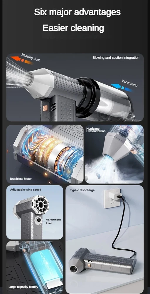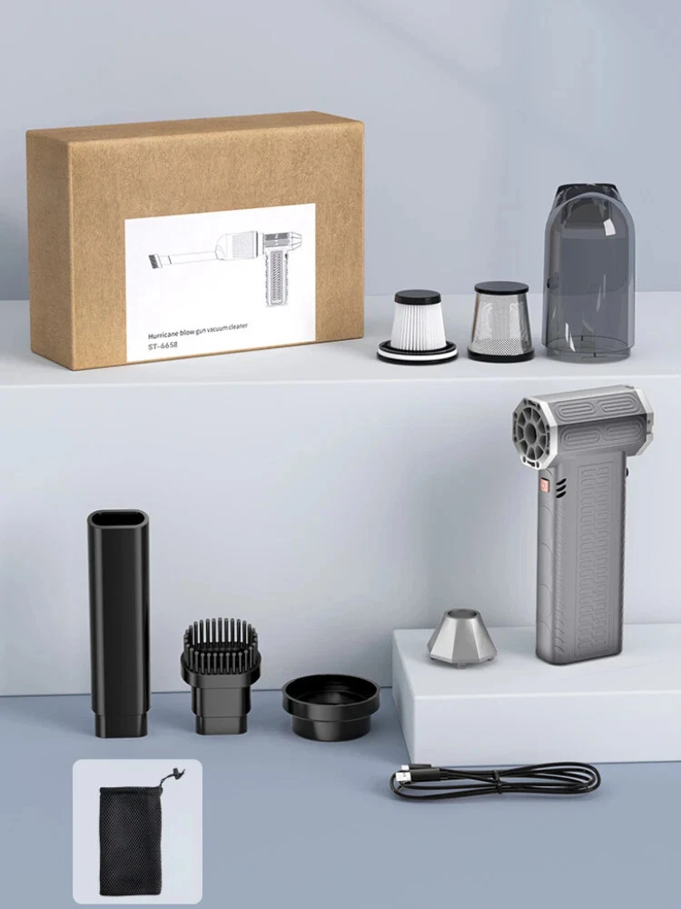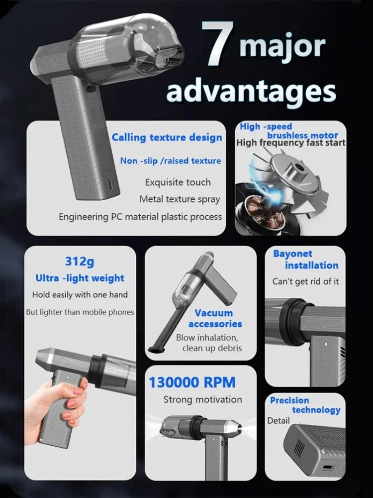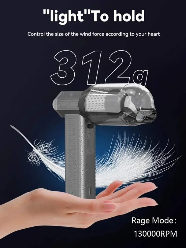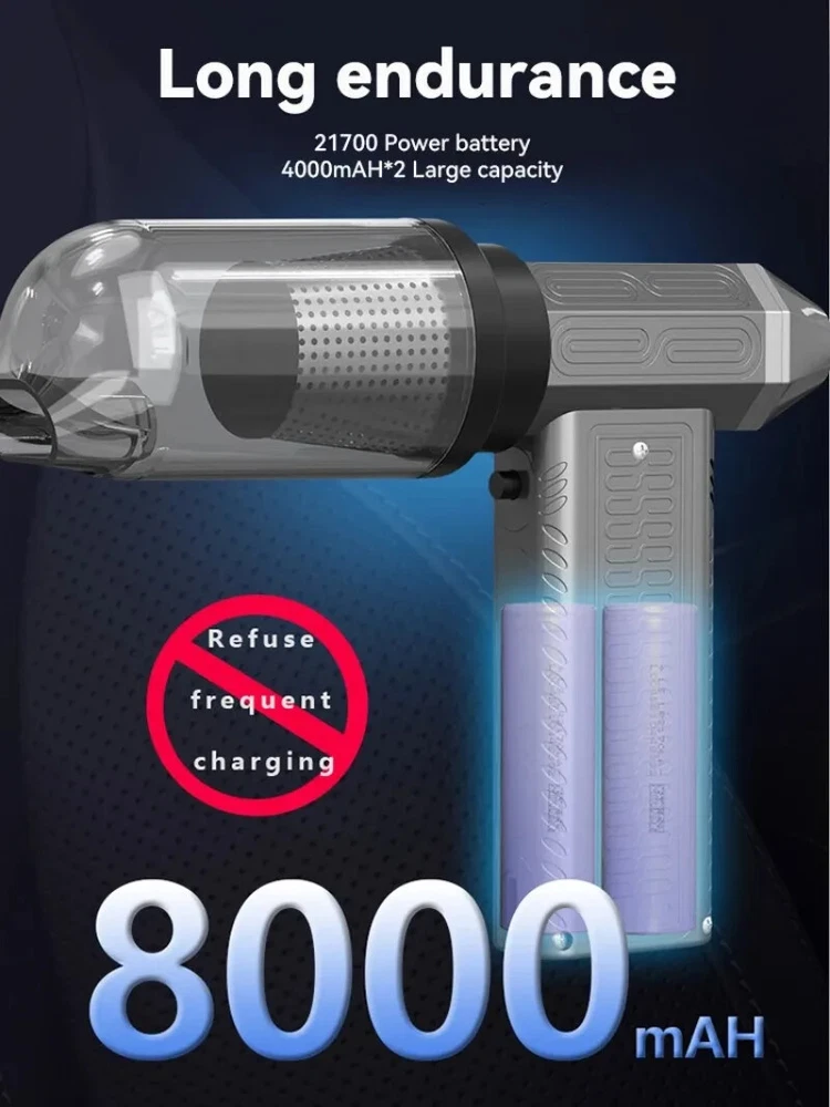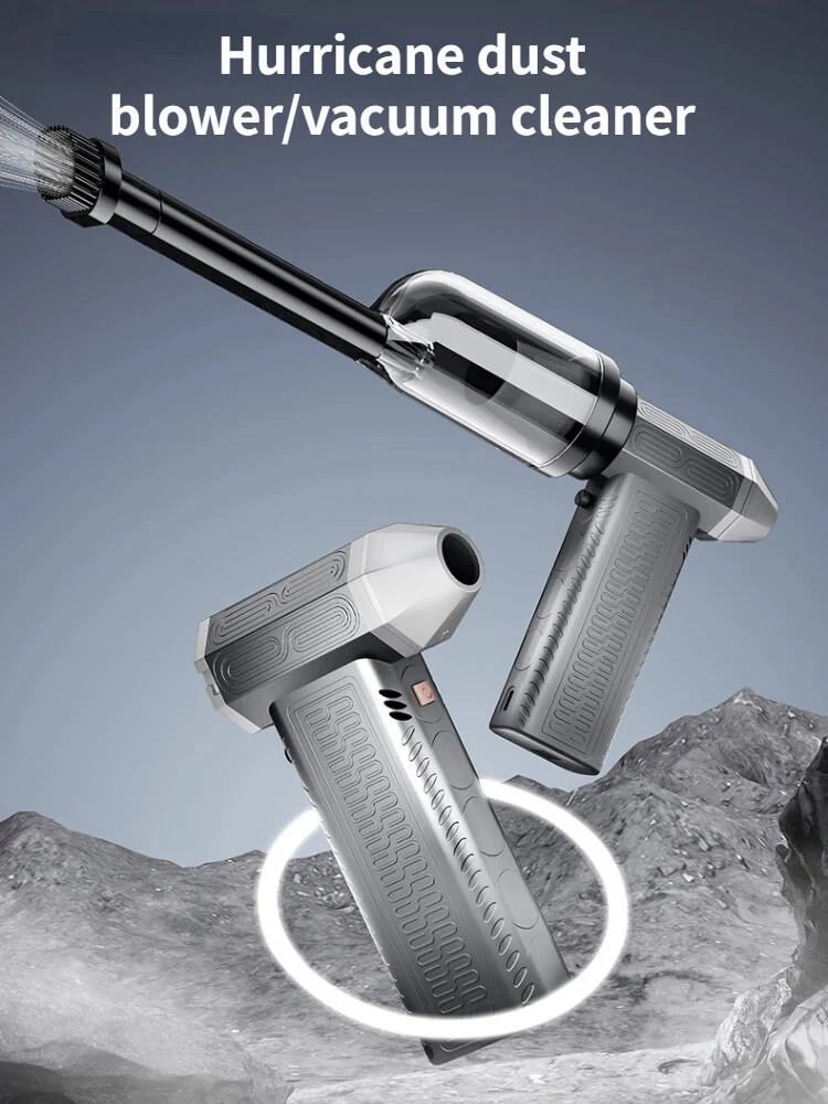 130000RPM Electric Air Duster Compressed Air Duster Speed Adjustable Turbo Fan Rechargeable Battery Cordless Jet Dry Air Blower Car vacuum cleaner Features: 1.130000 RPM turbofan, brushless motor, powerful. 2. Strong dust removal, handling a series of debris such as accumulated dust, sand, hair, etc. 3. Built in 21700 lithium battery, with long battery life and up to 1 hours of low-frequency use.(Maximum gear can last for 8 minutes) 4. Infinite speed regulation, easy to operate with one hand, two in one switch speed regulation, increasing air volume from small to large, better protecting the motor. Specification: Battery capacity: 8000mAh Built in two 21700 batteries Wind speed: 53m/h Motor power: 200W (max) Motor speed: 130000RPM Working voltage: 7.4V Charging time: 3-4 hours Wind speed gear: infinite speed regulation Package Included: Host * 1, power cord * 1, instruction manual * 1, storage bag * 1, air nozzle * 1, dust storage cover * 1, HEPA component * 1, extension rod * 1, brush head * 1 Fan control mode: button+knob, press and hold the button to start the motor, release to shut down. Rotate the knob to adjust the wind speed. Charging Indicator: The red light on the bottom is on when charging, and it goes out when fully charged. Note: Please allow 0.5-1cm error due to manual measurement. pls make sure you do not mind before you bid. Due to the difference between different monitors, the picture may not reflect the actual color of the item. Thank you!