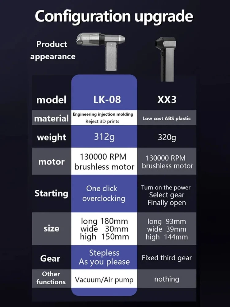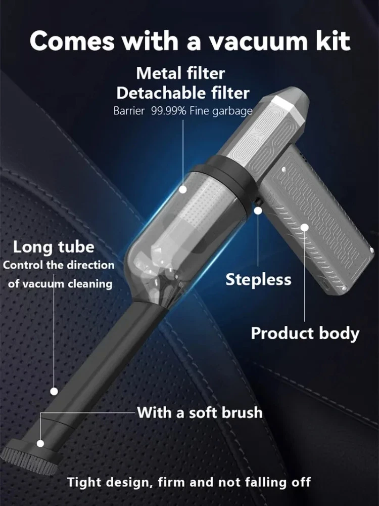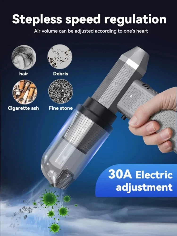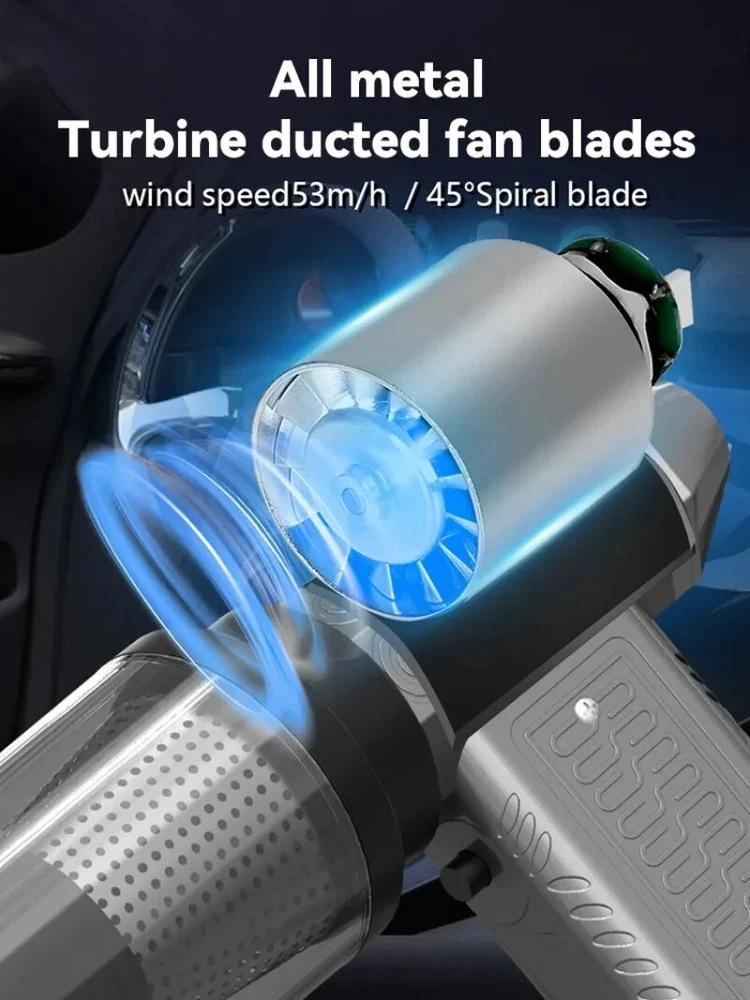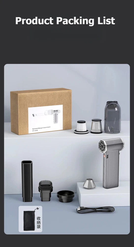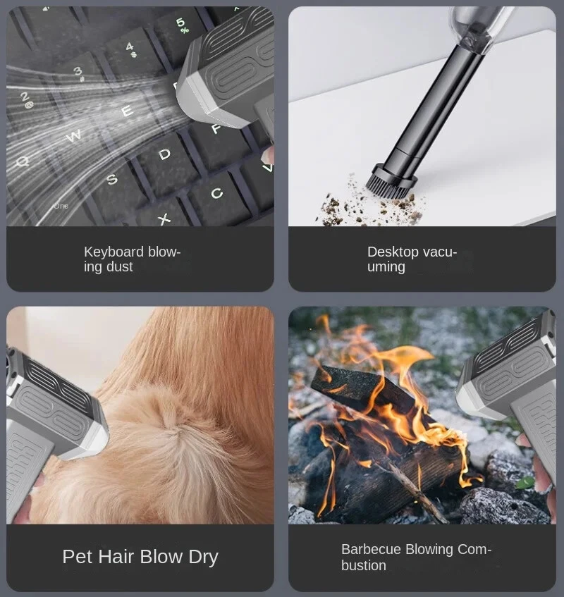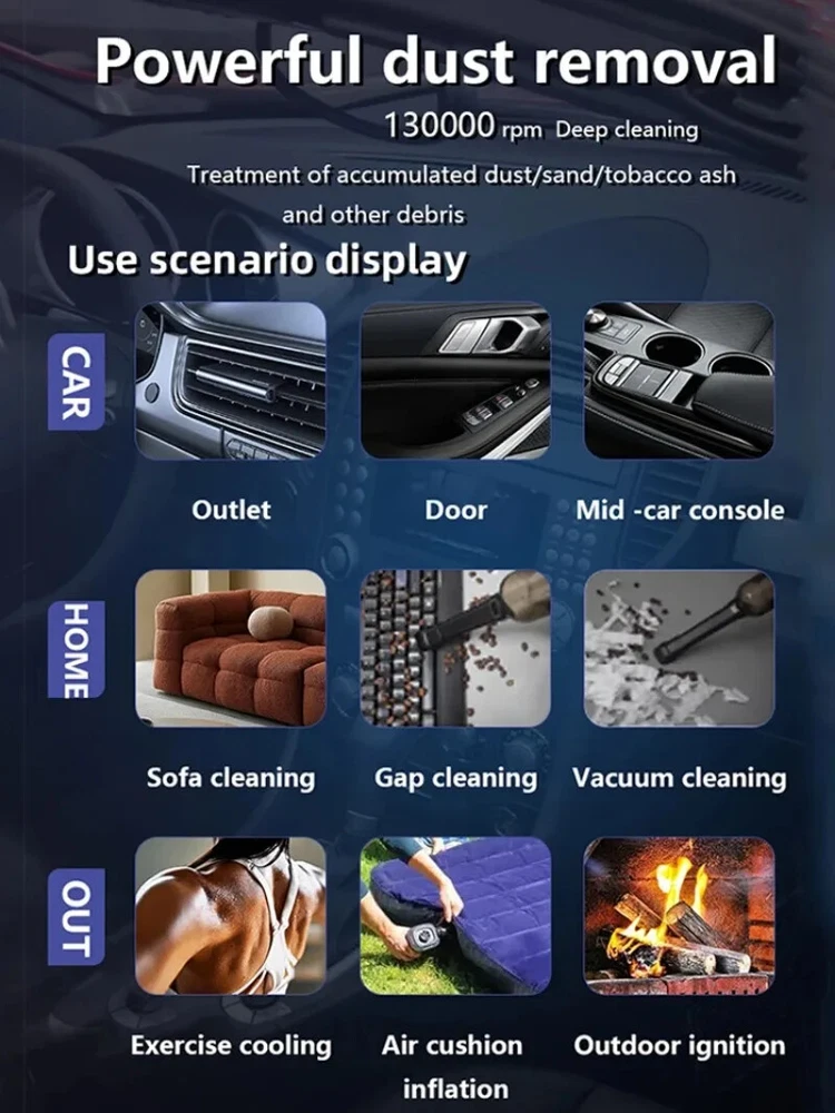 130000RPM Electric Air Duster Compressed Air Duster Speed Adjustable Turbo Fan Rechargeable Battery Cordless Jet Dry Air Blower Car vacuum cleaner Features: 1.130000 RPM turbofan, brushless motor, powerful. 2. Strong dust removal, handling a series of debris such as accumulated dust, sand, hair, etc. 3. Built in 21700 lithium battery, with long battery life and up to 1 hours of low-frequency use.(Maximum gear can last for 8 minutes) 4. Infinite speed regulation, easy to operate with one hand, two in one switch speed regulation, increasing air volume from small to large, better protecting the motor. Specification: Battery capacity: 8000mAh Built in two 21700 batteries Wind speed: 53m/h Motor power: 200W (max) Motor speed: 130000RPM Working voltage: 7.4V Charging time: 3-4 hours Wind speed gear: infinite speed regulation Package Included: Host * 1, power cord * 1, instruction manual * 1, storage bag * 1, air nozzle * 1, dust storage cover * 1, HEPA component * 1, extension rod * 1, brush head * 1 Fan control mode: button+knob, press and hold the button to start the motor, release to shut down. Rotate the knob to adjust the wind speed. Charging Indicator: The red light on the bottom is on when charging, and it goes out when fully charged. Note: Please allow 0.5-1cm error due to manual measurement. pls make sure you do not mind before you bid. Due to the difference between different monitors, the picture may not reflect the actual color of the item. Thank you!
