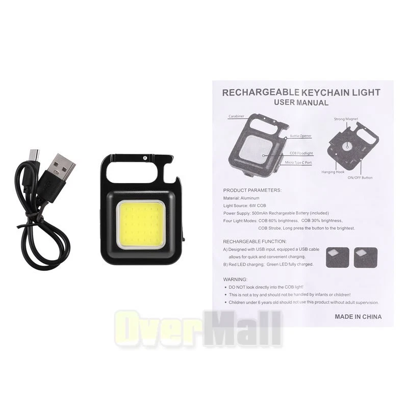 Portable Mini USB Rechargeable LED Flashlight COB Work Lamp Torch Keychain Light Mini COB Work Light Rechargeable LED Flashlight Keychain Portable Bottle Opener BEST CUSTOMER SERVICE ON OUR sale2015express EBAY STORE↓ ↓ ↓ SHIP From US Local Stock FAST & Free, 1-6 Days Arrival FREE Return, Seller Pay!! LIFETIME Money Back Guarantee LIFETIME Free Replacement Guarantee LIFETIME Warranty QUICKLY Reply within 24 Working Hours MOST orders ship within 1 business day with Tracking Number ANY PROBLEM please email us before feedback, thanks! Add our listing to Watchlist Or Add to Cart , you will get more discount!!! Feature: ✔ 3 Lighting Modes: The keychain light has 3 lighting modes, strong light, weak light and flashing mode, long press the power to turn on to super bright mode, you can adjust the lighting mode according to your usage needs. ✔ Super Bright COB Lamp Beads: The keychain light uses a powerful LED with 30 super bright COB lamp beads, which can provide up to 500 lumens of illumination, enough to illuminate your roads and small dark spaces. ✔ Portable Design: This keychain light has a small magnet on the back, which can be strongly attached to the metal, small in size, easy to carry, and has an adjustable stand and a tripod hole, which not only frees your hands when working, it can also be placed at different angles or hung in specific positions. ✔ USB Charging: The keychain light is powered by a built-in 500mAh battery, the lighting time can be up to 4 hours, and the included USB charging cable can be used with portable power devices such as computers, laptops, car chargers, wall chargers and power banks , a red light is displayed when charging, and a green light is displayed when fully charged. ✔ Widely Used: The portable keychain light has a hook and loop, which can be easily fixed on the key ring or bag, with IPx4 waterproof function and impact resistance, it can also be used as a bottle opener, it can also be used as maintenance light, work light and outdoor camping emergency light. Specification: Product name: Multifunctional keychain light Colour: Black Light color: white Material: aluminum alloy + PC plastic Voltage: 3.7-4.2V Lamp beads: COB Irradiation distance: 0-50m Waterproof: IPx4 Power: 5W Brightness: 500lm Battery life: 1-3 hours Light source: 6W 30 COB lamp beads Lighting time: 4 hours (highlight 1.5 hours) Lighting mode: 60% strong light - 30% weak light - flashing (long press to turn on super bright mode) Function: bottle opener, emergency light, work light, inspection light, magnetic suction Battery: Built-in 500mAh polymer battery Charging port: USB Type-C Product size: 61*45*27mm/2.4*1.77*1.06inch Package size: 95*55*28mm/3.74*2.17*1.10inch Package include: 1x Multifunctional Keychain Light 1x USB Charging Cable 1x Manual 1x Packing Box Payment Shipping About Feedback About us Contact us Payment 1. Paypal Accept. 2. Payment should be sent within 4 (FOUR) days auction closing. Or unpaid dispute will be filed for closing auction. Shipping 1. Fast shipping from NJ, US. 2. Shipping available time: Mon. - Fri. exclude holidays 3. The orders will be handled in 24 hours after payment got. Ship to Paypal Address ONLY. About Feedback If you are dissatisfied for any reason, please do not be quick to leave negative/neutral feedback. We work hard to make sure EVERY CUSTOMER 100% SATISFIED and resolve any problem for you and always leave positive feedback to all our customers. About us 1. Welcome to OverMall, We pride ourselves on providing the outstanding service and high qualtiy products, make our customer feel confident buying online. 2. For the most US address, we offer free standard shipping . 3. By shopping with us, you can guarantee the latest technology for the best possible price. Contact us You are welcomed to contact me for any question. I will reply your email in about 24HRS in business days.
