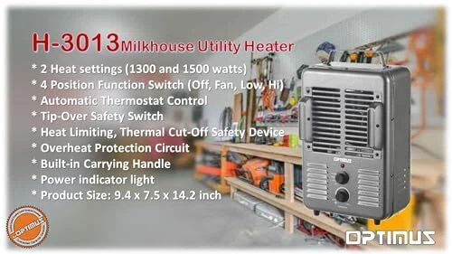 Portable Utility Heater with Thermostat * 2 Heat settings (1300 and 1500 watts) * 4 Position Function Switch (Off, Fan, Low and Hi) * Automatic Thermostat Control * Tip-Over Safety Switch * Internal Heat Limiting Thermostat with Thermal Cut-Off Safety Device * Overheat Protection Circuit * Built-in Carrying Handle * Power indicator light Portable utility heater with automatic thermostat control 4-position function switch for off, fan only, low heat, or high heat Tip-over safety switch; internal heat-limiting thermostat; overheat protection circuit Power indicator light; built-in carrying handle; heavy-gauge sheet-metal cabinet Measures approximately 10 by 8 by 14 inches; 1-year limited