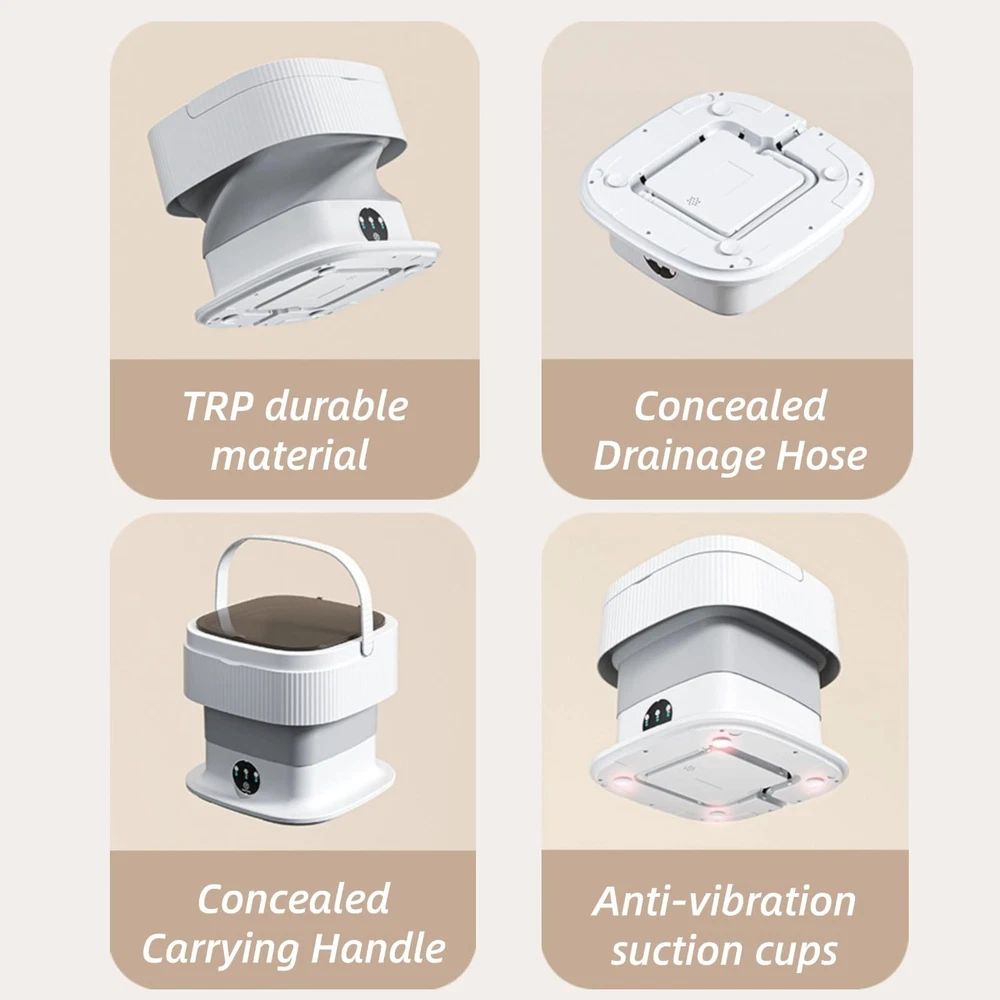 Features Portable and Compact : The foldable washing machine comes with a drainage pipe and a collapsible drainage basket , making it easy to carry . It is an ideal choice for apartments , dorms , RVs , travel , or camping . Deep Cleaning : This mini washing machine provides washing speed and achieves powerful removal effects . With blue light , it is for cleaning baby clothes , underwear , socks , and other small garments . Space Saving Foldable Design : This small portable washer ingeniously adopts a foldable design . It can be easily placed between shelves or under the bed , without taking up too much space . Adjustable 3 Modes : The mini washer has 3 speed adjustment function with three patterns from left to right . The pattern lights up to indicate the selected cleaning mode . Short press the bottom button to switch to different cleaning modes . Low Power Consumption : Portable washing machine is made of TPE and silicone materials , making it an excellent choice for personal items . It requires only 0 . 05 kWh of electricity per laundry , making it energy saving . Specification Item Type : Foldable Washing Machine Material : Plastic How to Use The first pattern indicates a 3 minute semi drying time The second pattern indicates a 10 minute standard washing time The third pattern indicates a 5 minute gentle washing time Package List 1 x Foldable Washing Machine 1 x Washing Machine Cover 2 x Basket 1 x Drain Pipe 1 x Plug ?【COMPACT AND PORTABLE】 The mini washing machine with dryer is small and compact , weighs only 4 . 6lbs , and has a folding design , which makes it easy to store and carry , and can be easily applied to homes , apartments , dormitories , RVs , hotels , and travel or camping situations where space is at a premium . ?【EFFICIENT AND POWERFUL】 This portable washer features a blue light design that provides all around hand imitation washing with precise speeds for powerful removal , and washes small clothes such as baby clothes , underwear or socks , and is equipped with a spin dryer dryer for quick drying of laundry . ?【WITH 3 WASHING MODES】 This collapsible mini washing machine with spin dryer has 3 washing modes , which are flexibly maneuvered and easily operated via timer buttons of 3 minutes (half spin) , 5 minutes (soft wash) and 10 minutes (standard wash) to ensure efficient deep cleaning . ?【LOW POWER CONCUMPTION】 The small washing machine features an energy saving design that significantly reduces power and water consumption compared to traditional ones , requiring only 0 . 05 kWh per wash , while the new design delivers quieter with virtually no noise . ?【SUPERIOR DURABILITY】 This foldable washing machine with spin dryer is made of TPE and food grade silicone material , which not only features high strength and excellent durability , but also provides unparalleled safety for your cleanliness and health .