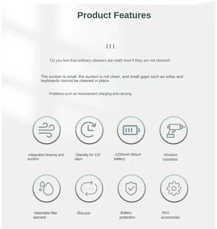 Product Introduction: 1. Material: large ABS, transparent cover PS 2. Battery capacity: 1200 mAh 3. Scope of application: car home, etc 4. Features: wireless, small size, can suck, can blow, etc 5. Accessories: charging cable, long flat mouth, brush, blow nozzle Disassembly and cleaning: 1. Rotate the dust bin counterclockwise to remove the dust bin from the fuselage 2. Take out the Hipa filter in the dust bin and pour the garbage into the trash can 3. If necessary, use a slightly wet rag or disposable paper towel to clean the dust cup. The filter can be rinsed with water, and must be thoroughly dried after washing 4. To reinstall the dust bin, put the Hipa filter into the dust bin, rotate it in the opposite direction and tighten it according to Step 1 Instructions for use: 1. Connect the charger to fully charge the battery 2. Connect the corresponding accessories according to the use occasion (accessories installation and use) 3. Turn on the power switch of the vacuum cleaner to start working (charging: red light state, full: green light state, working: green light state) Note: 1. Do not remove, repair or modify this product unless authorized repair personnel 2. Do not cover the air intake or exhaust when operating this product, otherwise the product may be deformed or caught on fire due to overheating 3. Do not inhale combustibles, such as cigarette butts, when using this product 4. Please place the product properly and keep it away from children5. Make sure that the switch of the charging cable is turned off. It is strictly prohibited to use the charging cable while charging