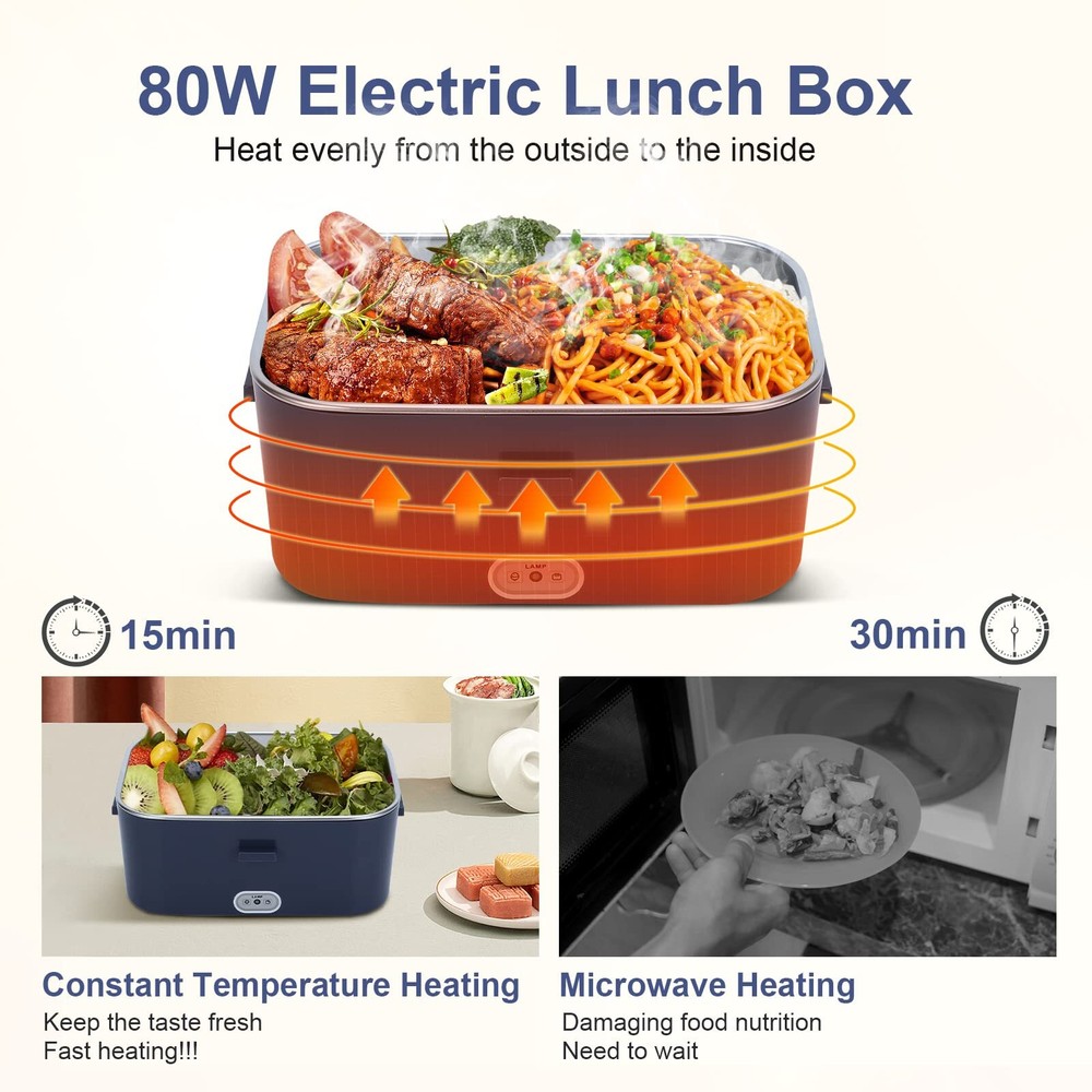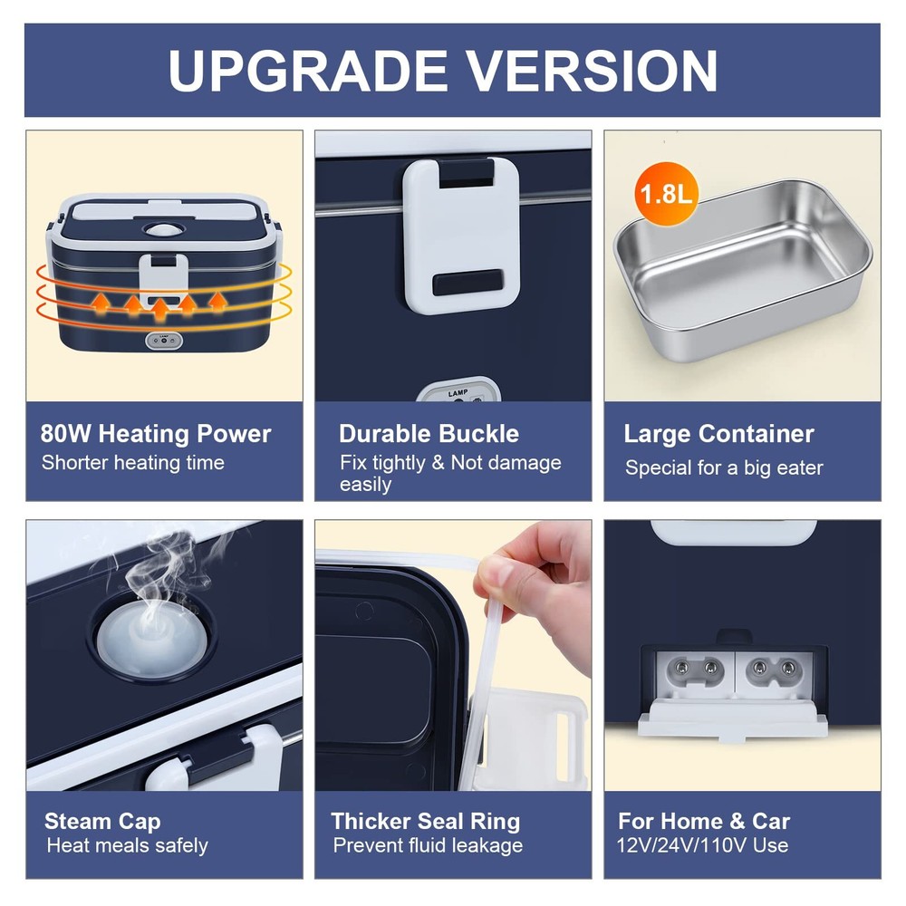 lunch box food electric warmer heated car portable fast heater 3 In 1 Electric lunch box: Do you often stand in line to heat up your meals or eat fast food? Come here! Our upgraded electric lunch box will solve this problem and let you enjoy hot meals anytime, anywhere! This electric heated lunch box supports 110V-220V home/office + 12V car and 24V truck use. Perfect for truck drivers, workers, office workers, etc. Make you enjoy hot and healthy meals 100W Faster heating: To shorten the heating time, we specially use the latest design of PTC thermostatic heating. Heat up your lunch as fast as possible, in just 15-35 minutes, you can have fresh and warm home-cooked food in the shortest time at office. This electric food heating lunch box is designed with circulating heat to keep your food nutritious and fresh. Keeping you eating healthy 1.8L+0.45L large capacity: The previous 1.5L capacity food warmer lunch box was not enough to meet the needs of some adults. That's why we designed this 1.8L capacity specifically for adult men or people who eat larger amounts of food. In addition, we offer a 0.45L plastic compartment where you can place different kinds of food individually. They are easy to clean and dishwasher safe Double layer leak-proof design: Sealing and leak-proof are the key points of our good food heater lunch box. We designed four side snaps, plus a built-in rubber seal, you no longer have to worry about soup leaking during transport, or a mess in the car.Comes with an insulated carrying bag to protect the box in heavy rain and dust Perfect for you: You will be surprised to find a small compartment on the lid to store your spoon and fork, you can also use it as a phone stand to enjoy your food while watching a movie. If you receive our electric lunch box food warmer is broken and there is a quality problem after using it for a period of time, please contact us and we will provide a satisfactory solution for you Heating Time: Summer: 25-30 minutes Shipping We offer FREE shipping on all orders! We ship within Three business days of payment, usually sooner. We use a selection of shipping services such as UPS, FedEx, USPS etc. We only ship to the lower 48 states, no APO/FPO addresses or PO Boxes allowed. Local pickups and combined shipping options are not provided at this time. Return You can return a product for up to 30 days from the date you purchased it. Any product you return must be in the same condition you received it and in the original packaging. Please keep the receipt. Payment We accept payment by any of the following methods: PayPal Please pay as soon as possible after winning an auction, as that will allow us to post your item to you sooner! Feedback Customer satisfaction is very important to us. If you have any problem with your order, please contact us and we will do our best to make you satisfied. Contact Us If you have any queries, please contact us via ebay. We usually respond within 24 hours on weekdays. Please visit our eBay store to check out other items for sale! Thank you for shopping at our store.