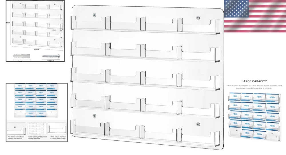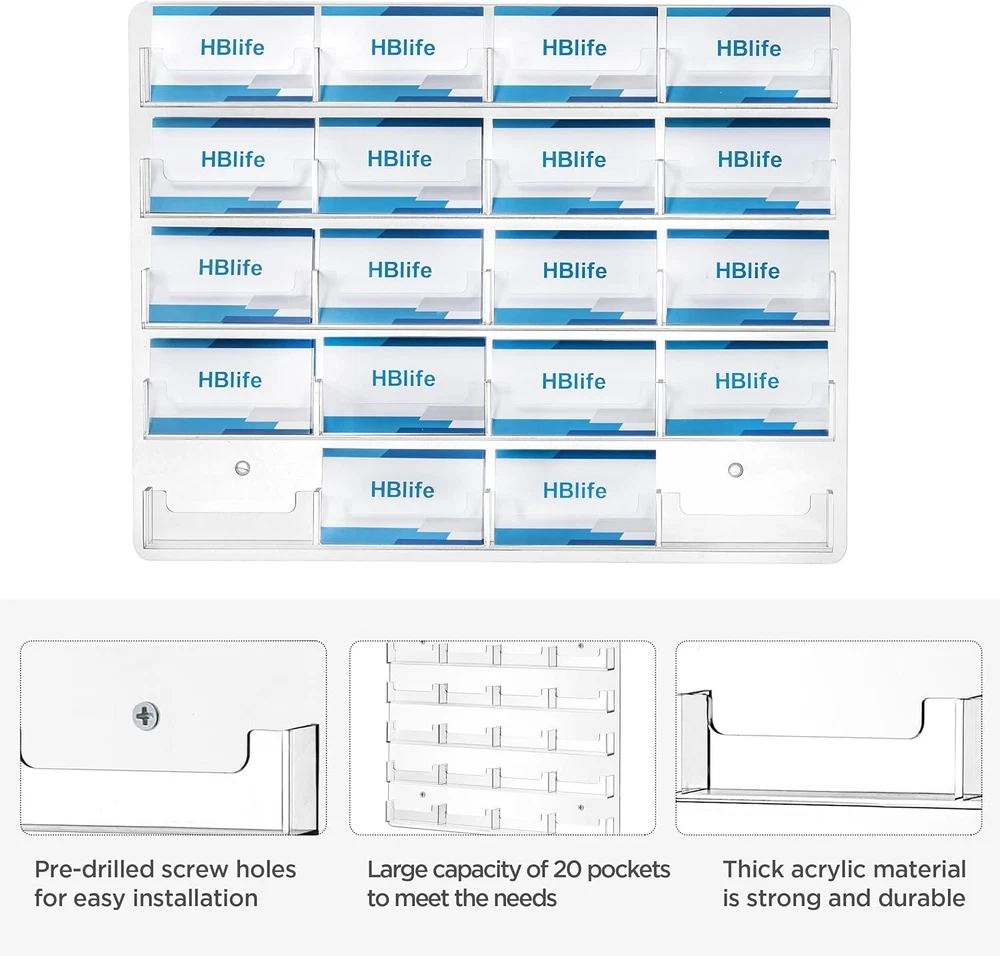 Is Customizable: No gtin13: Does not apply Room Type: Office Assembly Required: Yes Type: Business Card Holder Included Components: Drill Bits Product Dimensions: 1.57"d X 14.96"w X 16.54"h Color: 1 Pack Size: 20 Pockets Mounting Type: Wall Mount Item Weight: 2.01 Pounds Shelf Type: Cubby Shelf Recommended Uses For Product: Office Style: Hanging Brand: Unbranded Number Of Shelves: 20 Material: Acrylic Estado del artículo: Nuevo UPC: Does not apply Indoor/outdoor Usage: Indoor