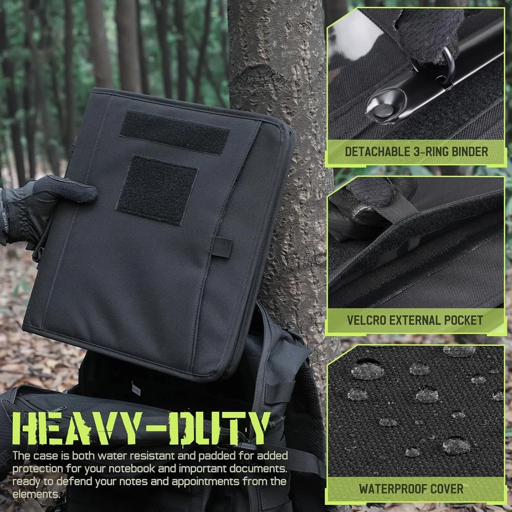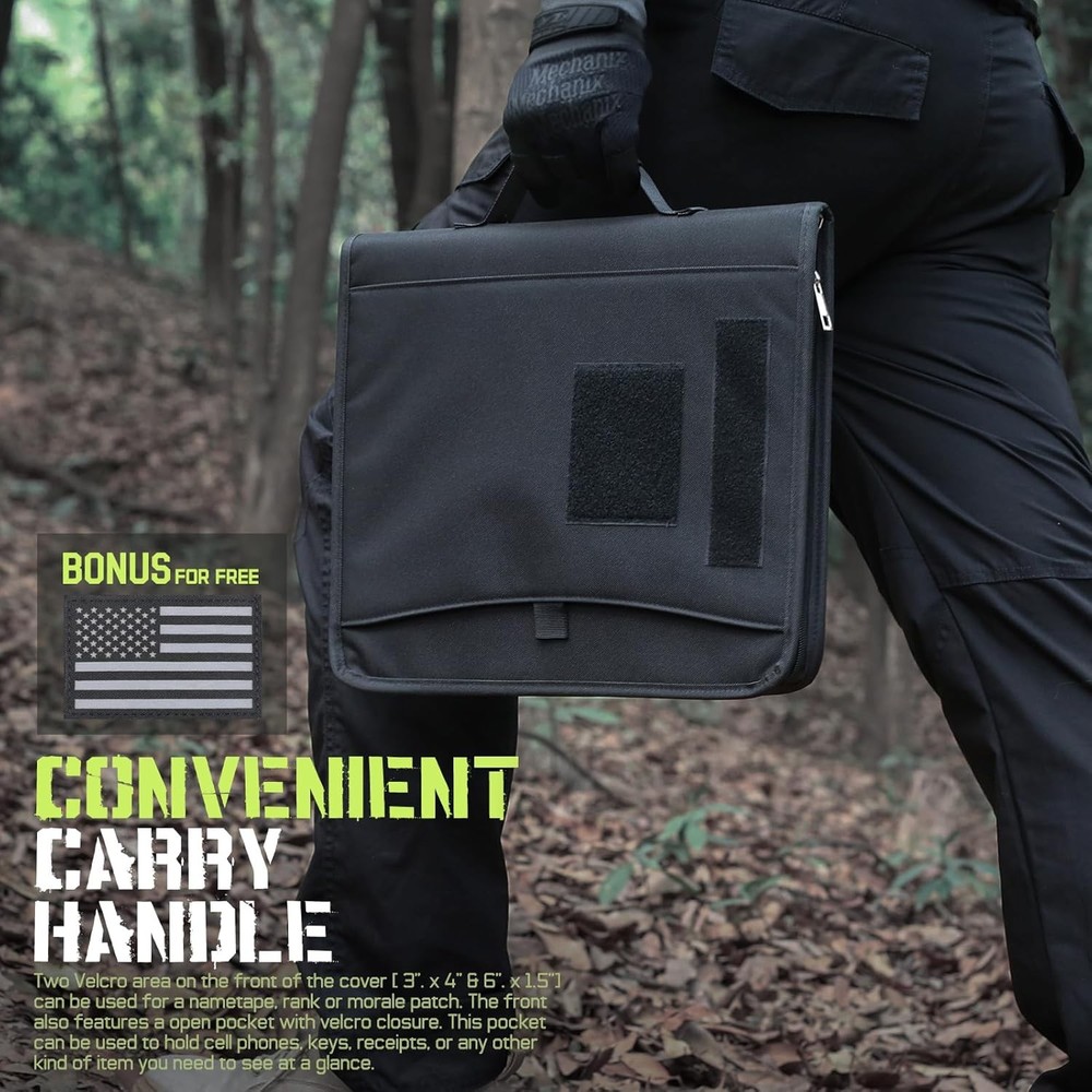 About this item Easy To Carry : Larger than A4 size (12 x 13.6 x 1.2 inches), Padfolio ring binder built with multi-functional pockets and a strong handle. Easy to carry all your necessary items, like a portfolio handbag without any mess, ideal for outdoor enthusiasts, field work, office professionals, and college. All-in-One Storage : Portfolio organizer offers ample storage space for essentials. Hoop-N-Loop-type exterior pocket for easy access to loose papers. Multiple interior pockets, card slots, and pen loops to keep pens, driver's license, cards, iPad, notepad, and cash neatly organized. Customize & Expand Papers : The planner binder comes with a detachable 3-ring metal binder, easily customize and expand. Refill 3–ring loose-leaf paper, like budget /calendar planner, blank / lined /grids paper, or as a notepad, file folder organizer and clear game card binder. Secure & Durable Protection : Zip 3-ring binder crafted from durable 1000D fabric tactical notebook cover offers rugged durability and 2 zipper closures, safeguarding your important documents from rain and dust damage. Personalized Decoration (Include a US flag patch) : Binder notebook with patches to reflect your personality. Express your uniqueness by decorating the binder according to your preferences, and embrace the spirit of adventure and patriotism. Ready-to-Gift Notebook (includes 25 sheets of A4 letter paper) : Portable handle, zipper closure, multifunctional pocket, detachable binder - carefully designed for personalized paper configuration. A truly thoughtful present that helps organize thoughts and safeguard every story. Color: Black Material: 1000D Fabric, Polyester Capacity: 1.98 Pounds Brand: Sheet Size: A4 letter paper(8.2" x 11" // 20.8 x 28.3 cm) Inches