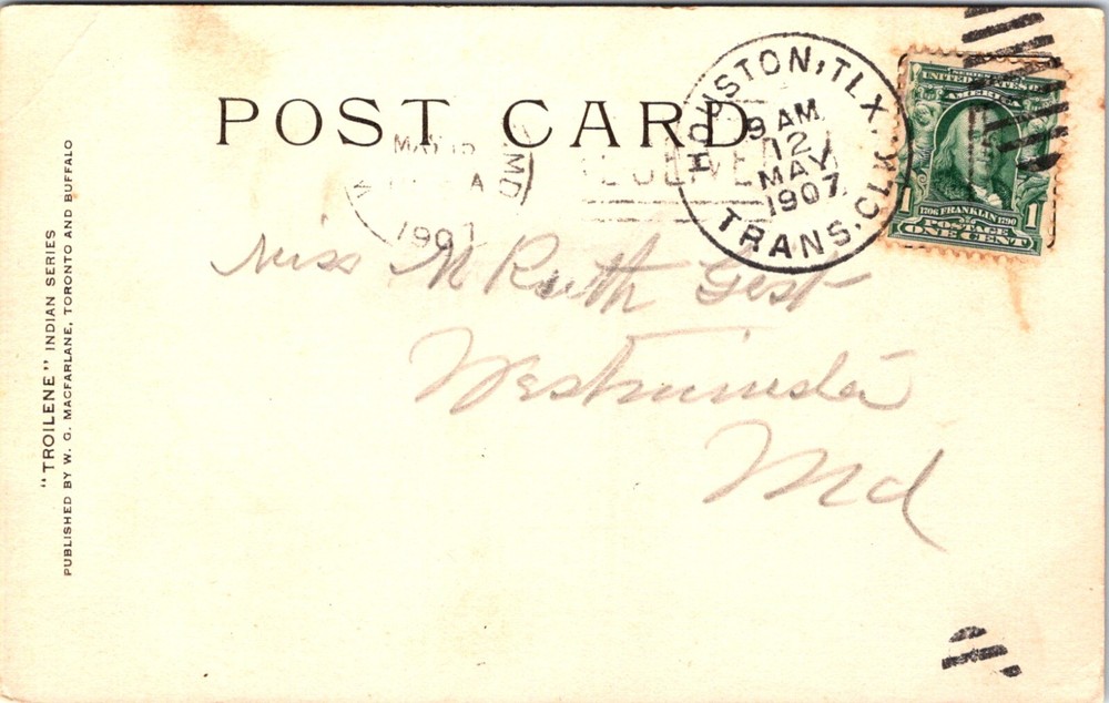 Portrait Sioux Chief Hollow Horn Bear Traditional Clothing 1907 Postcard 24187 Front of Postcard: The image shows a person wearing a traditional Native American headdress adorned with feathers and colorful ribbons. The headdress features long, white feathers with black tips, and the ribbons are in various colors including red, blue, yellow, and white. The person is also wearing a garment with a red and blue color scheme, decorated with yellow and white accents. The text at the bottom of the image reads "SIOUX CHIEF HOLLOW HORN BEAR." This image is interesting and relevant as it depicts traditional Native American attire, specifically that of a Sioux chief, which is significant in understanding the cultural heritage and history of the Sioux people. Back of Postcard: The image shows the back of an old postcard. The postcard is addressed to "Miss M. Ruth Gest" in "Westminster, Md." There is a green one-cent United States postage stamp featuring Benjamin Franklin in the upper right corner. The stamp is postmarked with a circular stamp that reads "BOSTON, MASS. TRANS. CLK. MAY 12, 1907, 9 AM." There is another postmark partially visible that reads "MAY 13, 1907, MD." The left side of the postcard has the text "TROILENE 'INDIAN SERIES' PUBLISHED BY W. G. MACFARLANE, TORONTO AND BUFFALO." This postcard offers a fascinating glimpse into historical postal communication and the style of early 20th-century postcards.