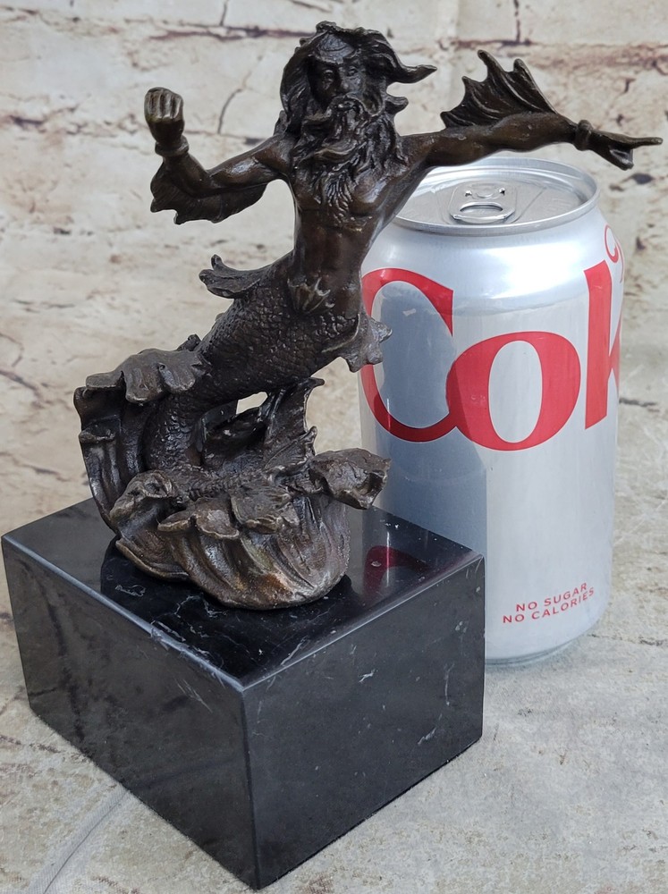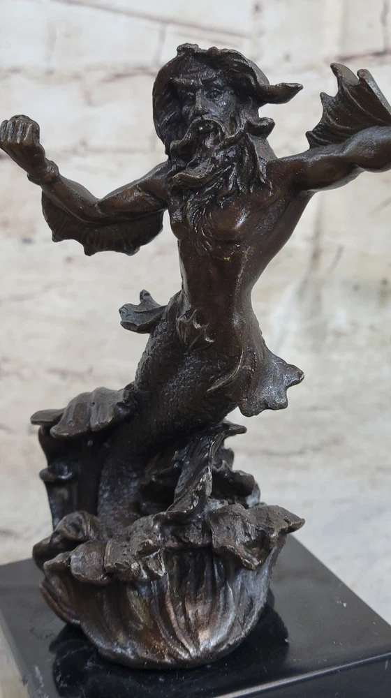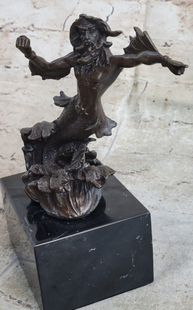 Signed Original Poseidon God of Sea Bronze Marble Base Figurine Home Decor Deal Signed Original Poseidon God of Sea Bronze Marble Base Figurine Home Decor Deal Condition : This sculpture is in perfect condition. Bronze Dimensions with Marble Base: Height 7" X Width 4" Marble Dimensions:4" X 3" Height without base:6" Weight:4 LBS Inventory:34XNCH0182243 This sculpture portrays Poseidon, the mighty god of the sea, storms, and earthquakes in Greek mythology, as a powerful merman wielding his iconic trident. Known for his tumultuous temperament and control over the oceans, Poseidon held significant importance in ancient Greek and Roman cultures, revered as a protector of cities and sailors alike. His complex character was depicted in various aspects, from benevolently creating new islands to wrathfully causing chaos and destruction. Crafted using the esteemed "Lost Wax Method," this sculpture exemplifies meticulous attention to detail, capturing the dynamic energy and strength of Poseidon as he brandishes his trident. The brown patina enhances the sculpture's lifelike appearance, while the marble base adds stability and elegance to its presentation. Signed by the artist Nick, this piece pays homage to the enduring legacy of Poseidon and his mythological significance. With its portrayal of Poseidon as a merman, this sculpture offers a unique interpretation of the deity, blending elements of human and sea creature to convey his divine power and authority over the maritime realm. Whether displayed as a centerpiece in a collection or as a standalone piece of art, it serves as a reminder of the awe-inspiring forces of nature and the enduring mythological narratives that continue to captivate our imagination. Signed Poseidon God of Sea Bronze Bookend Book End Sculpture Marble Base Statue XNCH-018 Video will open in a new window Using the eBay App? Paste link into a browser window: [isdntekvideo] Shipping Terms : Most of our items are shipped via USPS (United States Postal Service) mail or UPS. Most orders are shipped within 24-48 hours of purchase. Please be aware that not all items are available for USPS shipping due to size and weight. We do ship to Hawaii, Alaska, Canada, Puerto Rico, APO/AE, and U.S. Virgin Islands, however, an additional charge may be required. Please contact us before making any purchases in these areas. For Non-USA customers, you may be responsible for all duty, tax, brokerage fees that may be due upon delivery (shipping costs cover freight charges only). We also ship internationally. Please refer to the "Shipping and Handling" chart for the rates for each area. Payment : We accept just about any form of payment. PayPal, Master Card, Visa or American Express credit cards. Money orders, cashiers checks, and even personal or business checks. For governmental institutions, we will also accept a purchase order. Please understand that for personal or business checks we have to wait for the check to clear (usually 7 days) before shipping. Condition : New Detailed Hand Crafted Hot Cast Bronze Satisfaction Guaranteed. This is Stock Photo, Slight Color Variation!! Listing and template services provided by inkFrog