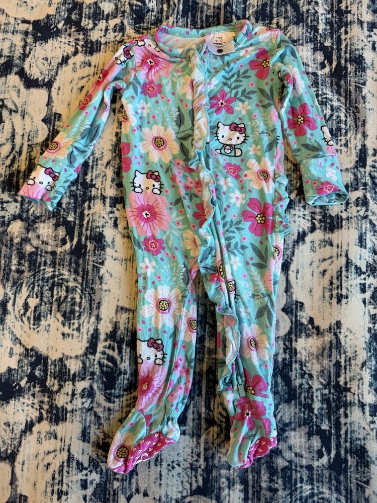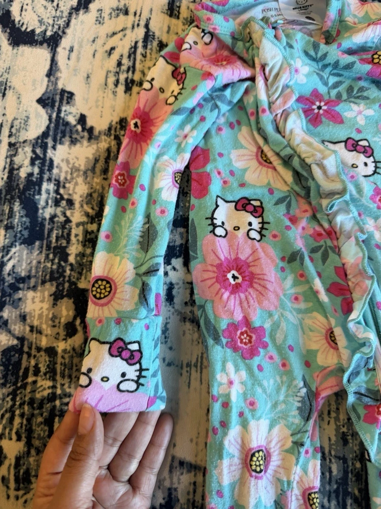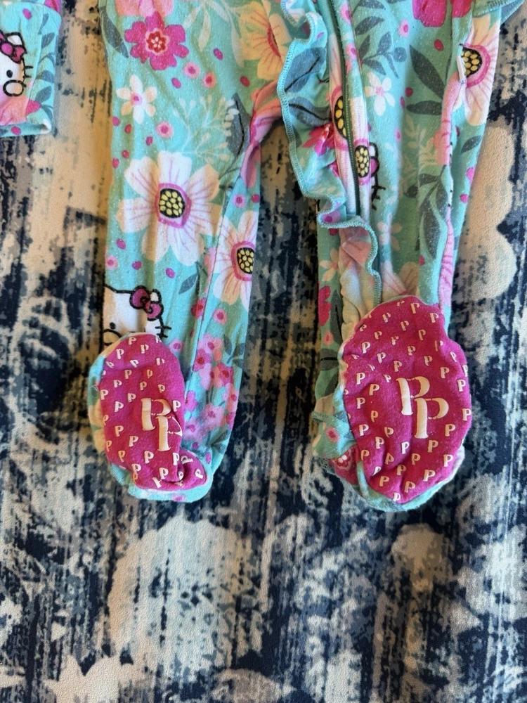 The Posh Peanut X Sanrio Hello Kitty Turquoise Pink Floral Ruffled Bamboo One Piece is a stylish and colorful outfit for babies, featuring a floral pattern with Hello Kitty character design. Made from machine washable bamboo material, this one-piece footie is perfect for casual occasions in all seasons. The ruffled accents add a touch of cuteness, while the long sleeves and zip closure provide comfort and convenience. This versatile outfit is a must-have for any little one who loves Hello Kitty and flowers. •Preloved in Good Condition. Normal signs of wash wear. Normal signs of ware on the zippers. Still in good shape. •Super Cute. •Pet Free/Smoke Free Home •Fast Shipping
