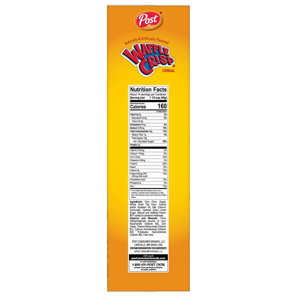 Post Waffle Crisp Breakfast Cereal, Sweetened Waffle Shaped Cereal, 20 OZ Box Description Waffle Crisp Cereal packs nostalgia and big flavor into your cereal bowl. A fan favorite since it launched in 1996, this cereal is back after a brief hiatus from 2018 to 2021. This cereal features square cereal pieces shaped like mini waffles with the sweet, irresistible flavor of homemade waffles and syrup in every bite. Grab a box of this fan-favorite breakfast cereal and pour yourself a bowl with your favorite type of milk for a delicious start to your day. This waffle-shaped cereal is also delicious by the handful as an after- school snack or anytime you're craving the sweetness of waffles. Get creative by using Waffle Crisp as a topping for snacks and desserts or use it in your yummy homemade treat recipes. No matter how you enjoy it, you'll want to keep plenty of Waffle Crisp cereal on hand in your pantry to satisfy all your waffle cravings. Features: One 20 oz box of Waffle Crisp Cereal Fan-favorite waffle-inspired cereal is back Start your day with waffle-shaped square cereal pieces packed with the flavor of homemade waffles and syrup Large box keeps you stocked for enjoying as part of breakfast or for snacks and recipes Sweetened cereal is delicious by the handful or with your favorite milk at breakfast time Product Details: Brand: Post Flavor: Waffle Crisp Age Range (Description): Adult Item Form: Shaped Specialty: -- Other --, Post Package Dimensions : 13.11 x 7.76 x 3.98 inches; 1.52 Pounds Item model number : 38899 UPC : Manufacturer : Post Consumer Brands Country of Origin : USA Handling We will ship all orders within 3 business days of payment. Delivery We do not ship outside of the Continental US. Feedback We take our reputation seriously, we buy and sell online, so we understand the value of trust. If you are unsatisfied with your order, please contact us and we will work with you to resolve it to your satisfaction.