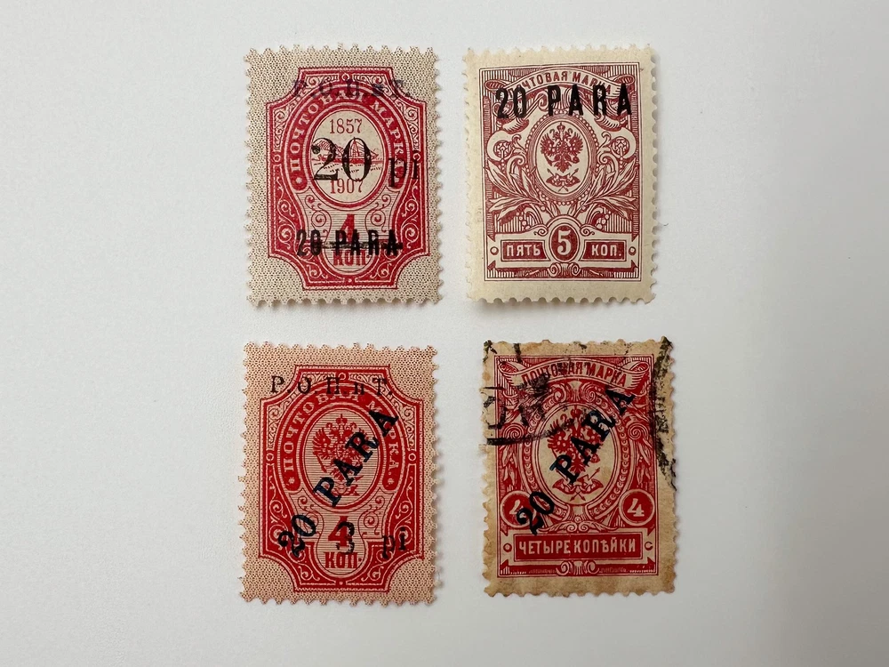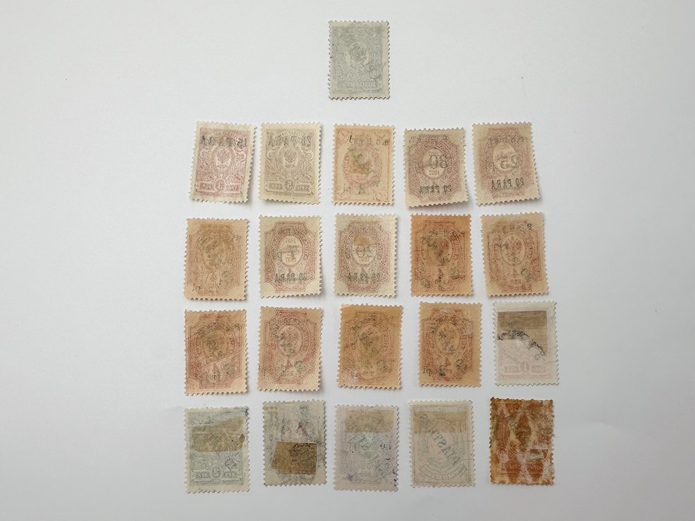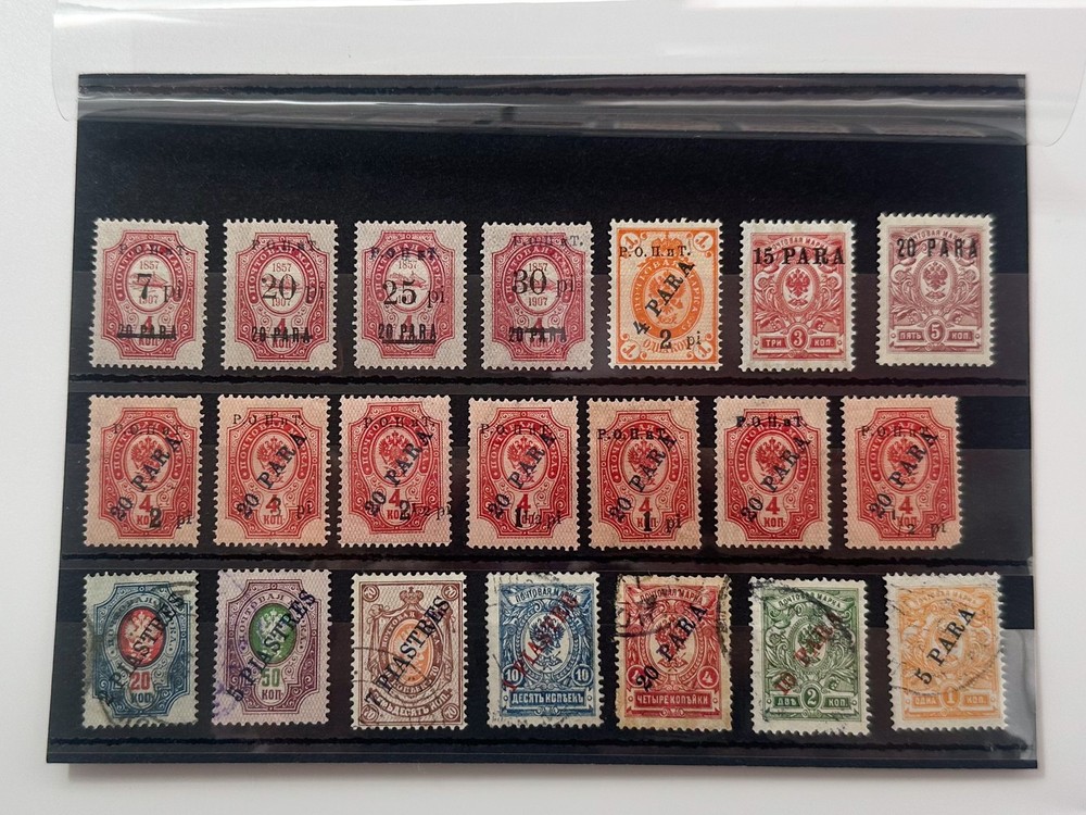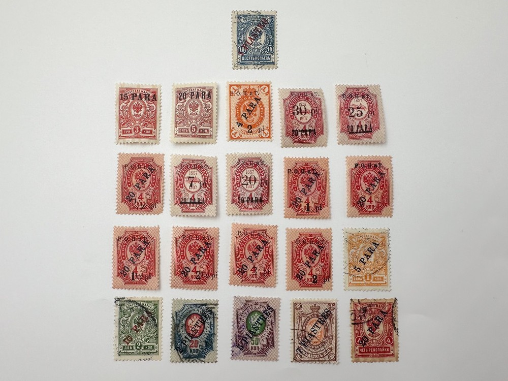Various issues from the Russian Empire and the Russian Civil War period (circa 1908-1922). Many of them are classic imperial stamps of Tsarist Russia, featuring the double-headed Tsarist eagle and denominations in kopecks (Russian: KOP) or rubles (Russian: RUB). - Most of the stamps (red, blue, green) are standard issues of the Russian Empire from 1908 to 1912. The face value varies from 1 kopeck to higher denominations in rubles. - Some stamps have additional overprints, such as "20 PARA". These overprints indicate that the stamps were used in Russian post offices in the Ottoman Empire (Levant) or were local reprints from times of civil war or military intervention in various regions, including Estonia (Revel). • All stamps are original - photos are part of the description. • I offer combined shipping when you purchase 2 or more items. • Don't hesitate to message me with any questions. Thank you for your interest - check out other lots in the store for more philatelic treasures!