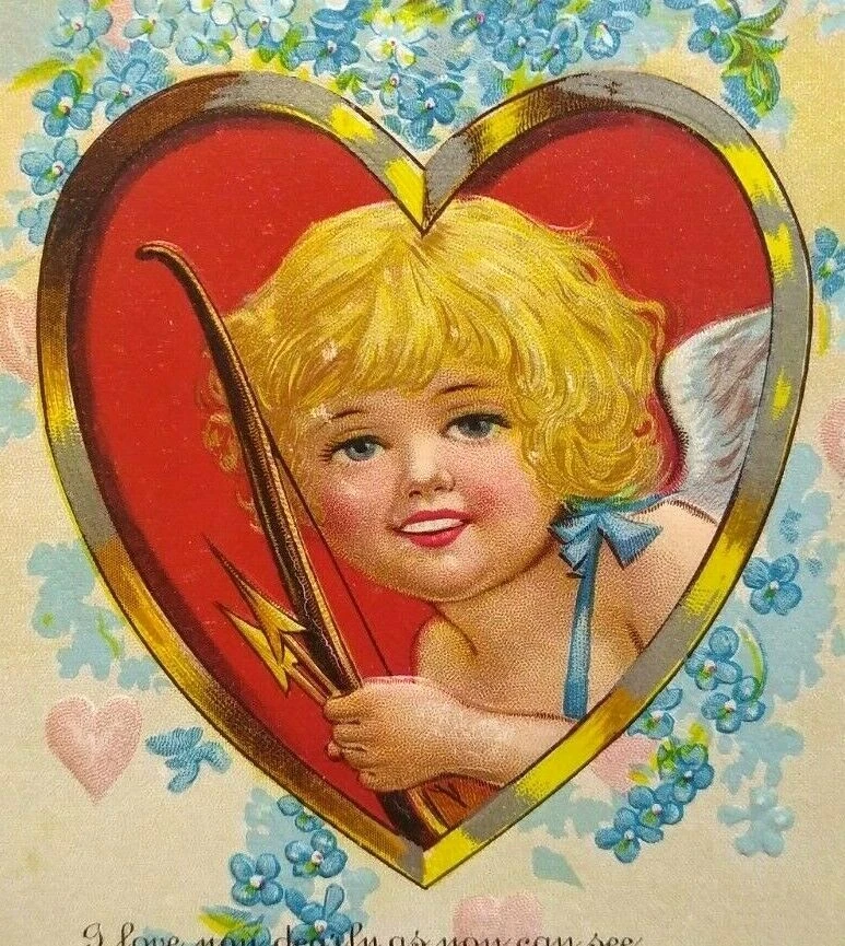 Postal de San Valentín Cara Grande Cupido Ángel Arco y Flecha Serie Nº 1 Repujado
