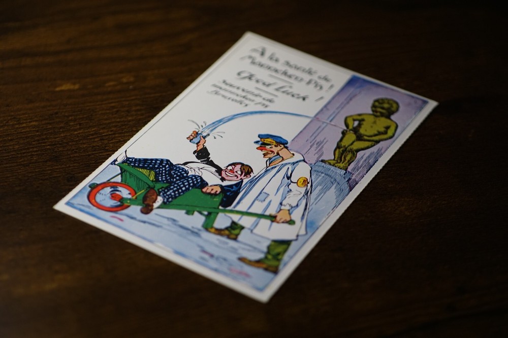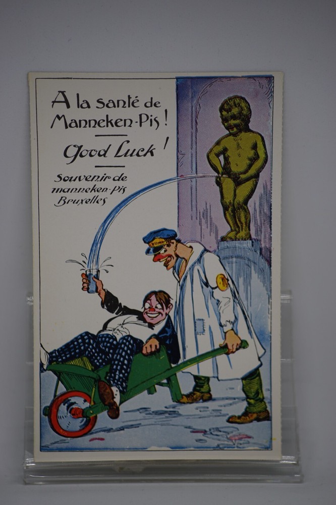 Postcard Belgium Comic Art Manneken-Pis Brussels Drunk Attendant Pissing Statue " A la santé de Manneken Pis! Good Luck! " One of a series of comic postcards on the subject of the Manneken-Pis statue in Brussels, early 20th century. Souvenir de Manneken-Pis Bruxelles Series No 10 Unposted. Good vintage condition. No visible damage to any of the edges. All corners slightly bent. Dirt spots, discoloration, creasing, scratches, missing paint and stains marks may be visible on single or both sides of the postcard. Good condition for its age. Please look at the photos for condition details. Additional details : This postcard is quite far from what we know as English humour, marked by fine irony. What do we mean by saucy seaside postcards? The name was coined for cards featuring risqué images and innuendo. These often include images of figures scantily clad and in precarious positions. Many of these designs would not be deemed appropriate today and even at the time, as we will discover, people questioned their impact on the morality of their audience. Pedro, Fitzpatrick, Chas, Quip, L.B. Martin, Ajw, Trow, Donald McGill were all an English graphic artists for seaside, risqué, comic satire, humour whose names has become synonymous with the genre of saucy postcards, particularly associated with the seaside (though they were sold throughout the UK). This cards mostly featured an array of attractive young women, fat old ladies, drunken middle-aged men, honeymoon couples and vicars. Many artists behind the designs were influenced by the one who has been called 'the king of the saucy postcard', Donald Fraser Gould McGill (28 January 1875 - 13 October 1962) 'Saucy Postcards' are often collected and appreciated for artistic skill, its power of social observation and earthy sense of humour. Even at the height of fame top artists only earned three guineas a design, but by the 2000s original artwork could fetch thousands of pounds. Keywords: Artist drawn illustration ; Edwardian ; Victorian ; Antique ; Early colour ; Double entendre ; Humorous ; Amusing ; Entertaining ; Innuendo ; Toilet humour ; Dirty jokes ; Rude joke ; Cheeky ; Funny situations ; Novelty ; Big boobs ; Buxom ; Plump ; Thicc ; Busty ; R andy ; Bawdy ; Foreplay ; Courting ; Pretty girl ; Sexy lady ; Sex ; Nude ; Nudes ; Nudist club ; Naturist club ; Naked women ; Naked man ; Naked couple ; Topless ; Nylons ; Stockings ; Love ; Romance ; Wedding ; Marriage ; Wife ; Husband ; Hubby ; Breezybums ; Koolbums ; Fabric ; Cloth ; Rag ; Towel Roller ; Blind garden fence ; Neighbour ; On bed ; On spoon ; Erectile dysfunction ; Bikini ; Holiday ; Beach ; Bathing beauty ; Mouse trap ; Hole ; Plumber ; Engineer ; Deckchair ; Pub Inn ; Boomers ; Bronze statue ; Fountain ; Foldout ; Brussels ; Le Petit Homme ; Qui Pisse ; Burxelles Menneke Pis ; Urinal ; Urinating ; Peeing ; Pissing ; Little boy ; Baby ; Penis ; Symbol ; City ; Umbrella ; Car ; Ladder ; Tourists ; Lager